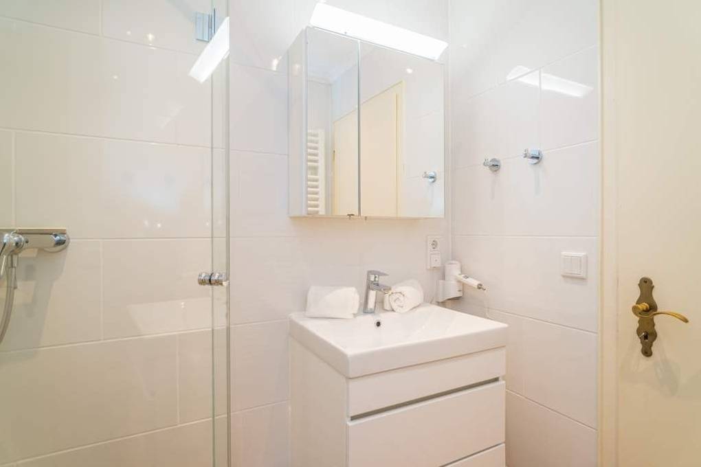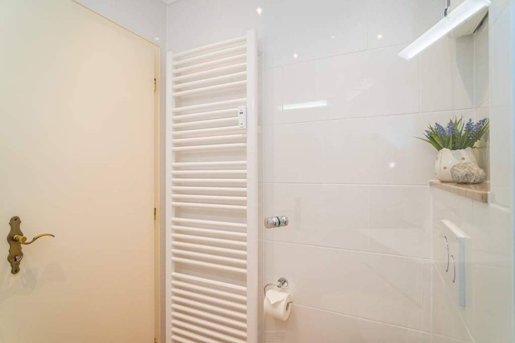 Das Badezimmer ist mit einer Dusche, einem Waschtisch, einem WC und einem Fön.