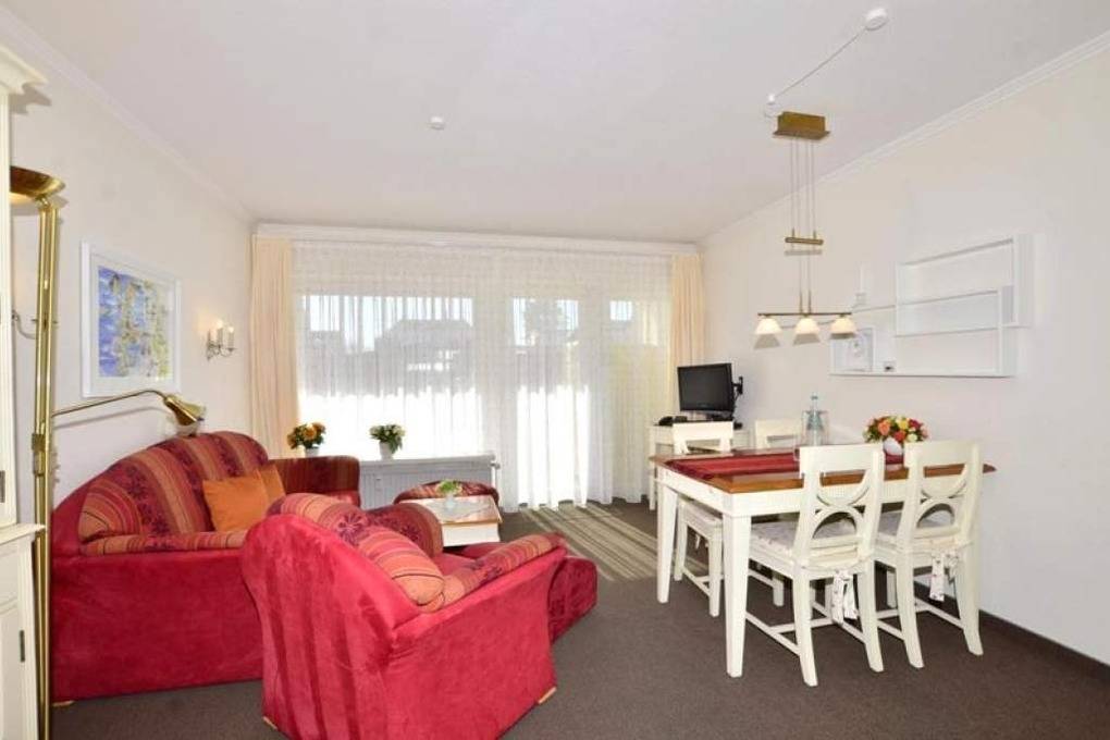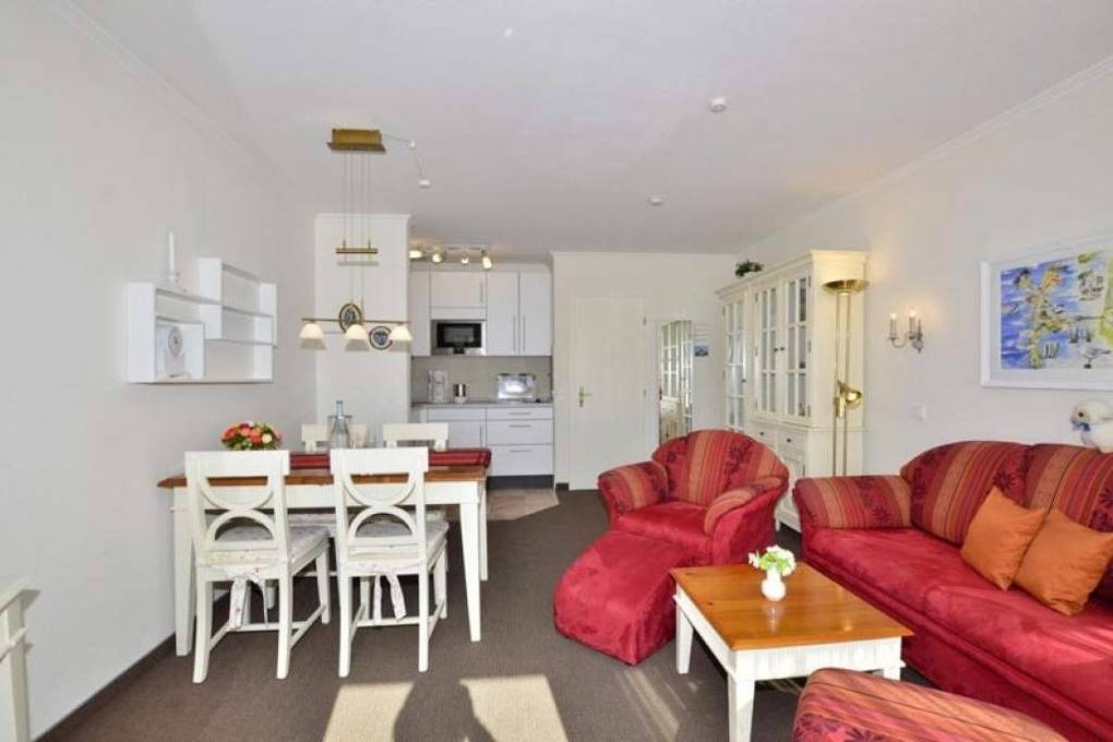 2-Zimmer-Nichtraucher-Ferienwohnung ca. 48 qm im Parterre zur Südseite mit Südterrasse (mit Strandkorb, Balkonmöbeln und Auflagen) für max. 4 Personen.