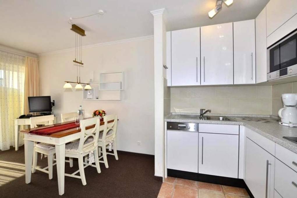 Die Küchenzeile hat einen Geschirrspüler, eine Mikrowelle, ein Ceranfeld mit 4 Kochfeldern, einen Kühlschrank. Kaffeemaschine, Wasserkocher und Toaster gehören zur Grundausstattung.