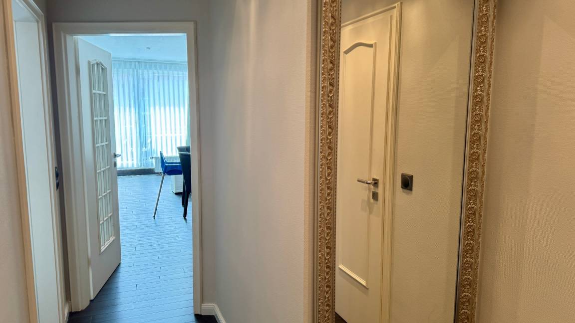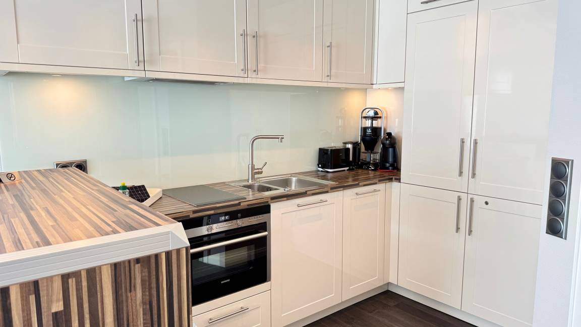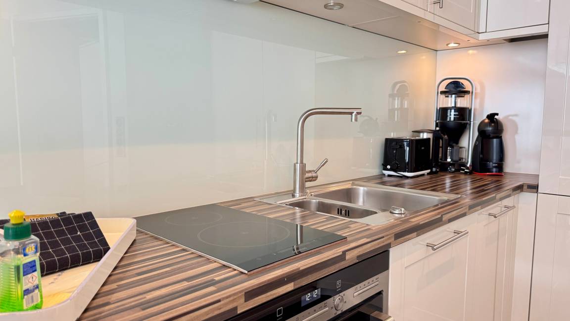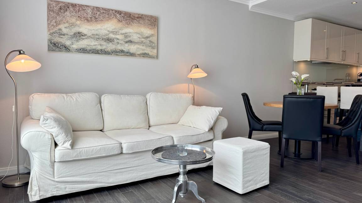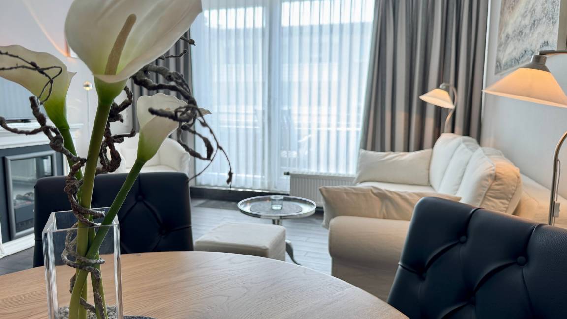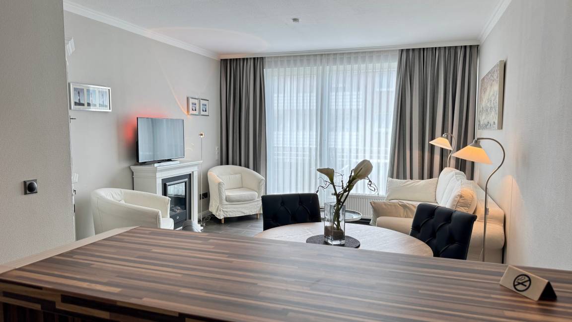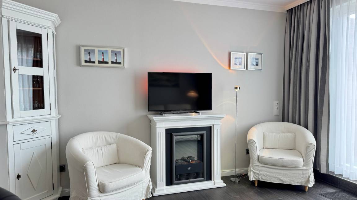 Das Appartement für maximal zwei Personen verfügt über ein großzügiges Wohnzimmer mit Essecke. Die offene Wohnküche ist durch einen verschiebbaren Frühstückstresen optisch abgeteilt. Neben einem modernen Touch-Control-Induktions-Kochfeld und einem kompakten Kombibackofen gehört ein superleiser Geschirrspüler zu ihrer Grundausstattung. Sowohl im Wohnzimmer, in dem ein Elektrokamin in der stürmischen Jahreszeit für Wohlbehagen sorgt, als auch im Schlafzimmer befindet sich jeweils ein LCD-Fernseher. Internet ist via WLAN (ohne Gewähr) vorhanden. Das Doppelbett entspricht ebenso der gängigen Comforthöhe wie die Toilette im Bad. Die großzügige Vollglasdusche ist dort der optische Blickfang, das Touch-Control-Wandradio einer der vielfältigen technischen Raffinessen im Appartement. Probieren Sie es aus - Sie werden sich verlieben.