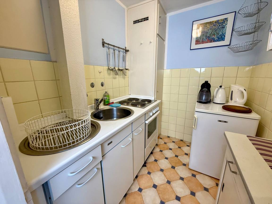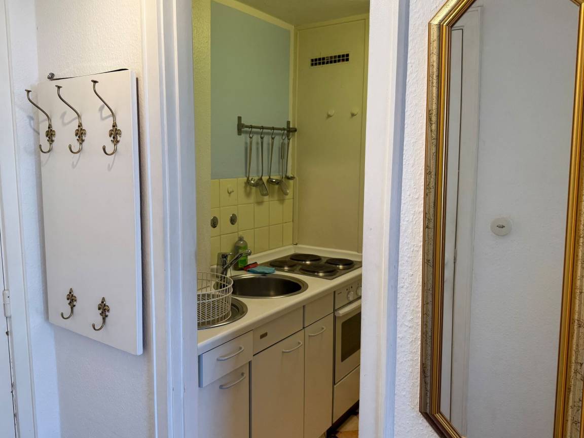 Vom Vorflur mit praktischer Garderobe gelangen Sie direkt in den kombinierten Wohn-/Schlafbereich, in die separate Küche sowie ins Badezimmer mit Badewanne und WC.
