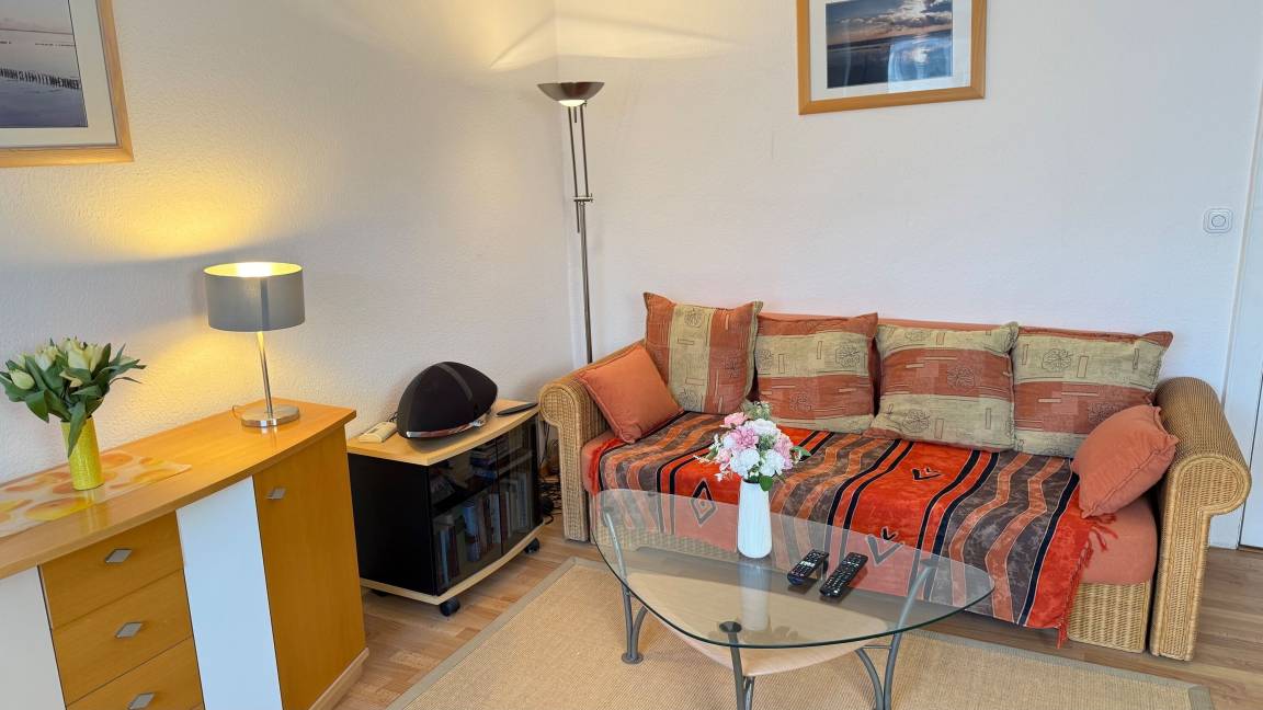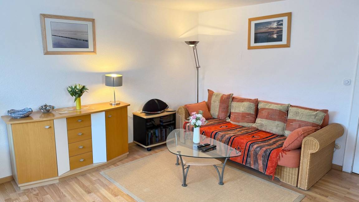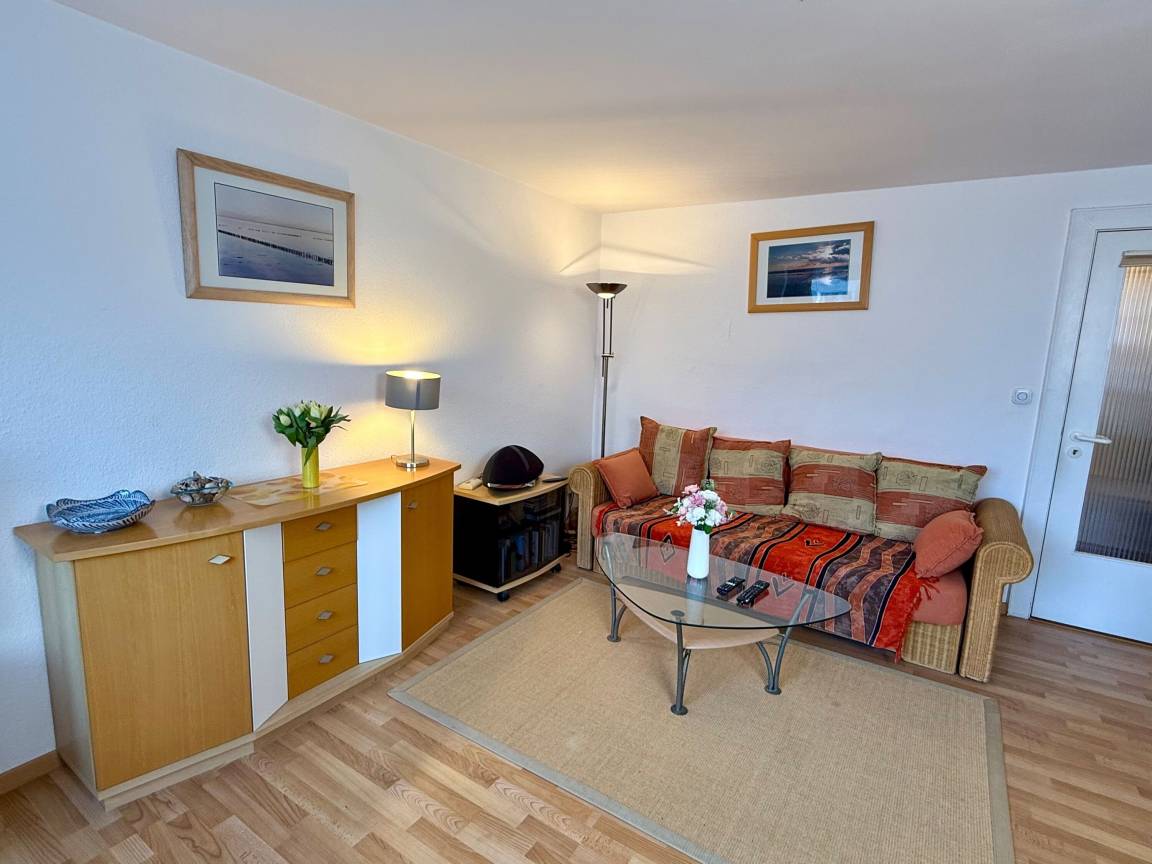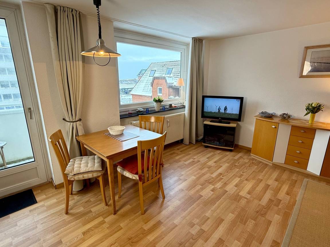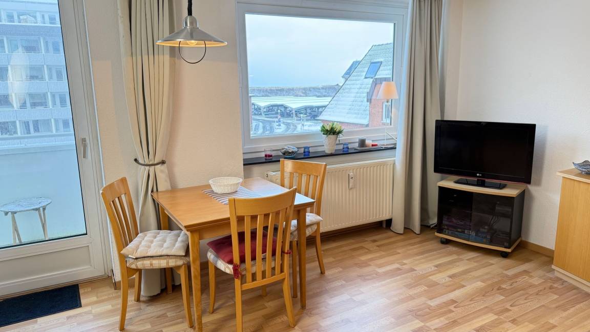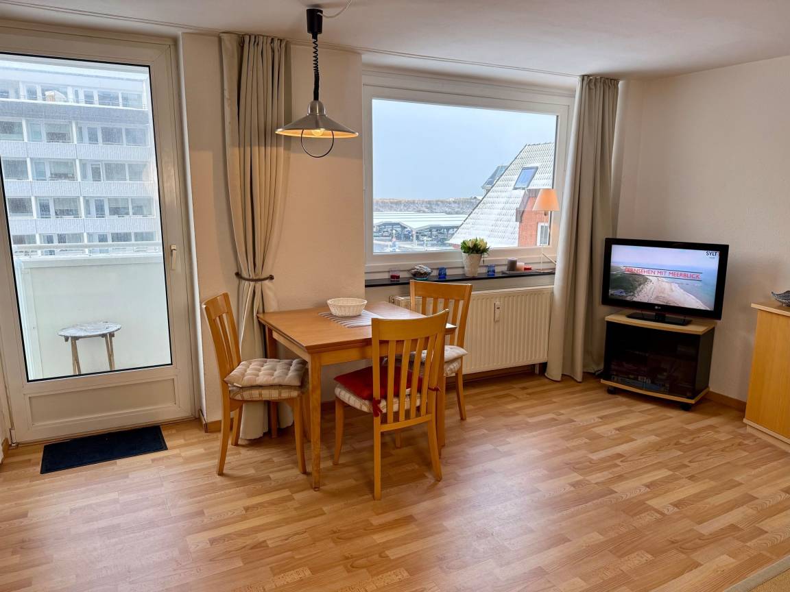 Diese gemütliche 1-Zimmer-Nichtraucher-Ferienwohnung (ca. 40 m²) befindet sich in der 3. Etage des Hauses Sylter Residenz – mit Westbalkon und einem kleinen Meerblick.
