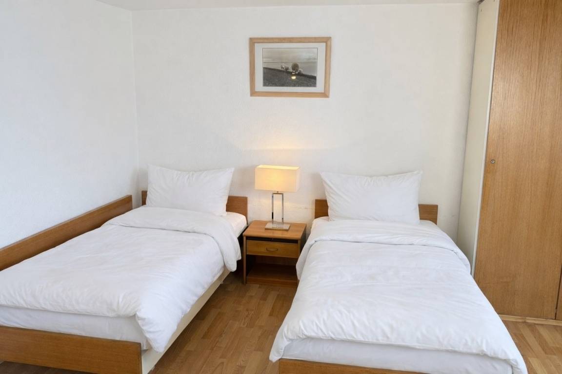 Der Wohn-/Schlafraum ist mit zwei bequemen Einzelbetten, sowie einem Kabel-Flachbild-TV ausgestattet – ideal für erholsame Tage allein oder zu zweit.