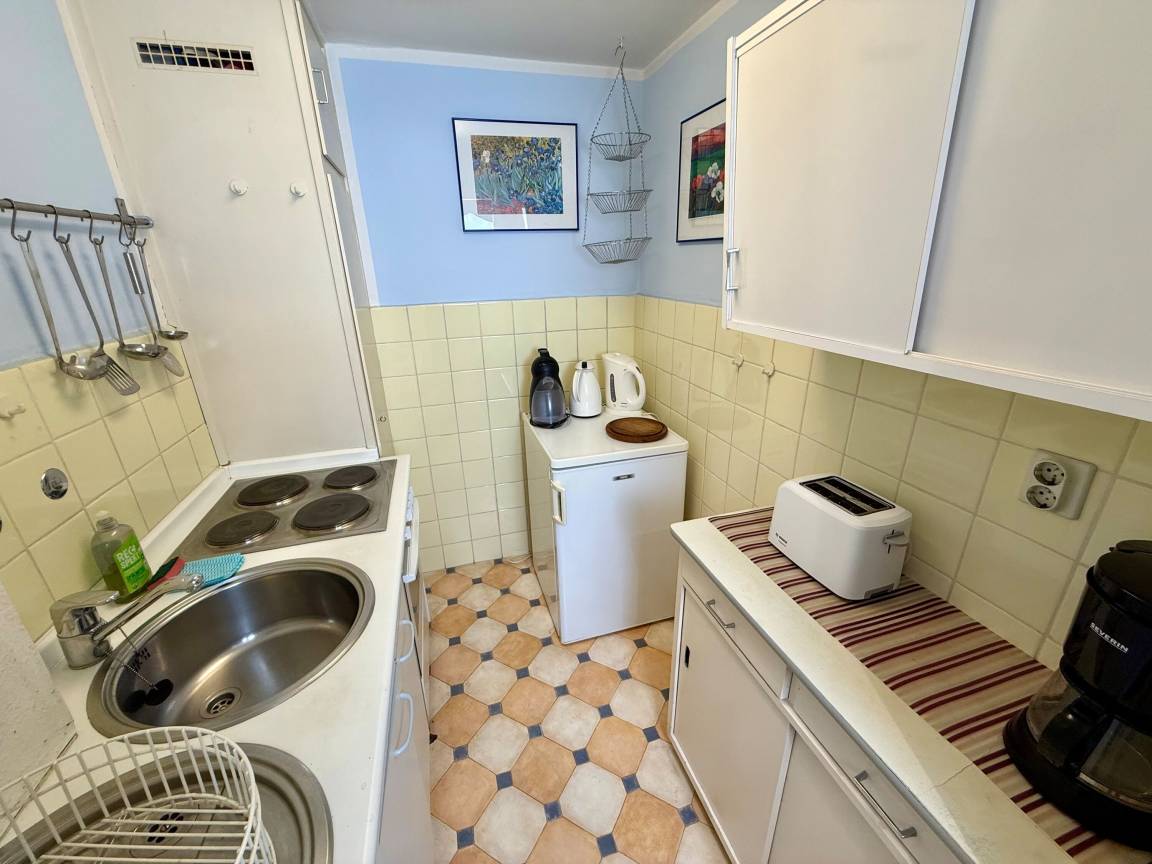Die separate Küche verfügt über Kühlschrank, Filterkaffeemaschine und Kapselmaschine, sowie Wasserkocher und Toaster.