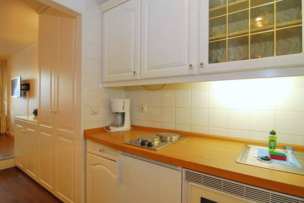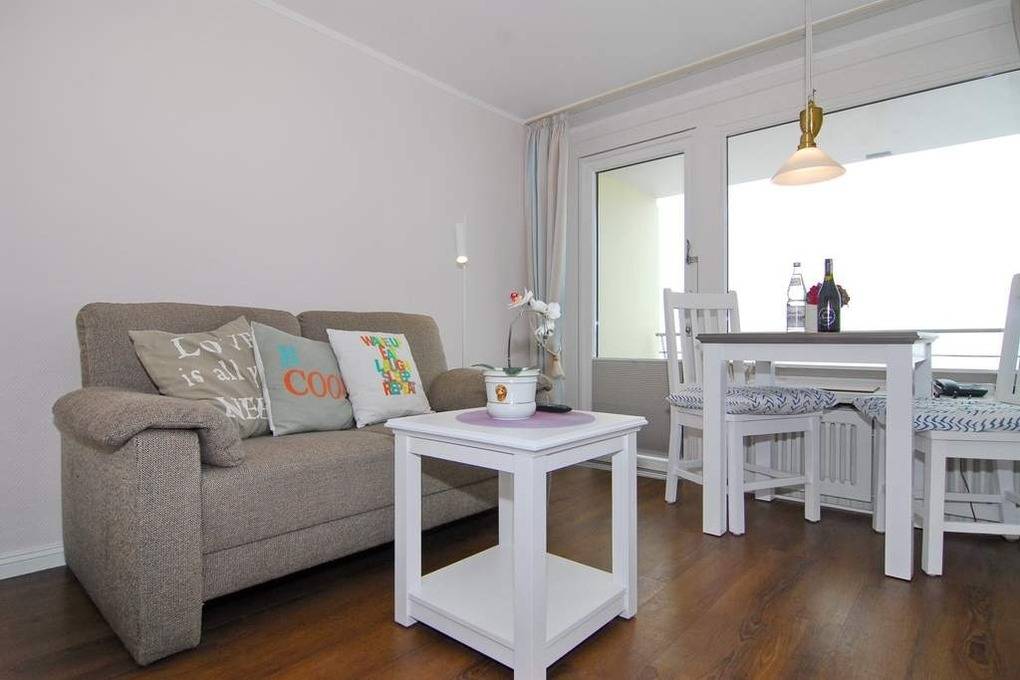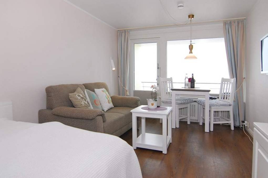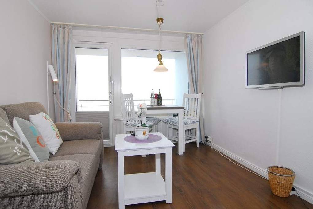 1-Zimmer-Ferienwohnung, ca. 25 qm, im 11.OG des Hauses Metropol zur Seeseite. Die Nichtraucher-Wohnung hat ein Wohn-/ Schlafraum mit Westbalkon und freiem Blick auf das Meer, Eßtisch am Fenster, Couch und Einbauschrank, Doppelbett (ca. 140x200, 1 Matratze), Kabel-TV, Radio, W-Lan, Küchenzeile im Flurbereich mit Mikrowelle, Duschbad/WC. Rauchen und Tierhaltung ist nicht gestattet! Bettwäsche und Handtücher sind zur Anreise aufgezogen. Ein PKW-Stellplatz kann kostenpflichtig zugebucht werden .Achtung: Sitz- und Essecke befinden sich auf Podest. 1 Stufe vorhanden.