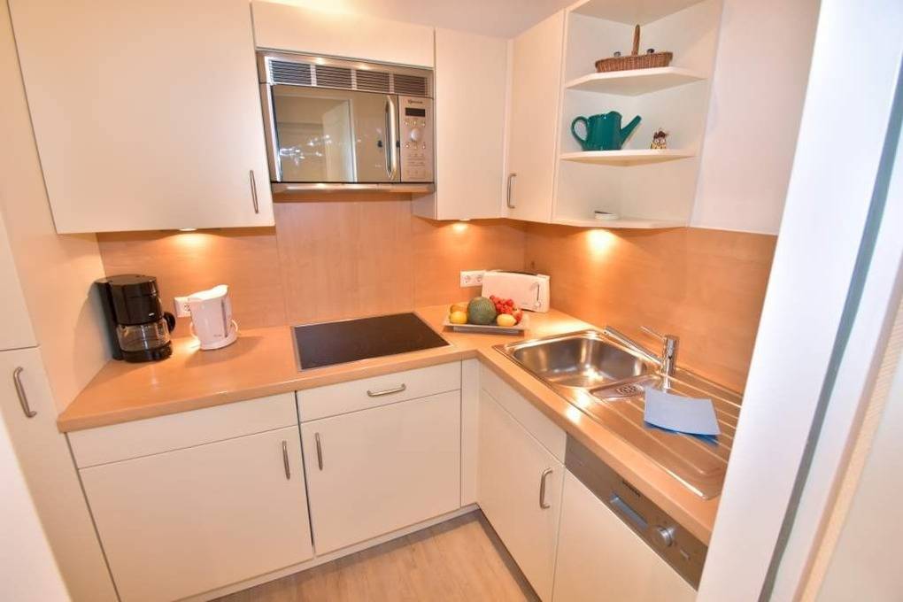 Die separate Küche hat einen Geschirrspüler, eine Mikrowelle mit Grillfunktion, ein Cerankochfeld mit 4 Kochfeldern und einen Kühlschrank mit 3*-Gefrierfach. Kaffeemaschine, Wasserkocher und Toaster gehören zur Grundausstattung.