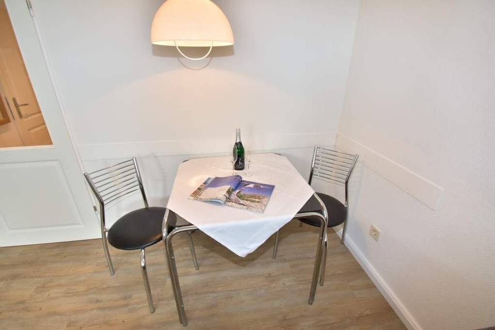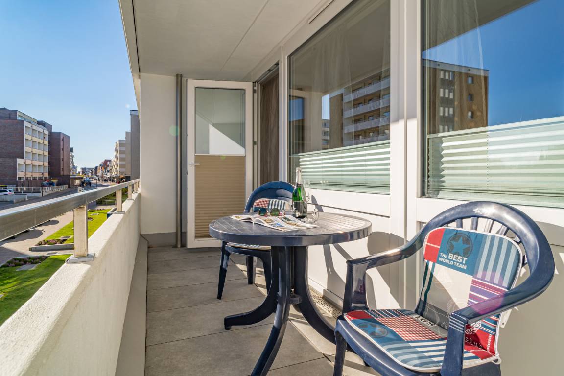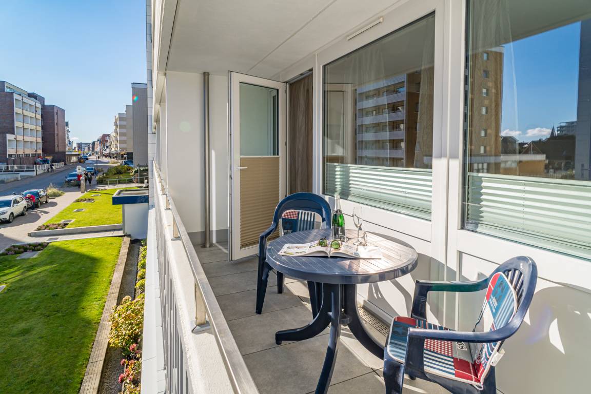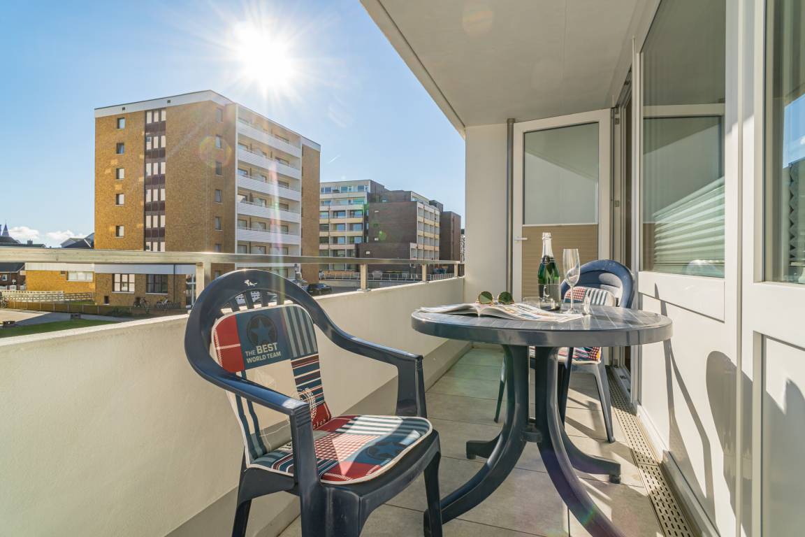 1-Zimmer-Ferienwohnung (ca. 38 qm) in der 1. Etage zur Landseite mit Ostloggia (Morgensonne, mit Balkonmöbeln und Auflagen) für max. 2 Personen.