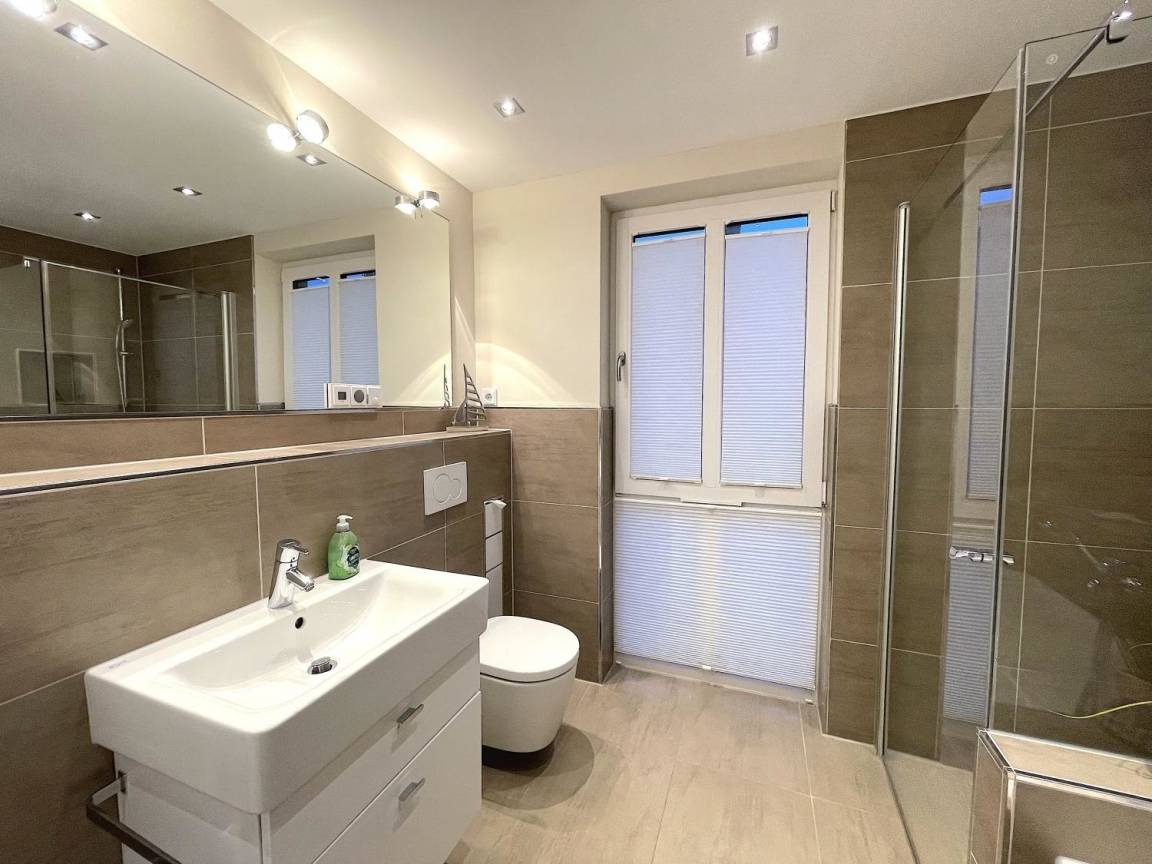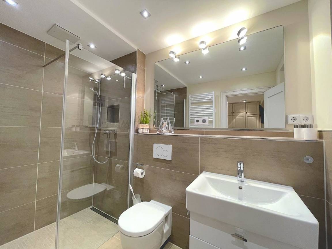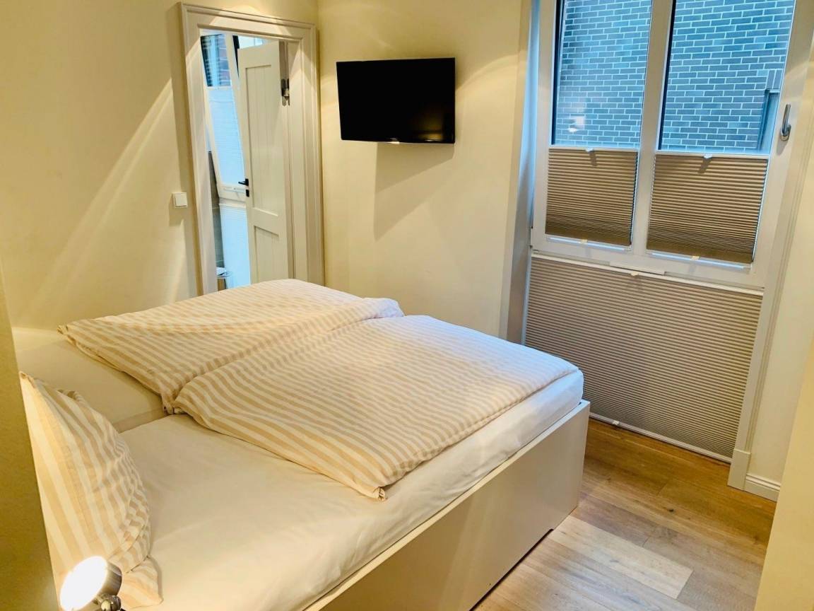 Modern eingerichtet bietet die Ferienwohnung Platz für bis zu 4 Personen. Alle Räume befinden sich auf einer Ebene, erreichbar über das gepflegte Treppenhaus. Vom Flur aus gehen die Schlafzimmer mit Doppelbett, das Bad und das Wohnzimmer mit Terrasse ab. Der Küchenbereich ist als moderne Küchenzeile in das Wohnzimmer integriert.