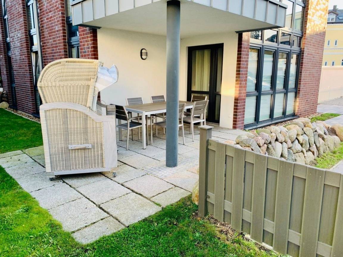 Auf der Terrasse finden Sie hochwertige Möbel und ein Strandkorb.