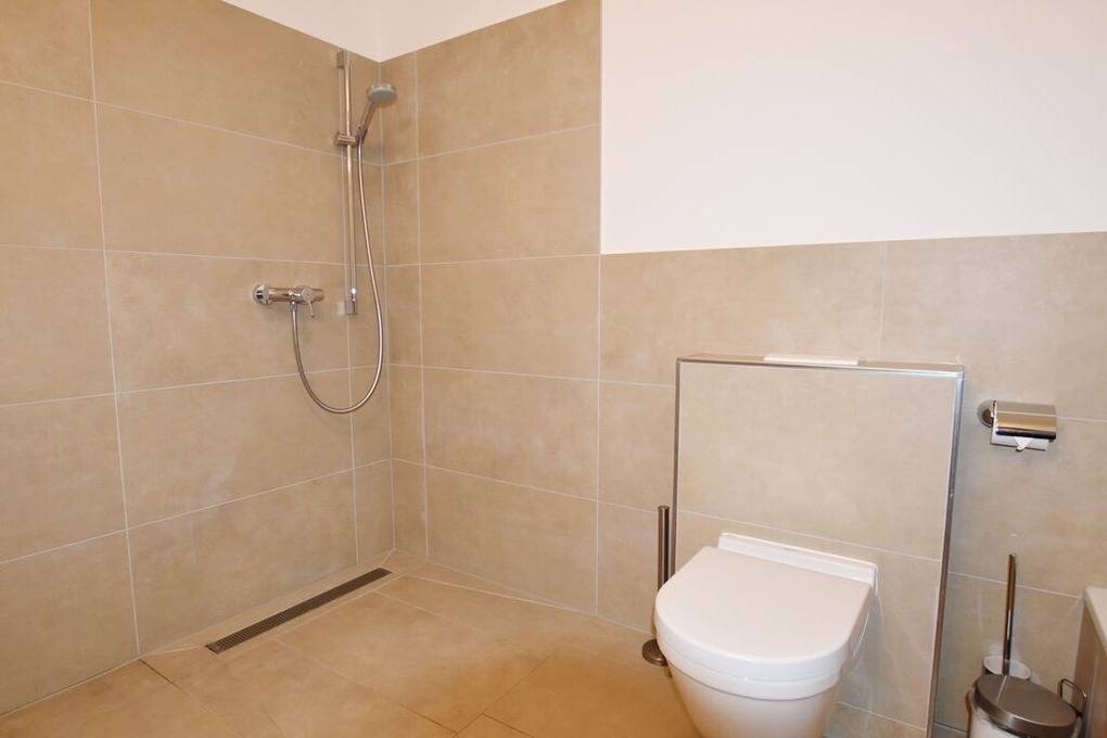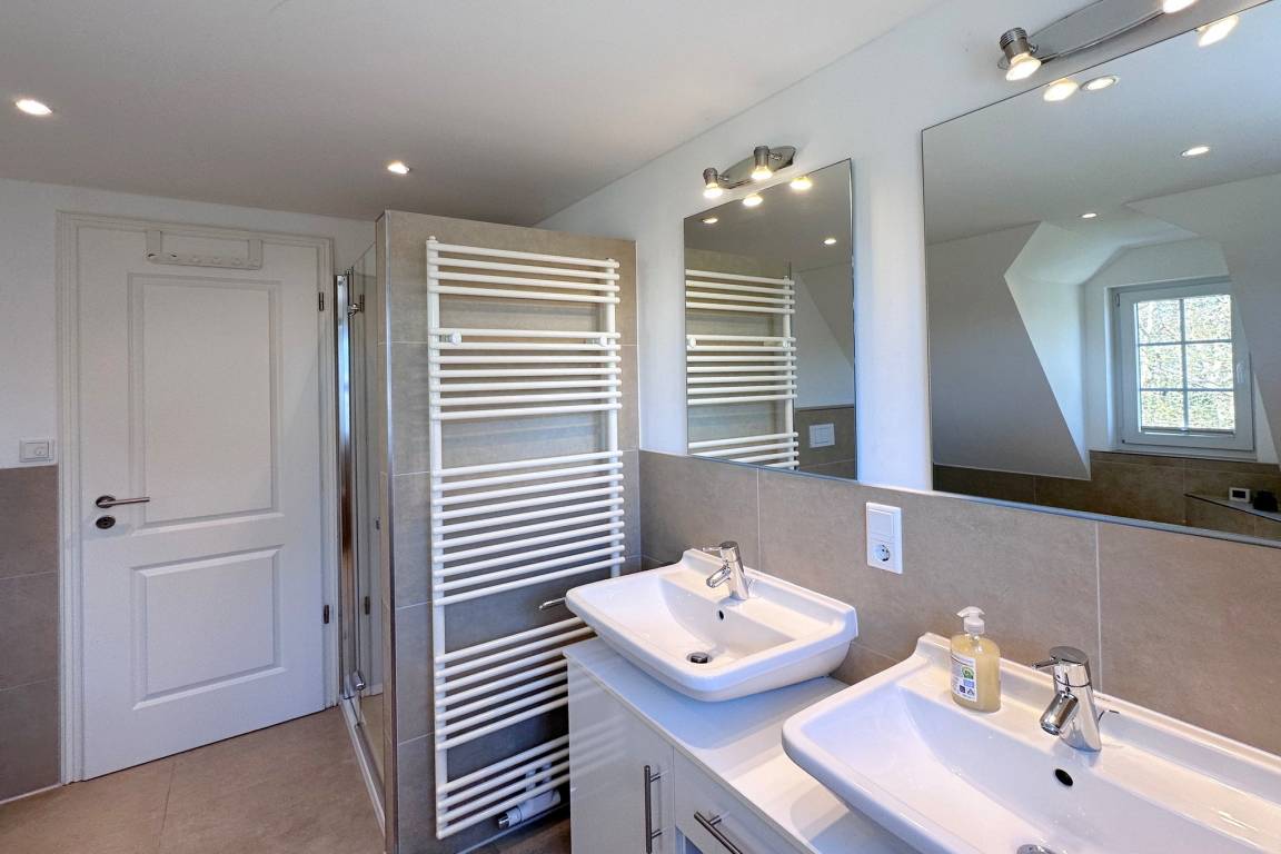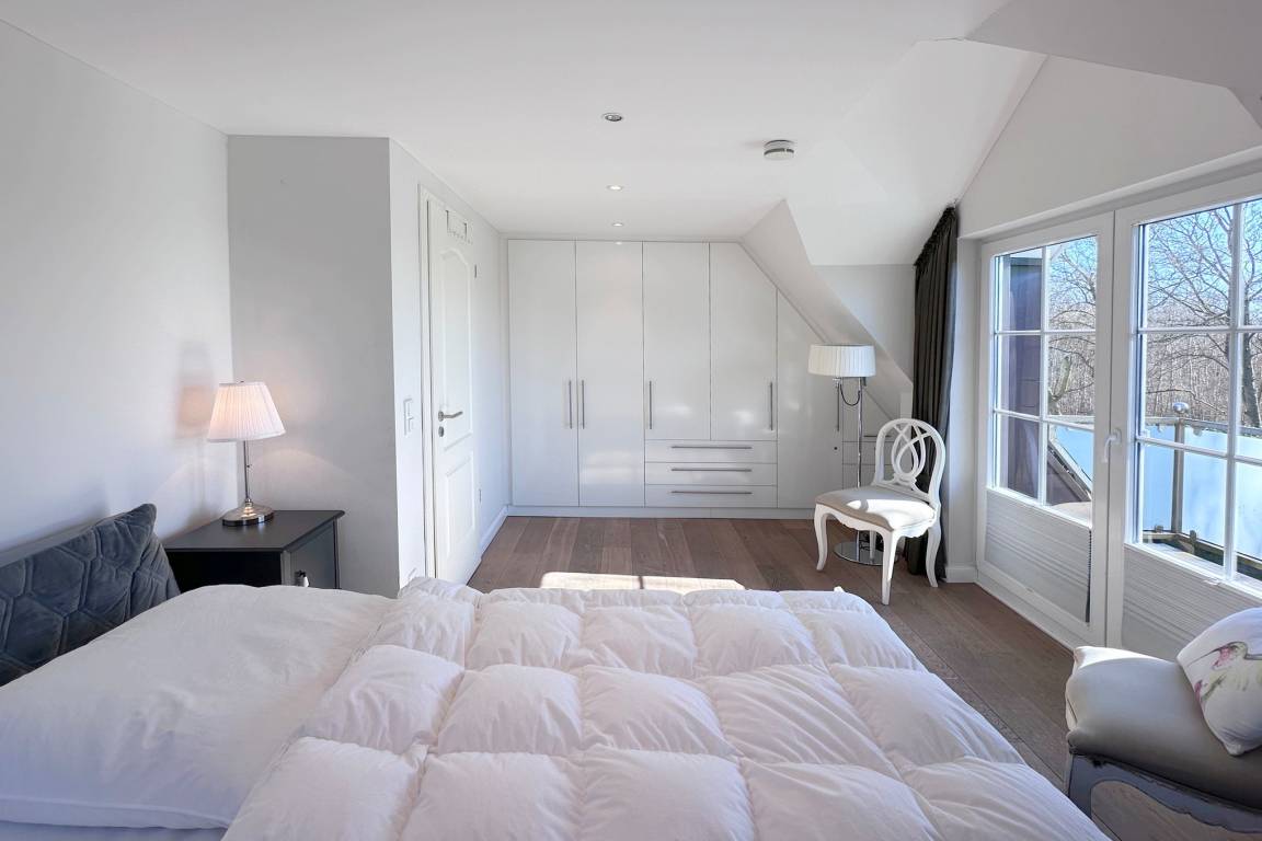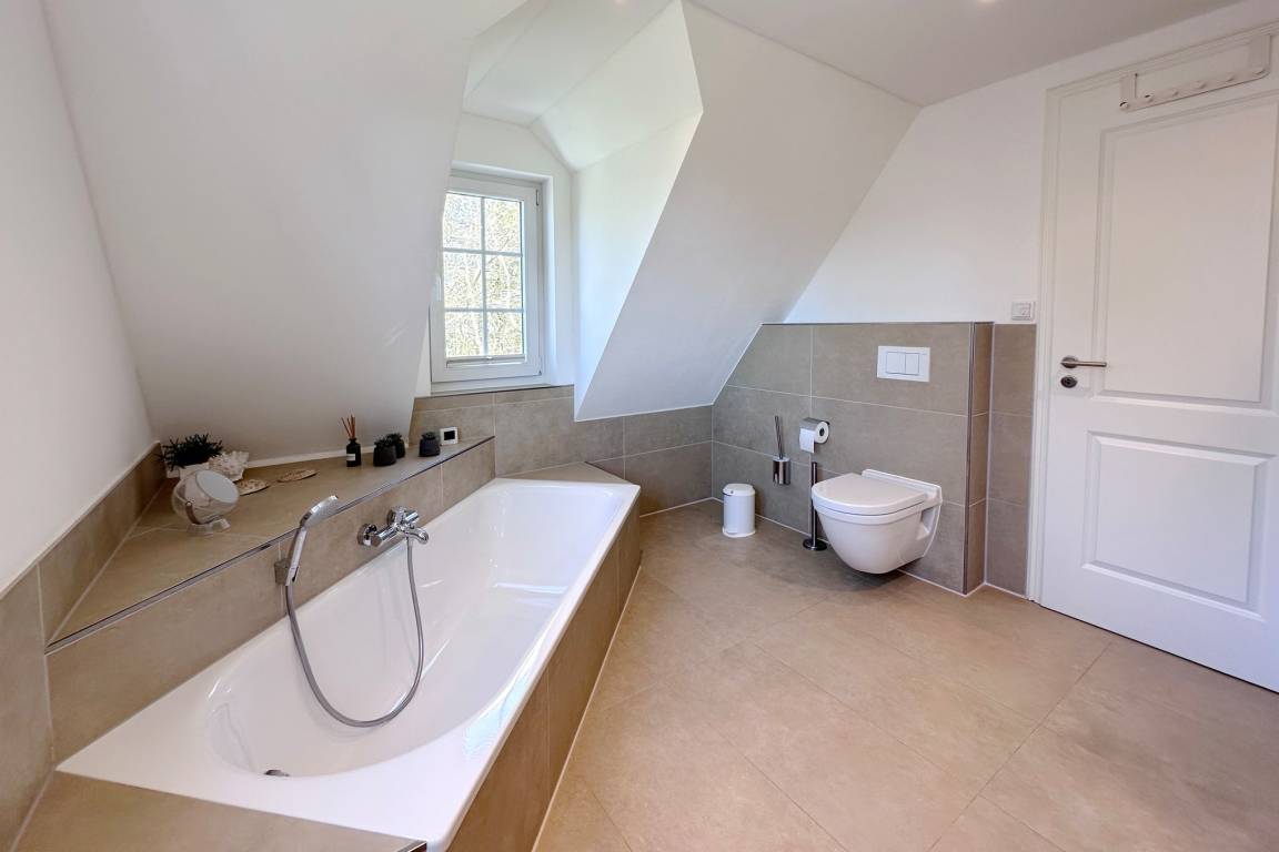 OG: grosses Schlafzimmer mit Doppelbett, Einbauschränken und zusätzlichem TV, kleines Schlafzimmer mit Einzelbett, grosses modernes Badezimmer mit Doppelwaschbecken, Wanne und Dusche,