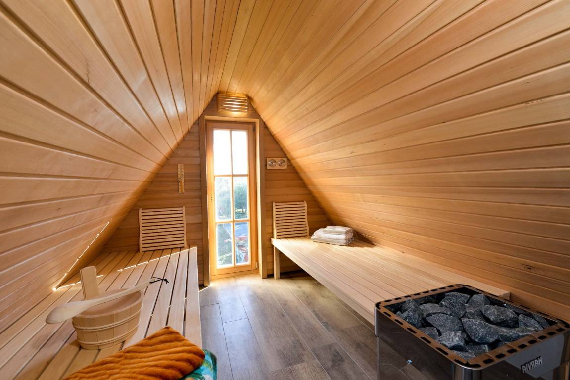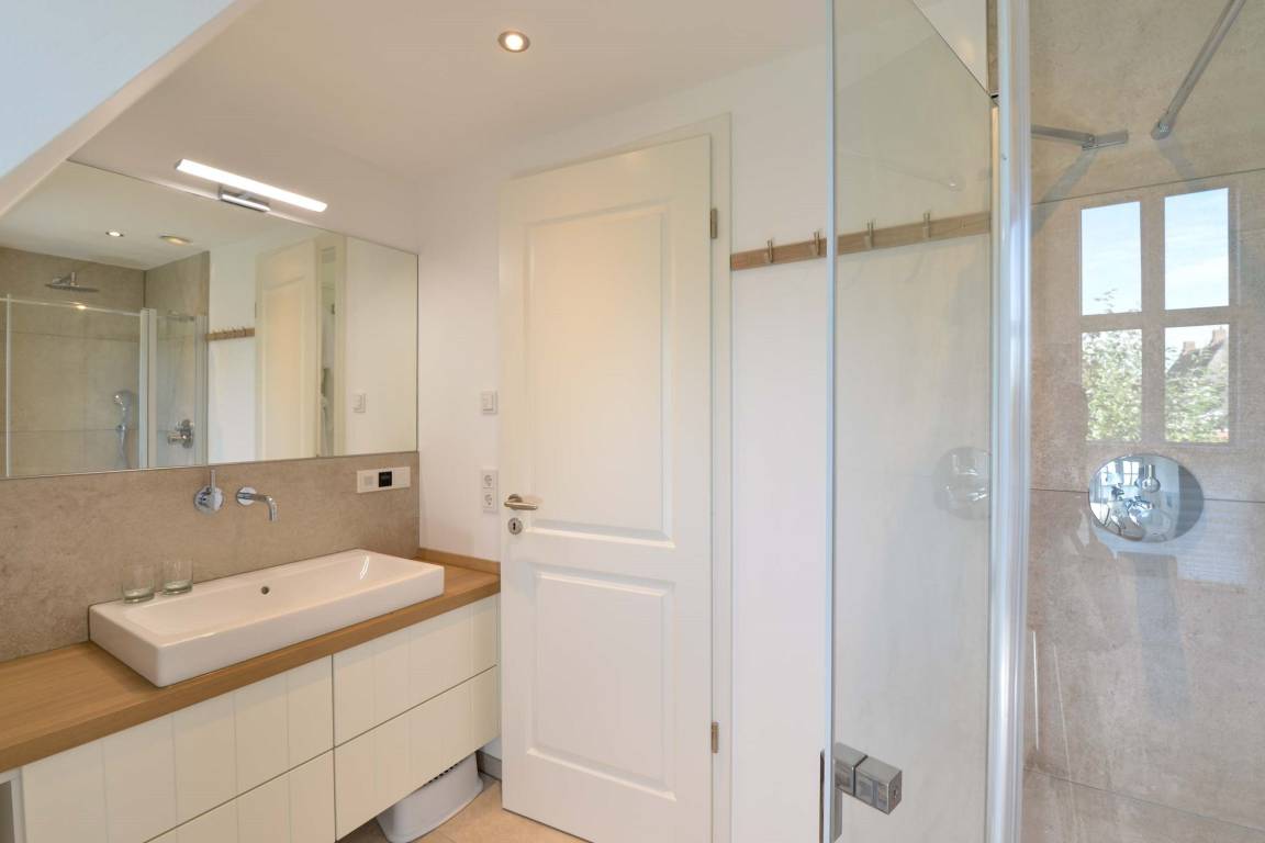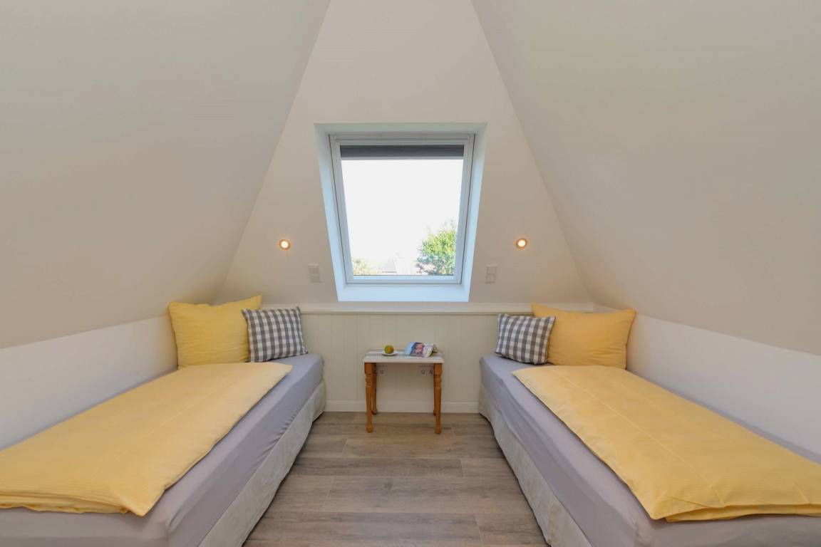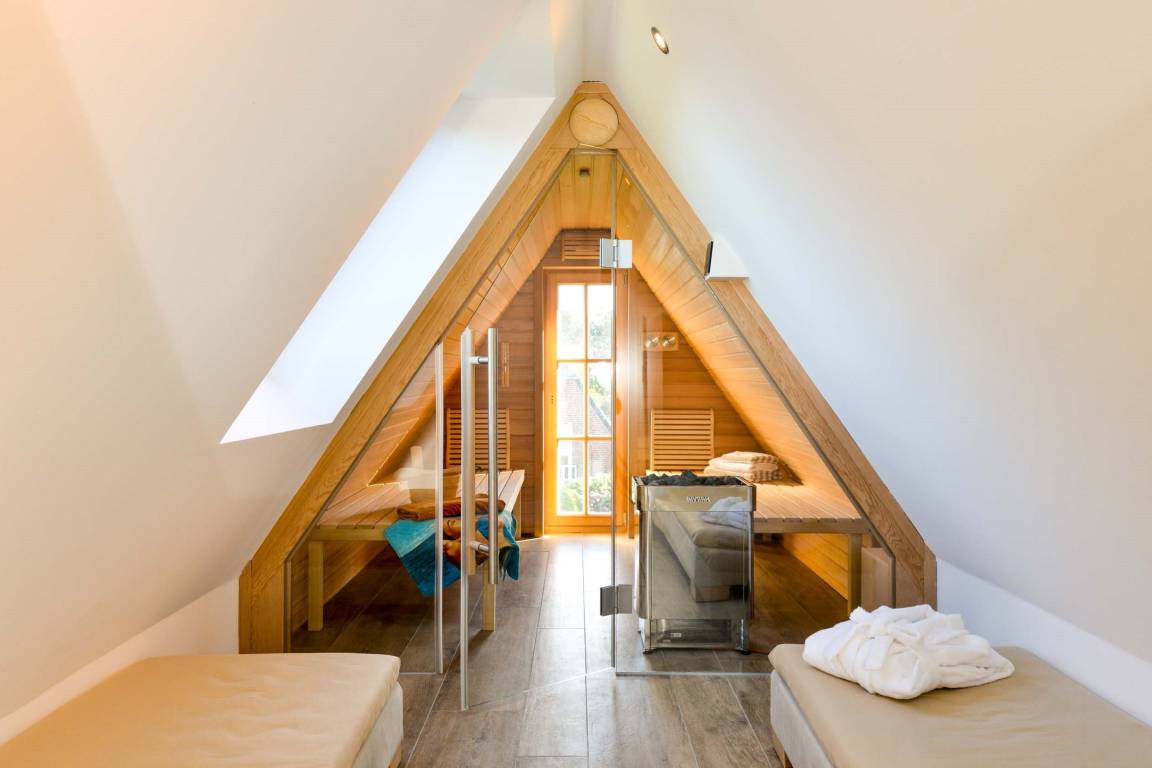 Im Spitzboden gibt es ein weiteres Schlafzimmer mit zwei Einzel-Boxspringbetten, die auf Wunsch zusammengestellt werden können. Auch hier gibt es ein Duschbad sowie eine Sauna.