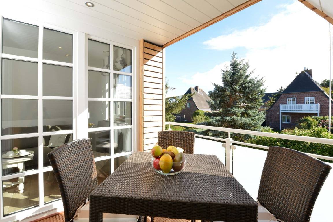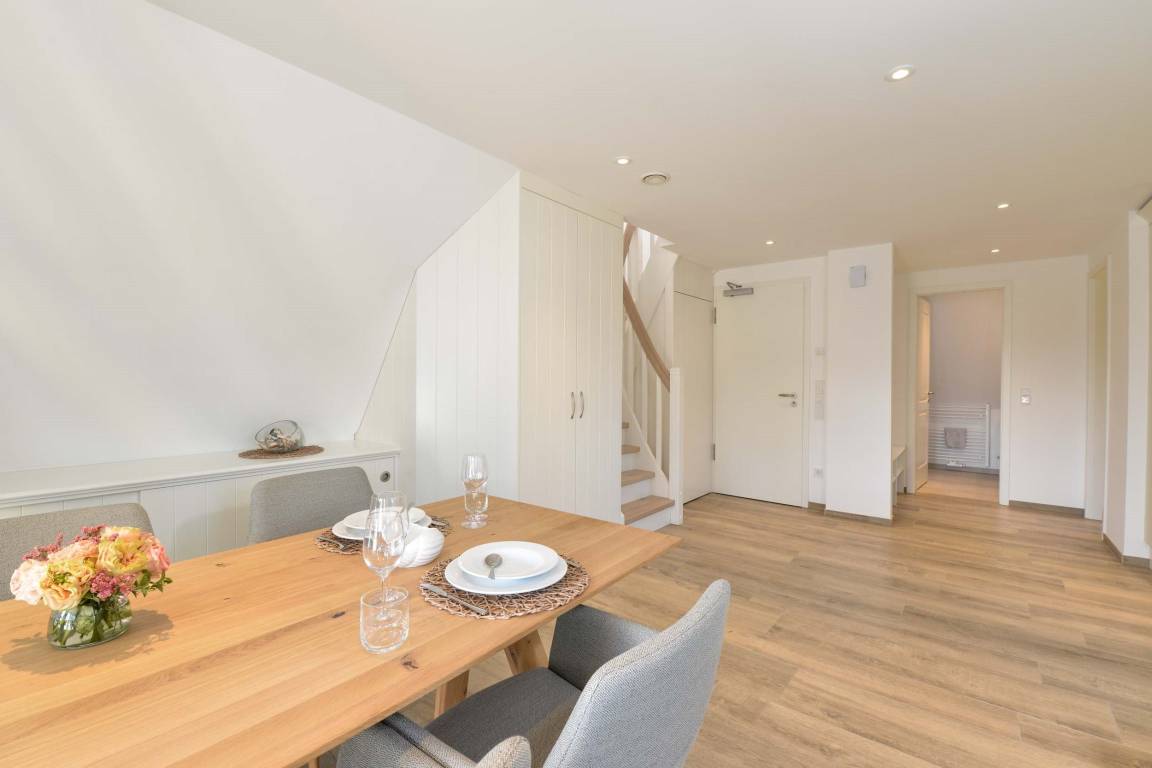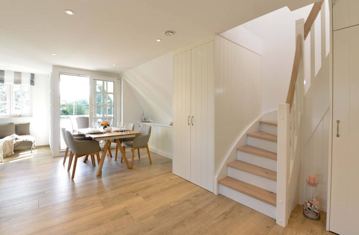 Im ersten Obergeschoss befindet sich ein Schlafzimmer mit einem komfortablen Boxspringdoppelbett und Morgensonne. Zudem gibt es ein Duschbad und einen hellen Wohnbereich mit integrierter Küche und Zugang zum überdachten und windgeschützten Südbalkon.