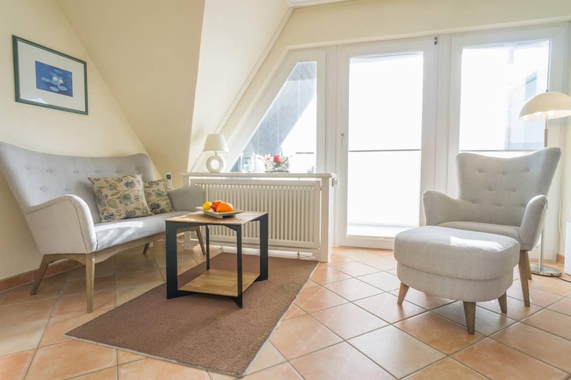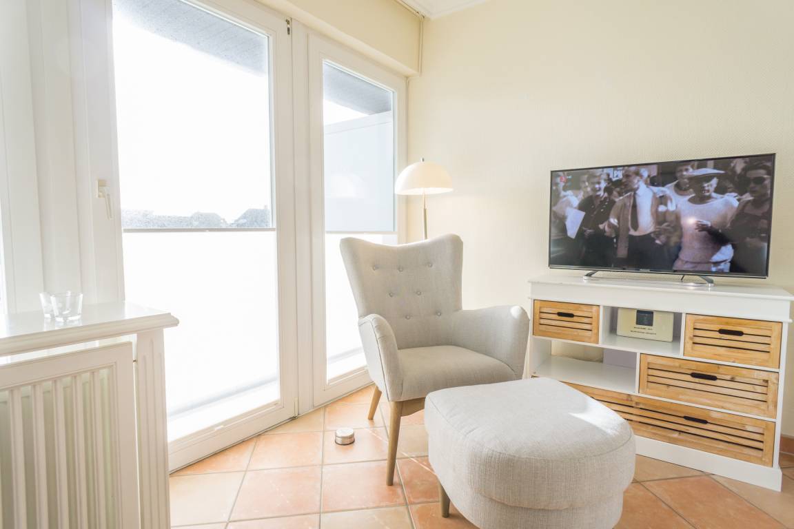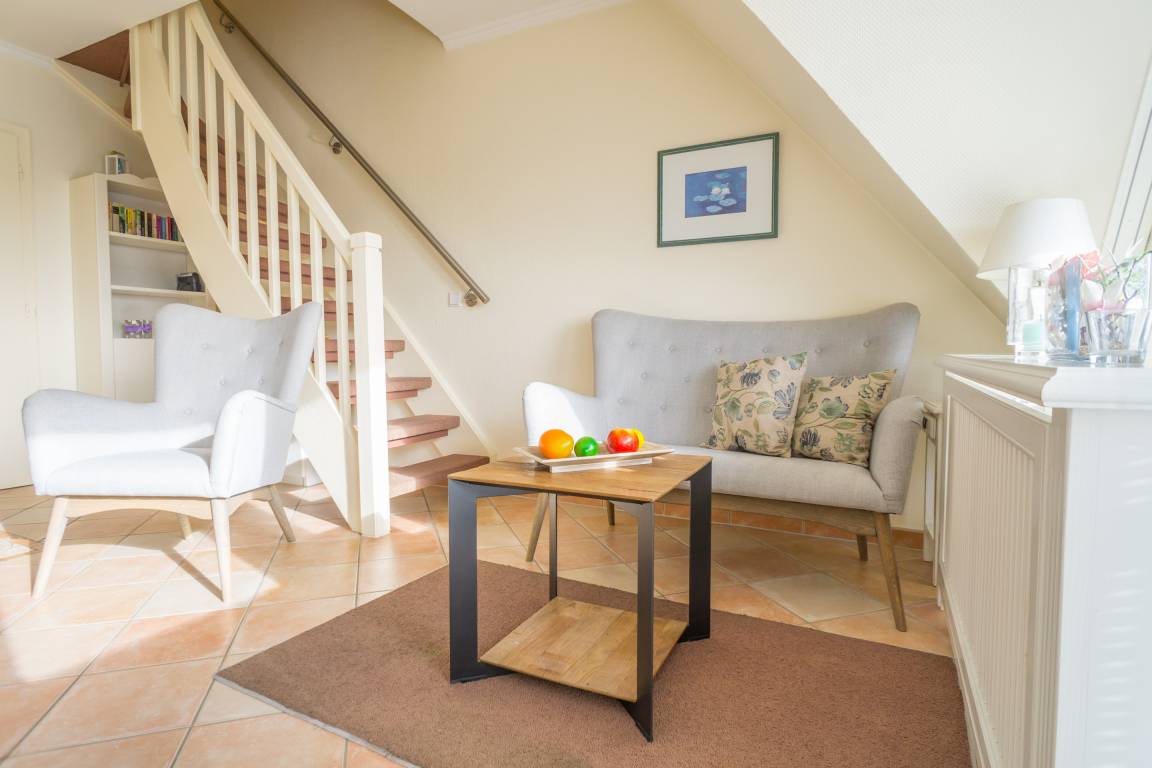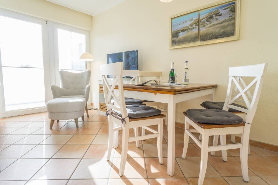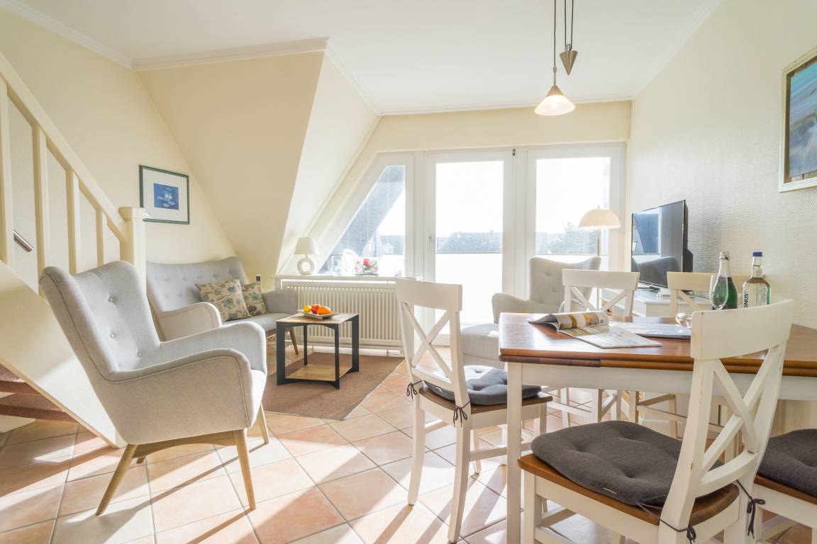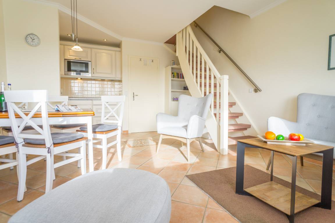 Der gemütliche Wohnraum besteht aus einer Sitzecke (2-Sitzer-Couch und zwei Sessel), einem Essplatz, Flachbild-TV, Telefon mit kostenloser Telefonie ins deutsche Festnetz.