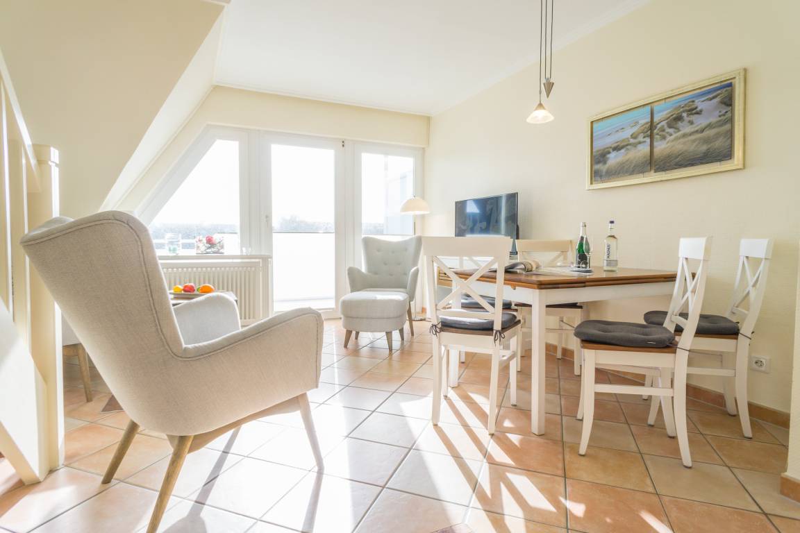 Gemütliche 4-Zimmer-Nichtraucher-Ferienwohnung, ca. 67 qm, in der 2. Etage zur Südseite mit Südbalkon (ganztägig Sonne, mit Balkonmöbeln und Auflagen) für max. 5 Personen.