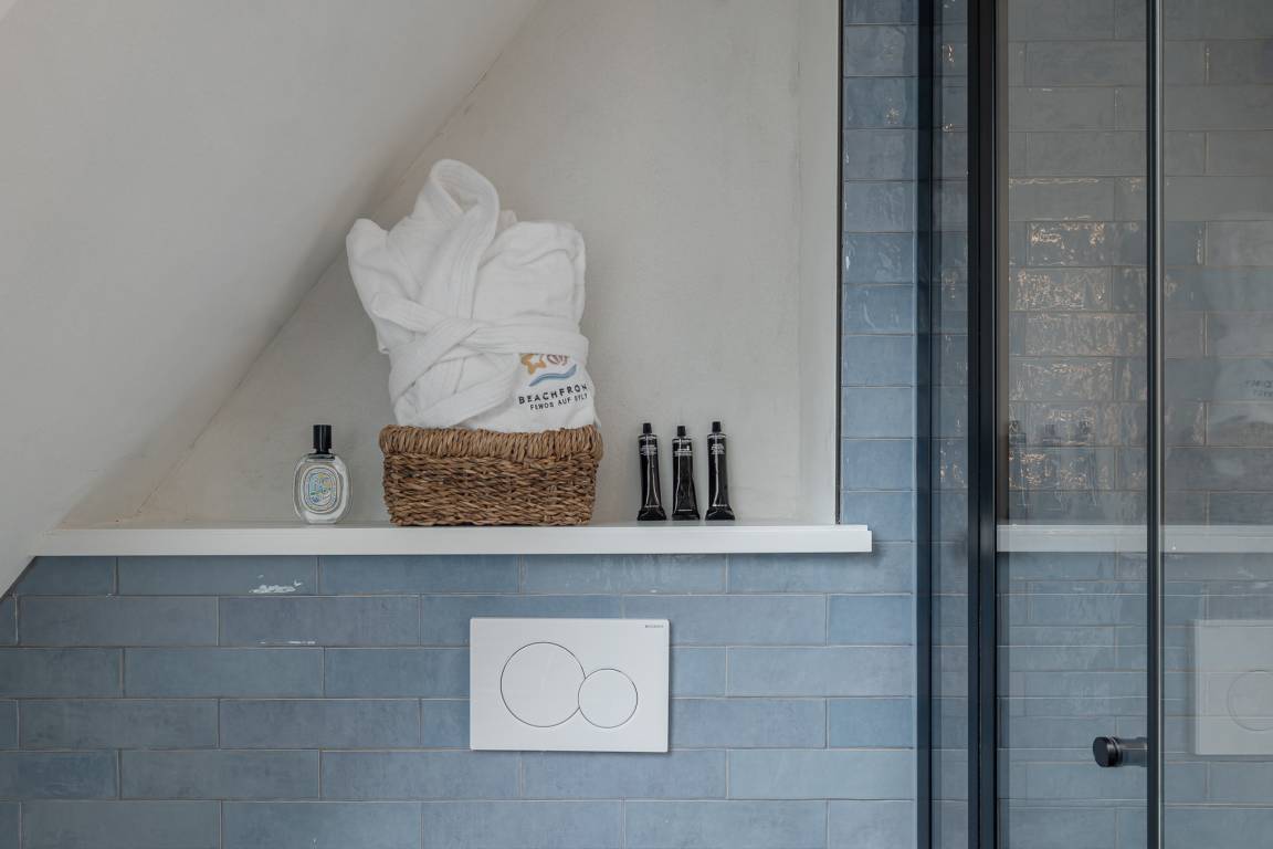 Im stilvollen Badezimmer in Meerblau- und Sandtönen erwartet Sie eine großzügige Regendusche, ergänzt durch Fußbodenheizung und Handtuchwärmer – Ihre kleine private Wellnessoase.