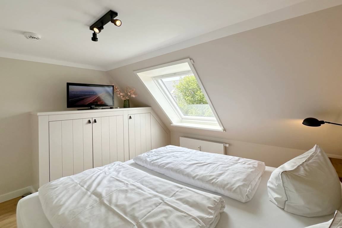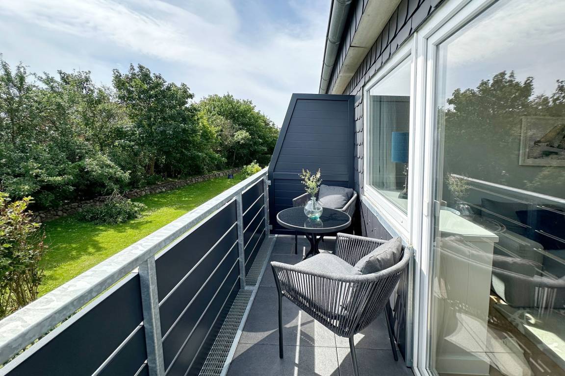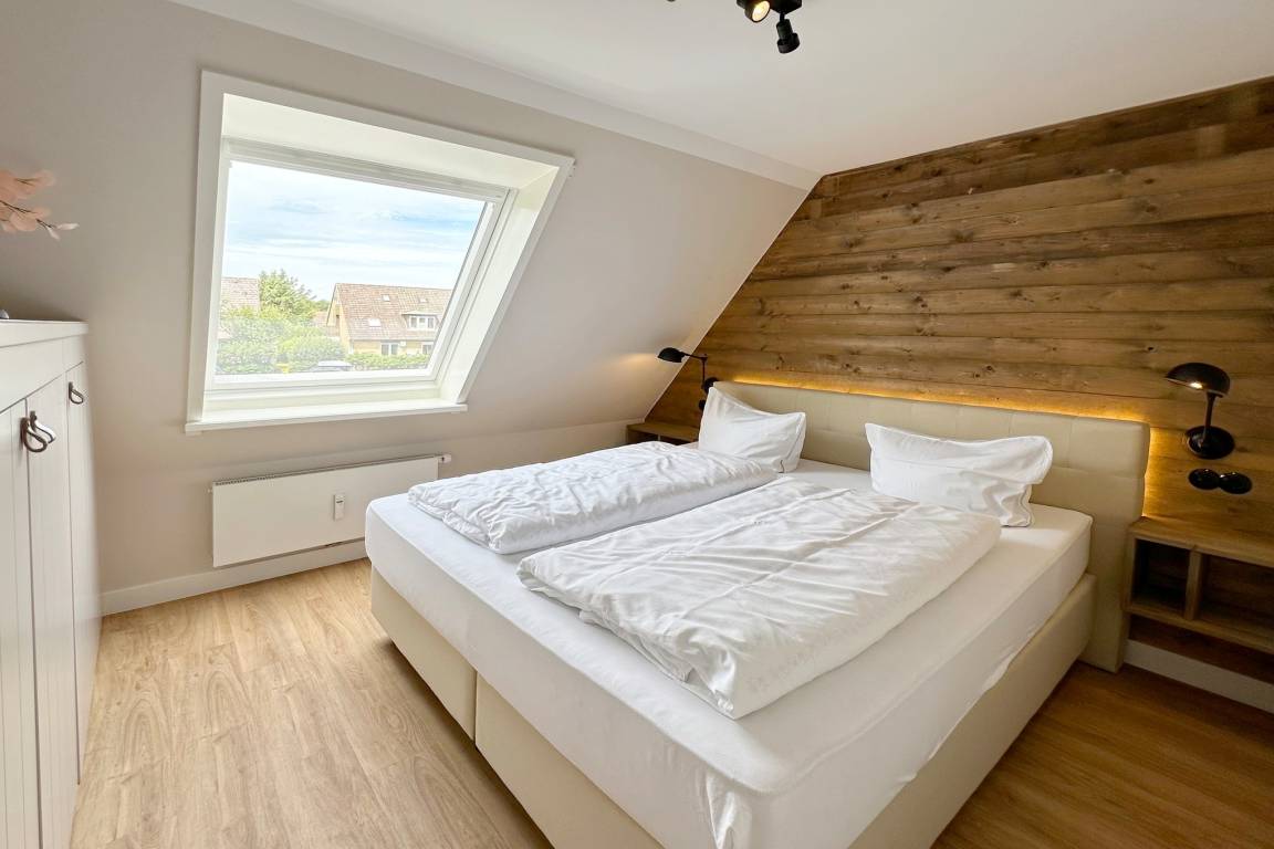 Im Obergeschoss befindet sich der Wohnraum mit Schlafcouch ( ca. 140cm breit ) für 1-2 Kinder, einem Fernseher und W-Lan. Hier gibt es auch einen Essbereich sowie eine offene Küche mit Geschirrspülmaschine, Backofen, Induktionskochfeld, Filterkaffeemaschine, Nespressomaschine und Weinkühlschrank. Der Balkon ist mit Balkonmöbeln ausgestattet (verfügbar von ca. April bis Oktober). Das Schlafzimmer mit Verdunklungsmöglichkeit verfügt über ein Doppelbett (180x200cm), Kleiderschrank und einen Fernseher. Das moderne Duschbad rundet das Angebot ab. Im Haus steht Ihnen gegen Gebühr eine gemeinschaftlich genutzte Waschmaschine zur Verfügung.