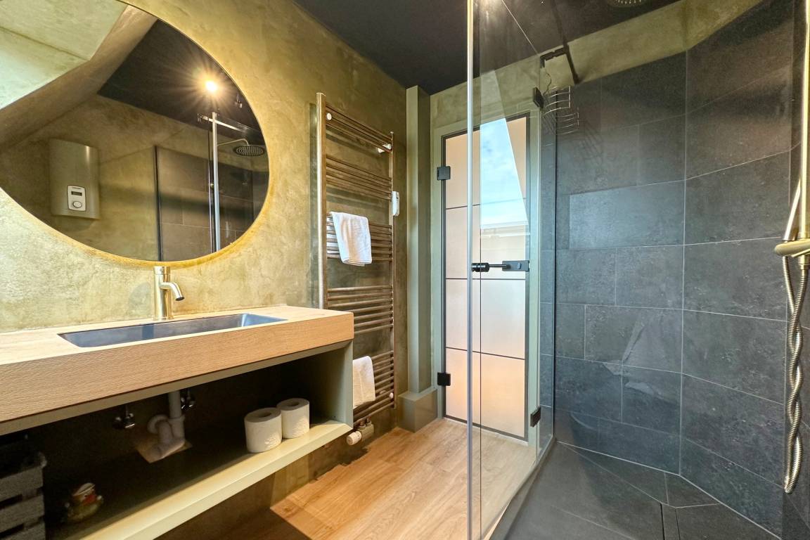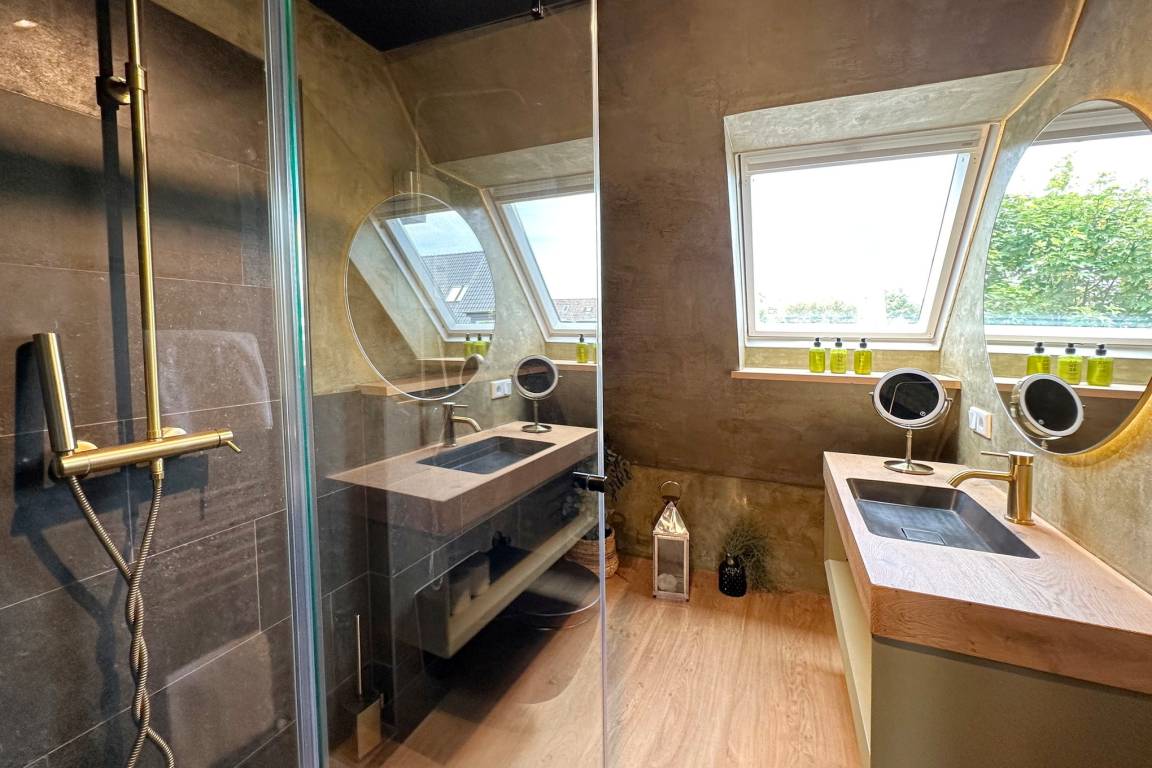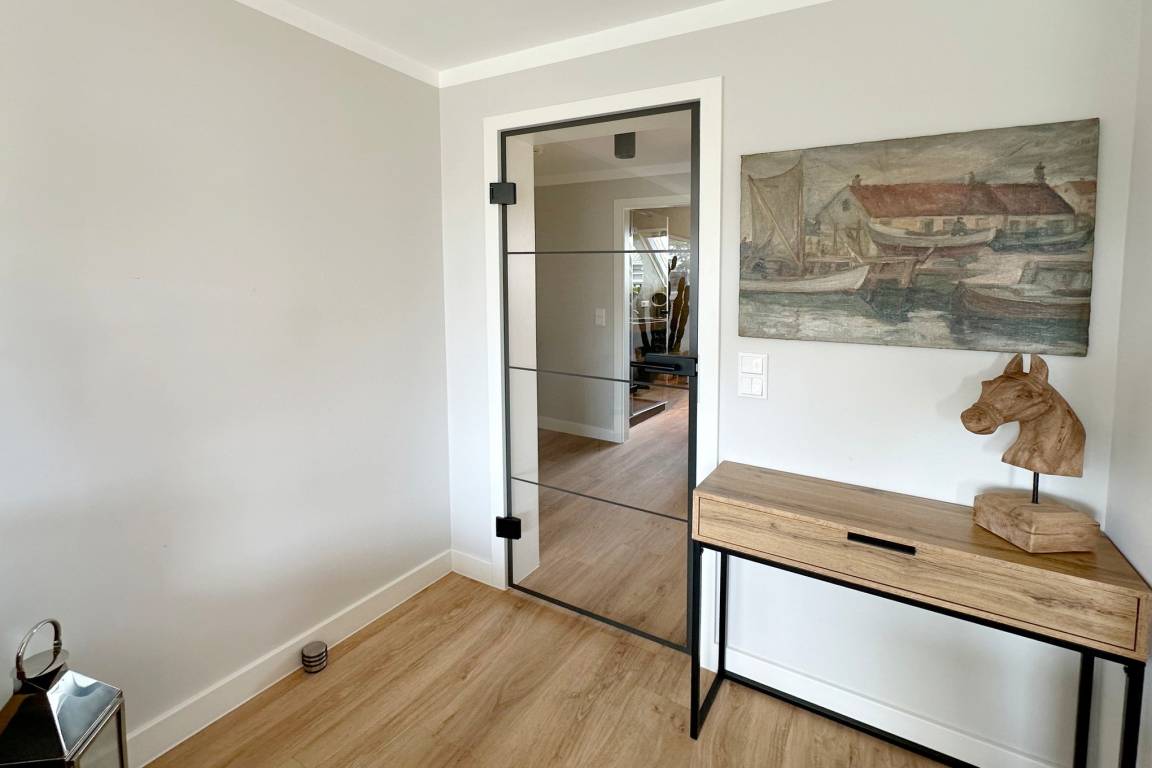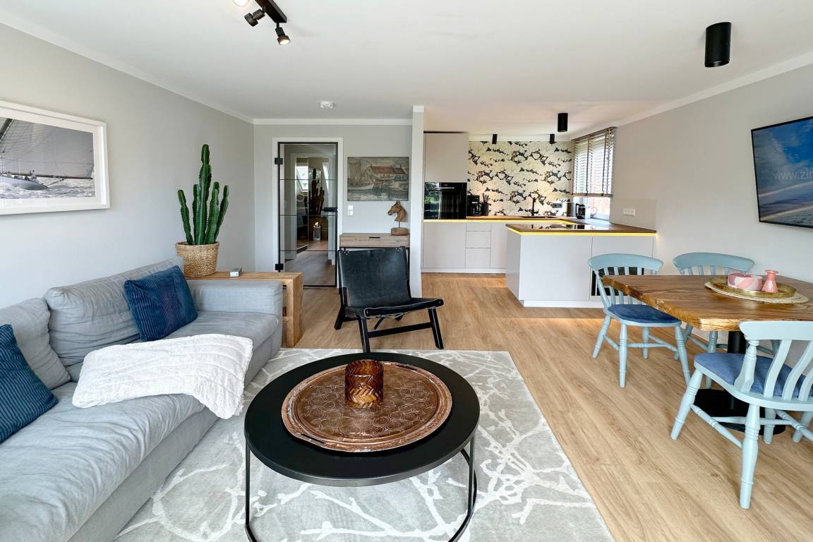 Im Obergeschoss befindet sich der Wohnraum mit Schlafcouch ( ca. 140cm breit ) für 1-2 Kinder, einem Fernseher und W-Lan. Hier gibt es auch einen Essbereich sowie eine offene Küche mit Geschirrspülmaschine, Backofen, Induktionskochfeld, Filterkaffeemaschine, Nespressomaschine und Weinkühlschrank. Der Balkon ist mit Balkonmöbeln ausgestattet (verfügbar von ca. April bis Oktober). Das Schlafzimmer mit Verdunklungsmöglichkeit verfügt über ein Doppelbett (180x200cm), Kleiderschrank und einen Fernseher. Das moderne Duschbad rundet das Angebot ab. Im Haus steht Ihnen gegen Gebühr eine gemeinschaftlich genutzte Waschmaschine zur Verfügung.