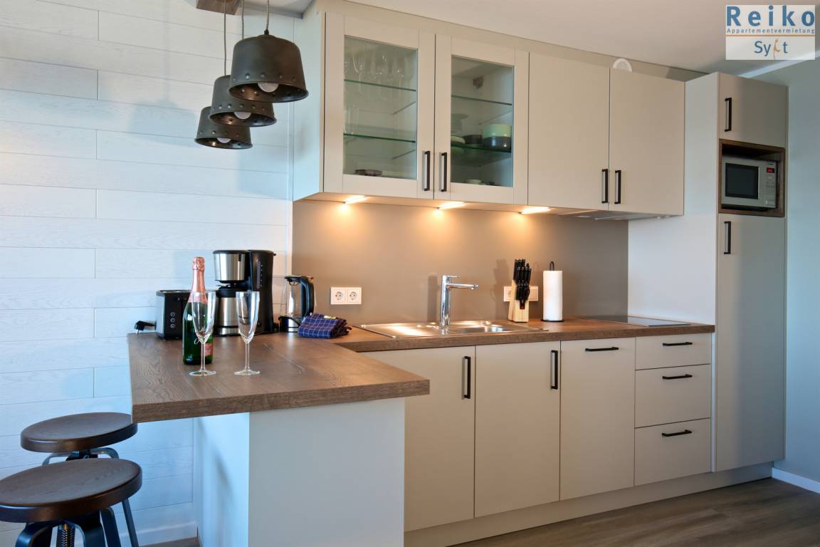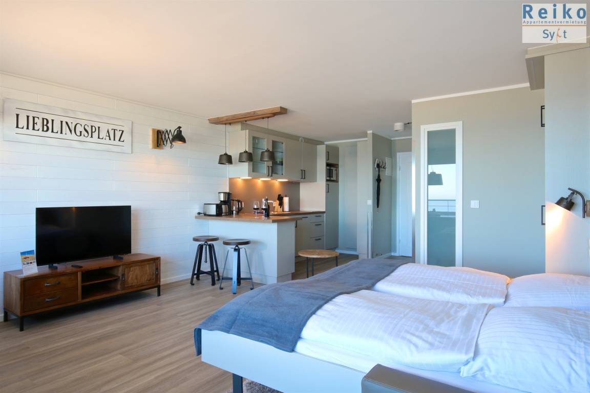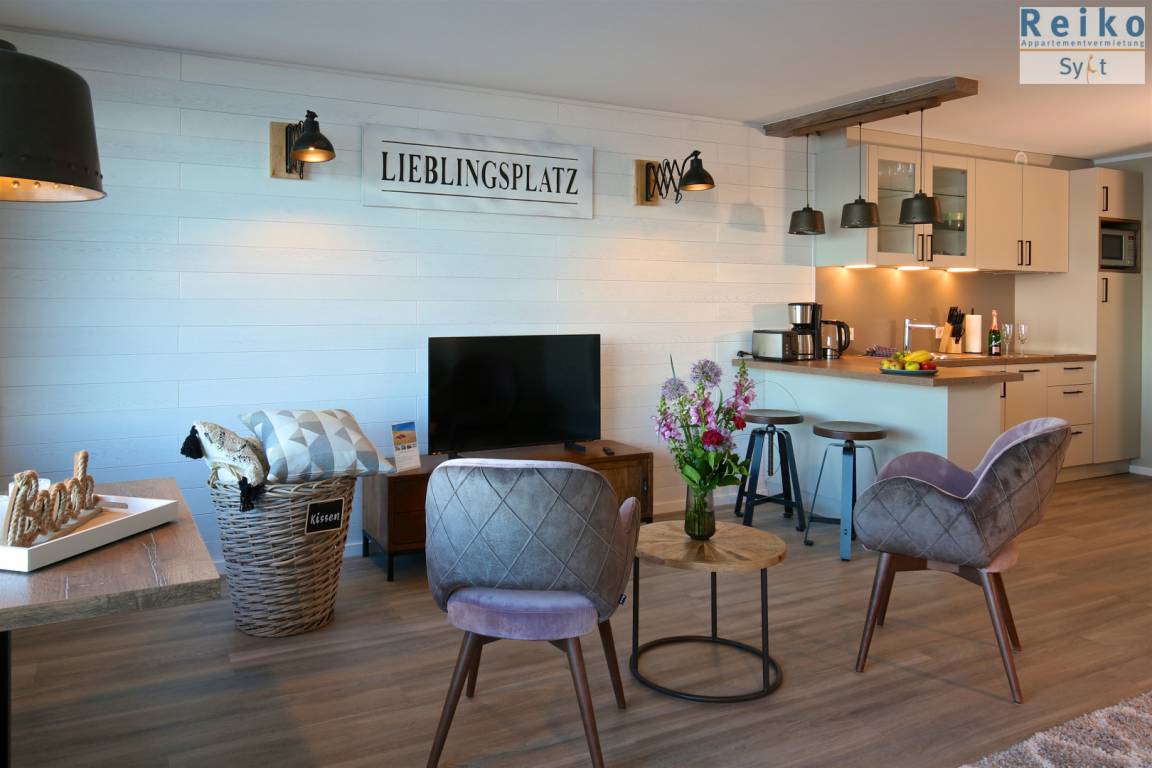 Im Wohn/Schlafraum befindet sich eine Sofa-Schlafkombination mit einzeln ausklappbaren Betten mit je 80x200 cm großen Matratzen sowie ein angeschlossener Essbreich mit zwei bequemen Sesseln am Fenster mit Nordseeblick. Ein Interentanschluss mit WLAN (ohne Gewähr) steht Ihnen zur Verfügung und ein 48 Zoll Flachbild-TV rundet das Bild ab. Die offene Wohnküche ist optisch durch einen Tresen vom Wohnbereich abgetrennt und sehr gut ausgestattet mit einer Mikrowelle, Geschirrspüler und einem 2-Platten-Cerankochfeld. Das Duschbad ist eine Kombination aus Holzelementen, grauen Fliesen und weißen Sanitärobjekten und sorgen für eine moderne Atmosphäre.