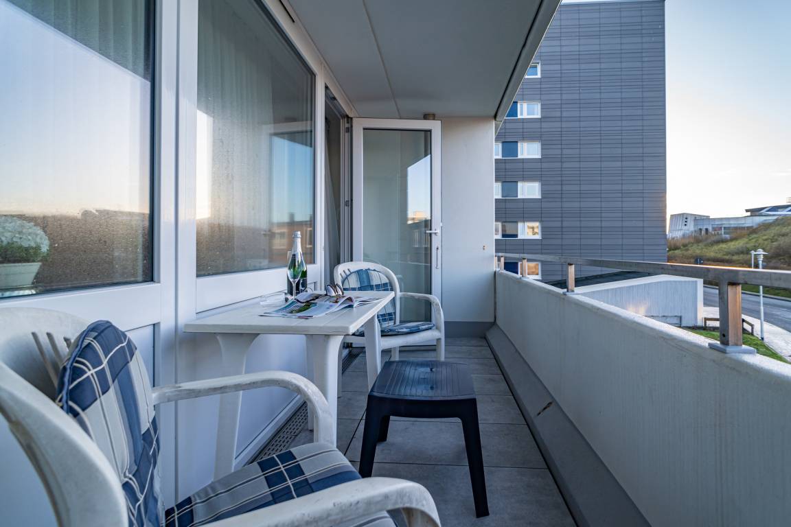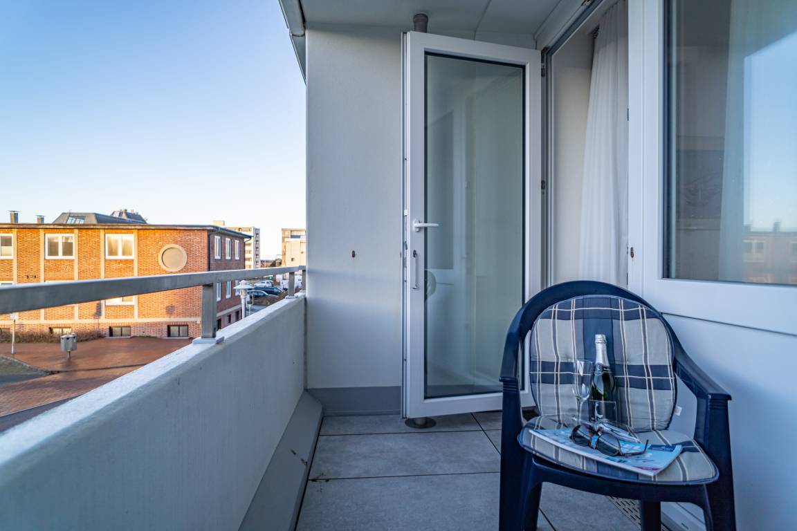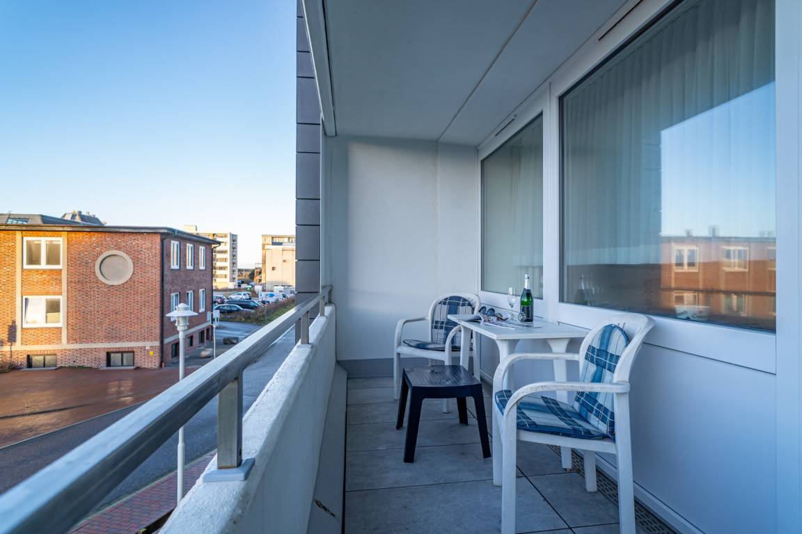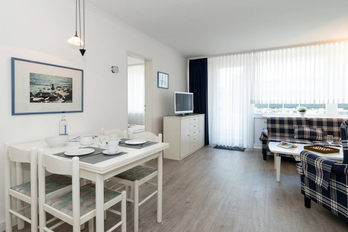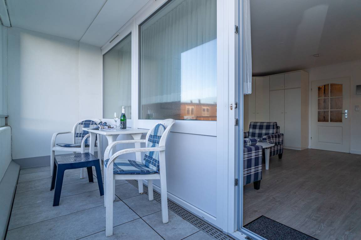 2-Zimmer-Nichtraucher-Ferienwohnung, ca. 51 qm, in der 1. Etage zur Seeseite mit Westloggia (Nachmittagssonne, mit Balkonmöbeln und Auflagen) für max. 3 Personen.