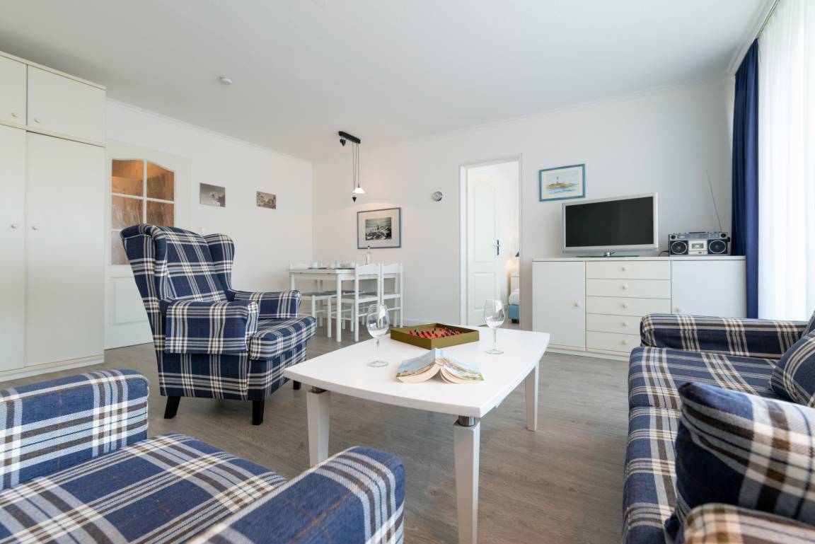 Der Wohnraum besteht aus einer bequemen Sitzgarnitur (zwei Zweisitzer und ein Sessel mit Fußhocker), einem Essplatz, einem Einzelschrankbett, Kabel-TV, HiFi-Anlage und dem Zugang zum Schlafzimmer.