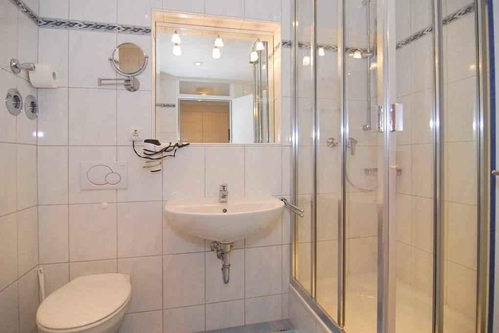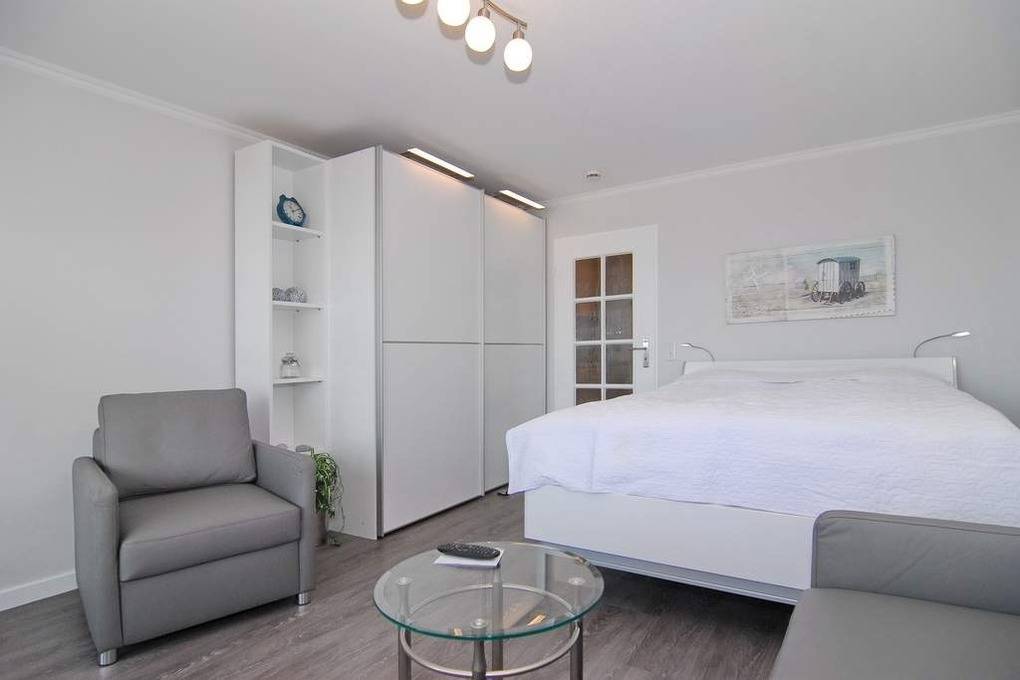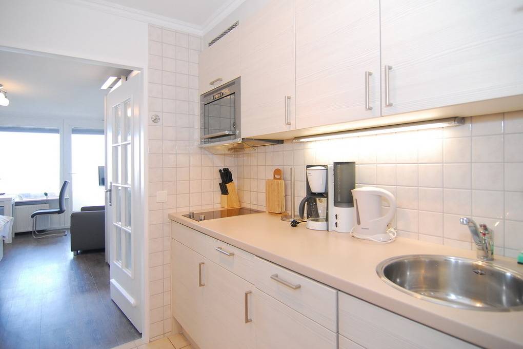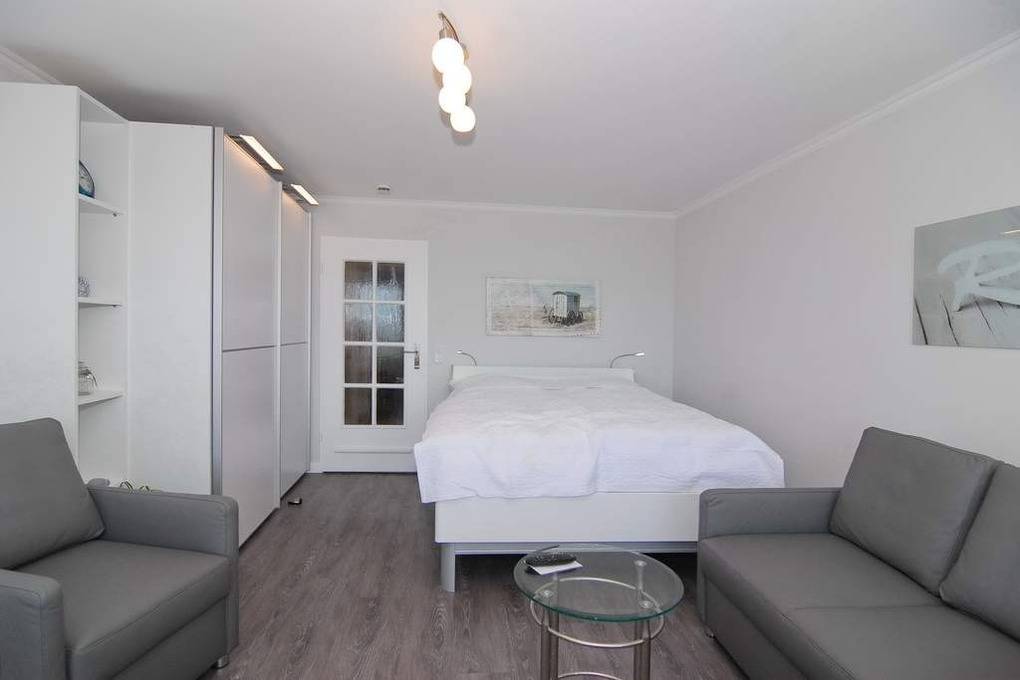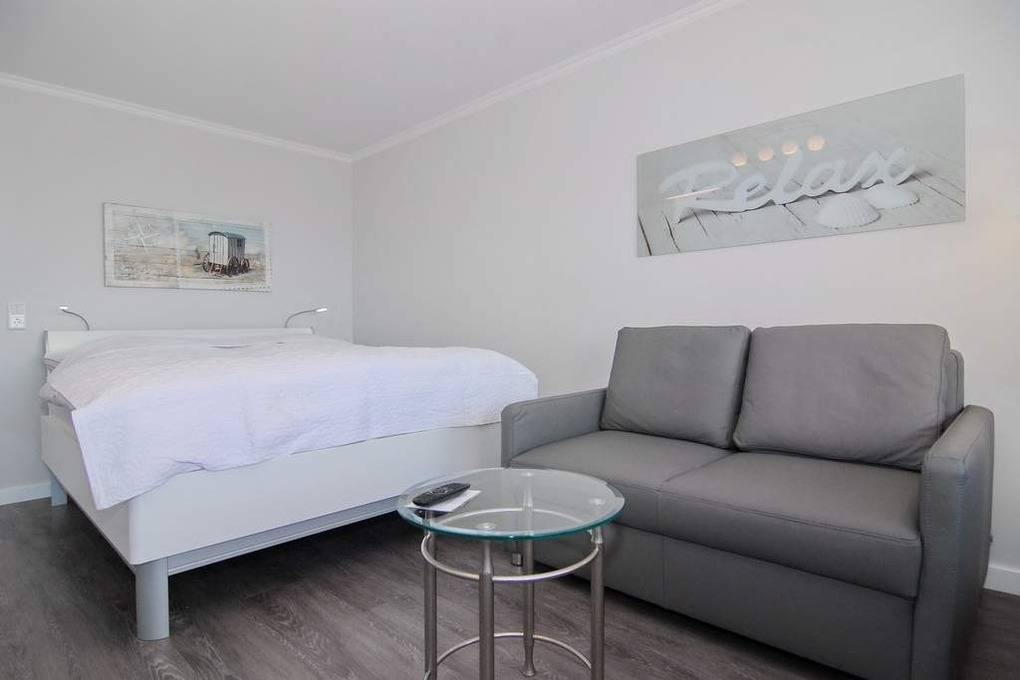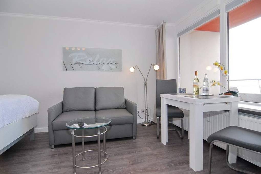 Modernes 1-Zimmer-Appartement im 2. OG zur Seeseite im "Haus am Meer", ca. 34 m², Nichtraucher-Whg.! Wohn-/Schlafraum mit Doppelbett (160x200), Zweisitzer Couch und Sessel sowie ein großer Kleiderschrank, Essplatz am Fenster mit Blick auf das Meer, Flat-TV, Radio und Telefon, W-Lan (ohne Gewähr), Westbalkon mit Balkonmöbeln, Küchenzeile im Flurbereich mit Backofen m. Grill und Geschirrspüler, Duschbad/WC. Das Appartement ist mit Designer Fußboden ausgelegt.Tierhaltung ist gestattet, muss aber angemeldet sein (keine Kampfhunde). Bettwäsche und Handtücher sind zur Anreise aufgezogen. Ein PKW-Stellplatz kann kostenpflichtig zugebucht werden.