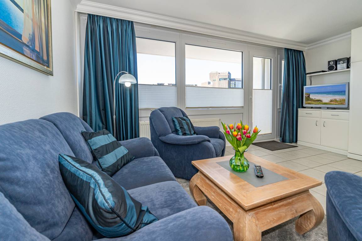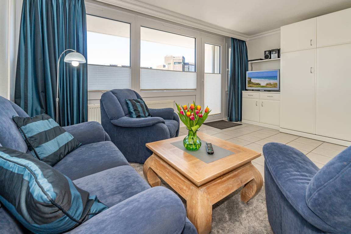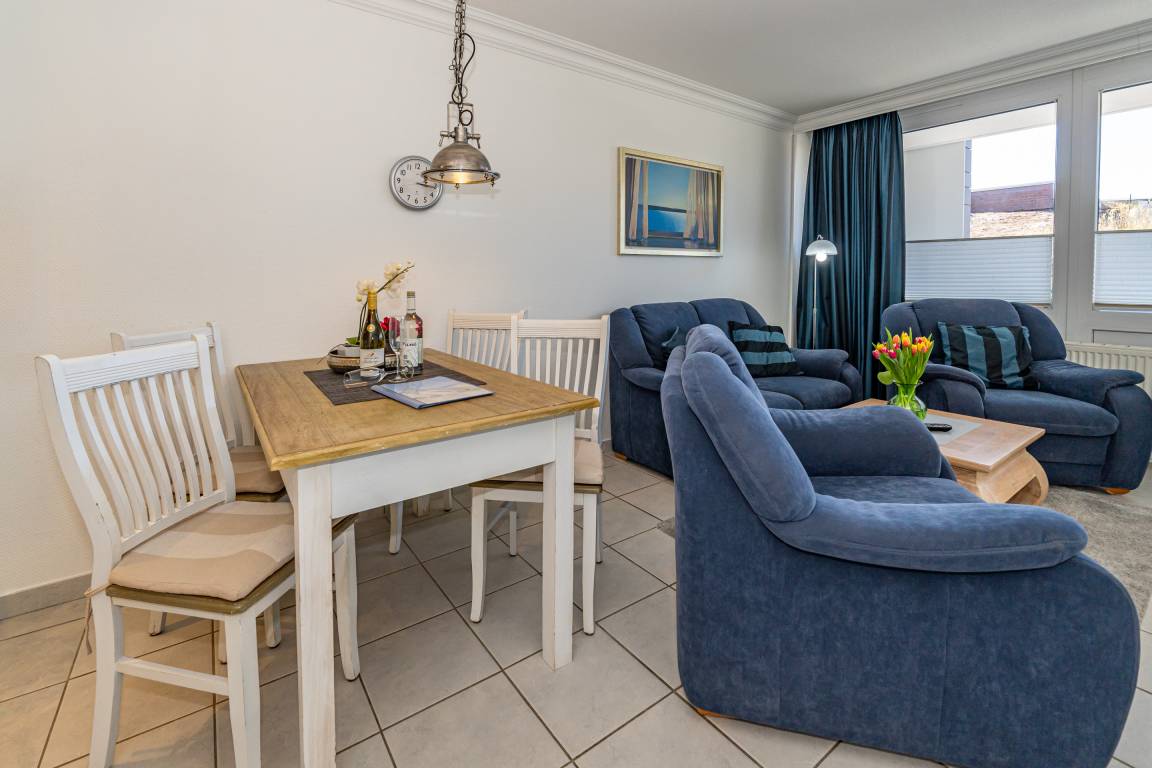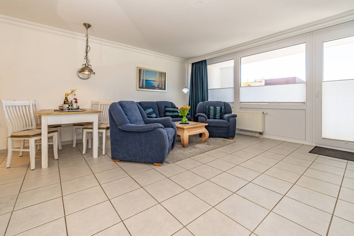 Der Wohnraum besteht aus einer bequemen Sitzgarnitur (2-Sitzer-Couch und zwei Sessel), einem Essplatz, einem Doppelschrankbett, Kabel-Flachbild-TV, HiFi-Anlage, und einer offenen Küche.