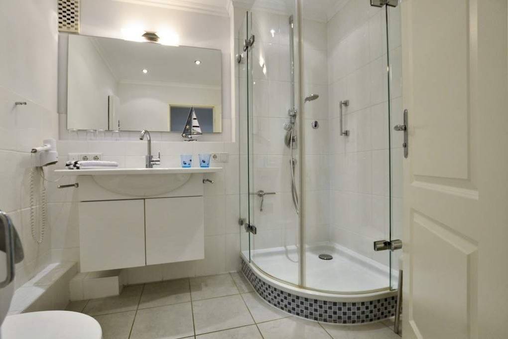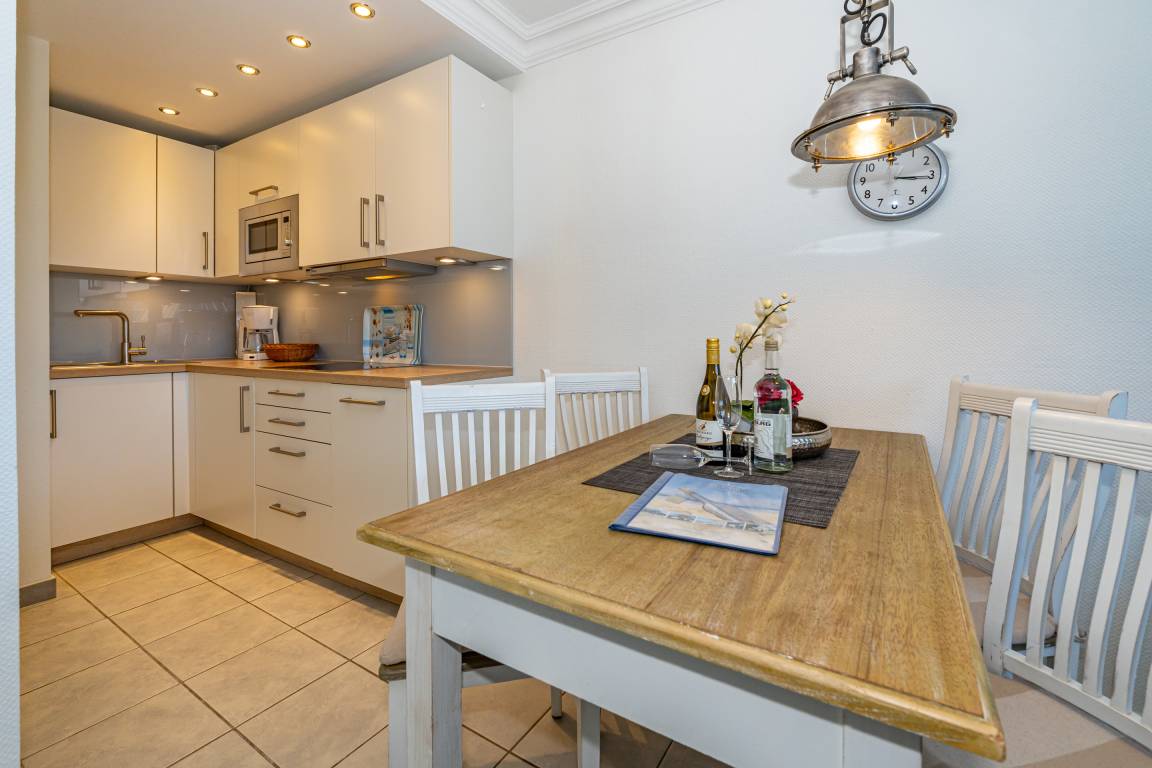 Komplett mit Fliesen ausgelegte 2-Zimmer-Nichtraucher-Ferienwohnung, ca. 51 qm im Hochparterre zur Seeseite mit Westloggia (Nachmittagssonne, mit Balkonmöbeln und Auflagen) für max. 4 Personen.