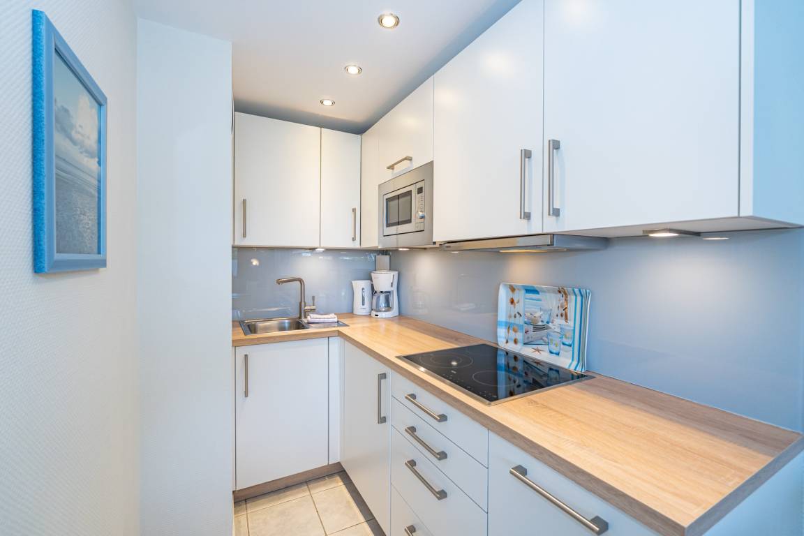 Die Küche hat einen Geschirrspüler, ein Ceranfeld (4 Kochfelder), eine Nespresso-Maschine, eine Mikrowelle mit Grillfunktion und einen Kühlschrank mit 3-Sterne-Gefrierfach.