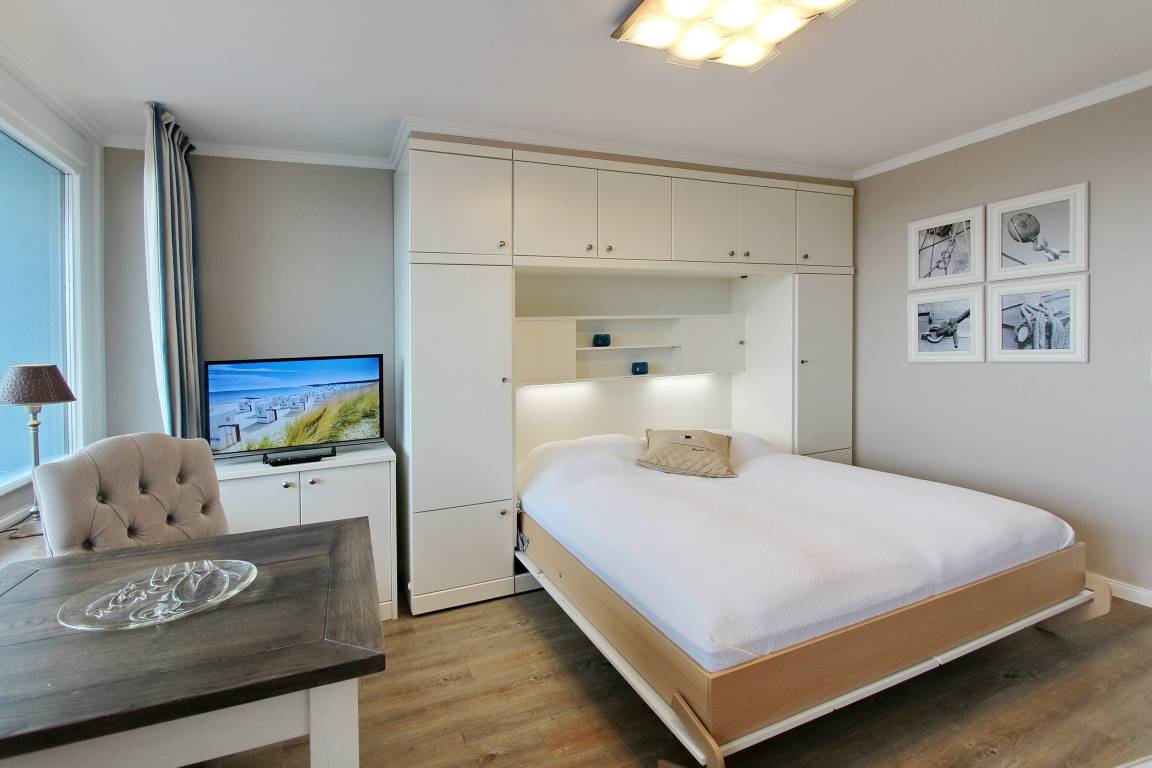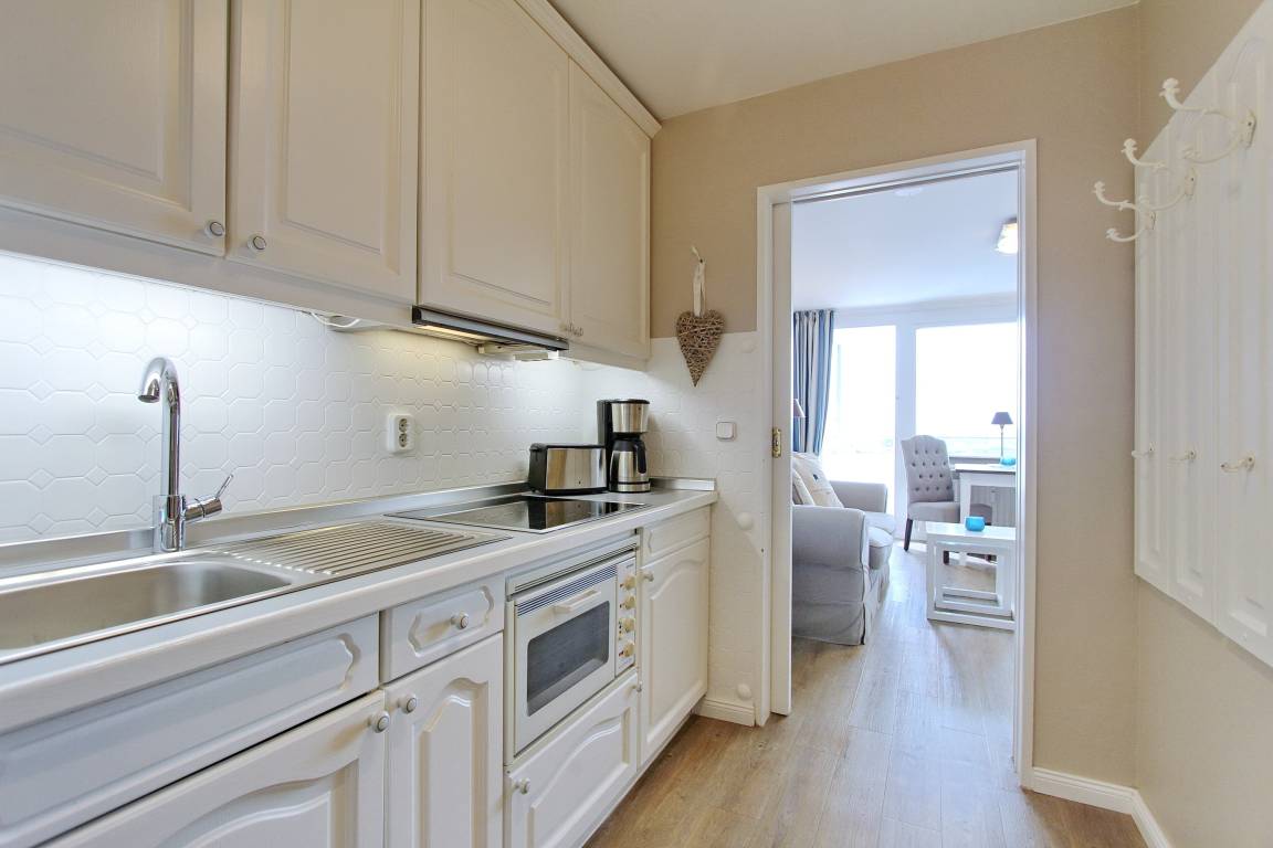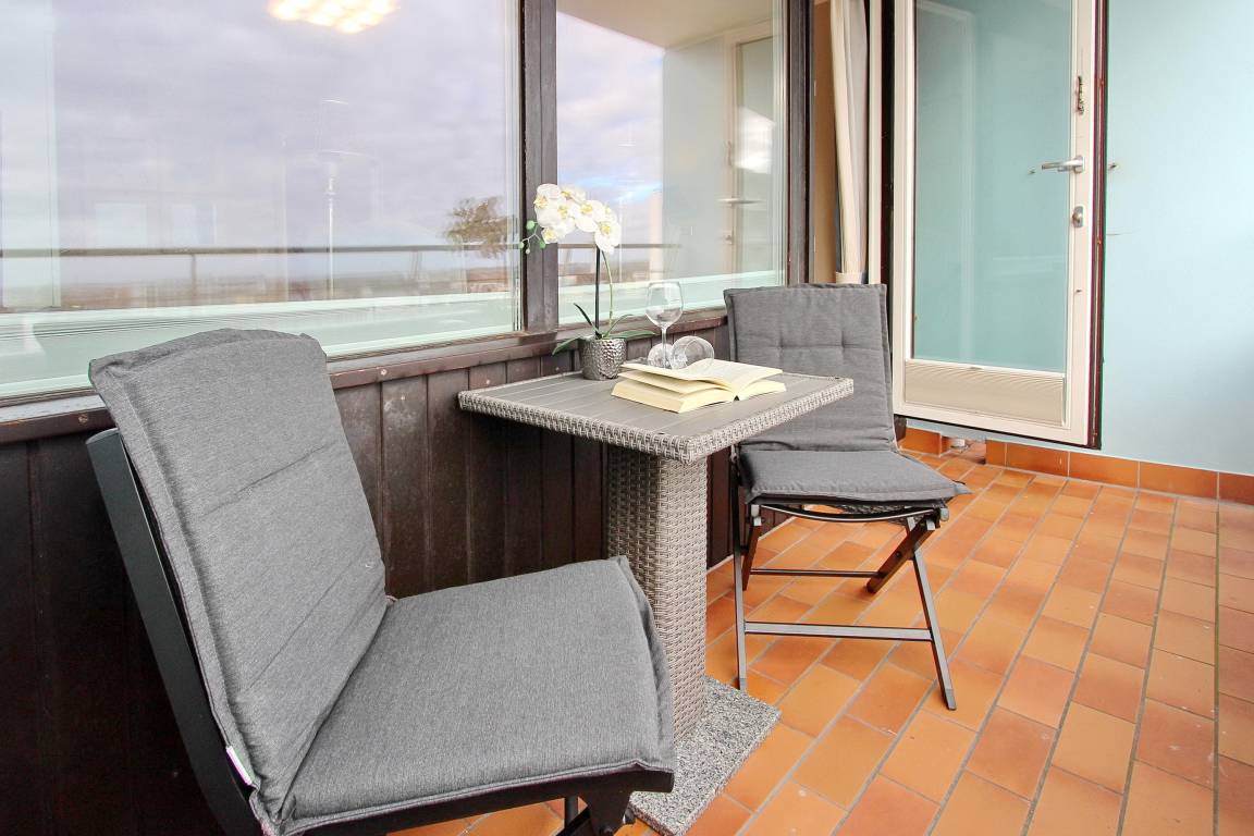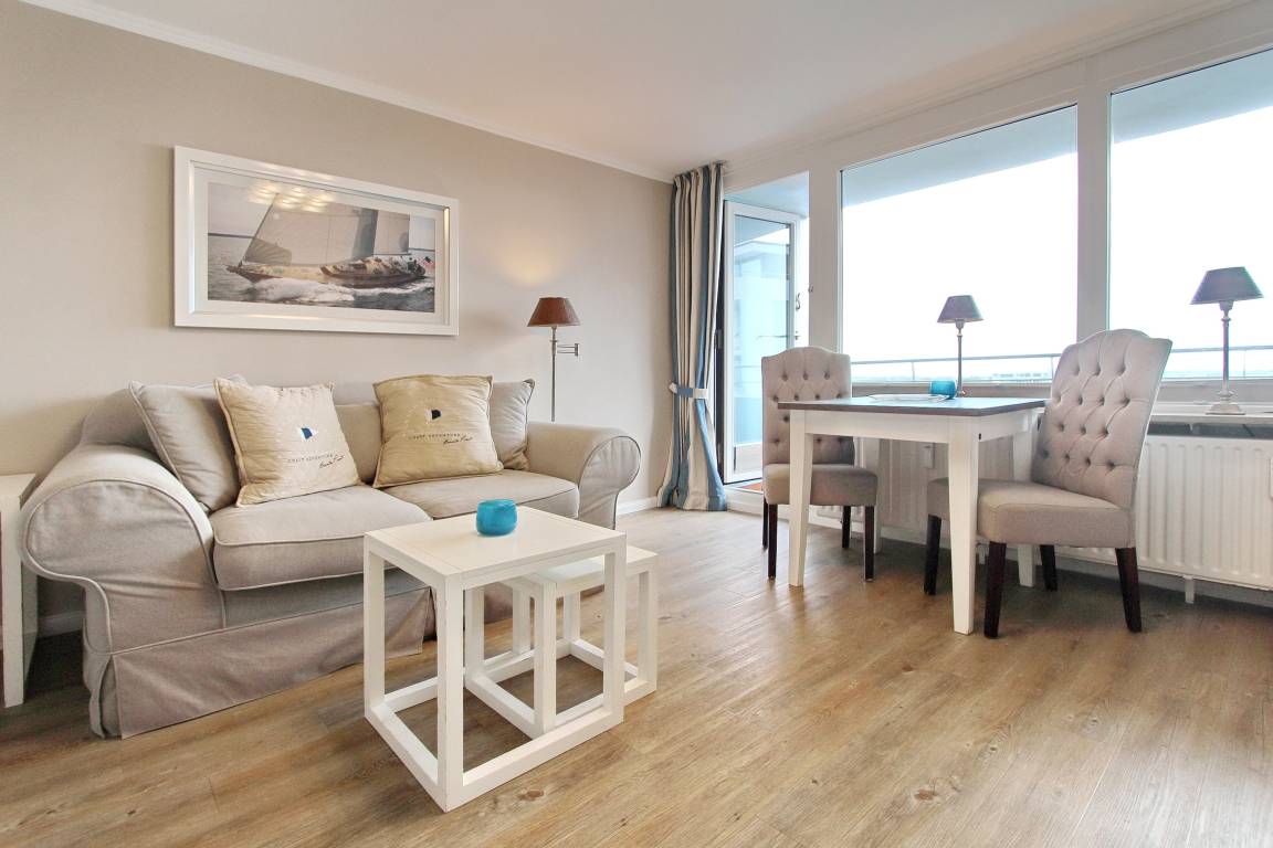 Hell und freundlich eingerichtetes Appartement im Haus Metropol in der 6. Etage, nur wenige Gehminuten vom Strand und Meer entfernt. Der kombinierte Wohn-/Schlafraum mit vorgelagertem Ostbalkon mit Balkonmöbeln ist neu und modern möbliert und hat ein sehr stimmiges Einrichtungskonzept. Die Wohnung hat einen Designfussboden in Holzoptik, ein große Couch, ein Doppelschrankbett (2 Matratzen) und einen Essplatz mit 2 bequemen Polsterstühlen am Fenster. Das helle Badezimmer hat eine Badewanne. Ein Haltegriff ermöglicht sicheres Ein- und Aussteigen. Um sich selbst zu verpflegen gibt es im Flur eine Küchenzeile mit Ceranfeld und eine Mikrowelle. Zur technischen Ausstattung gehört ein Flachbildfernseher und eine Stereoanlage. Das freie WLAN Netzwerk (WEG Haus Metropol - Passwortfrei - ohne Gewähr) können sie kostenfrei nutzen. Die Größe dieser Nichtraucherwohnung ist ca. 30 m².
