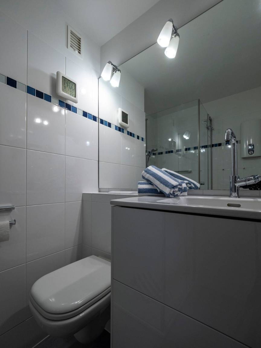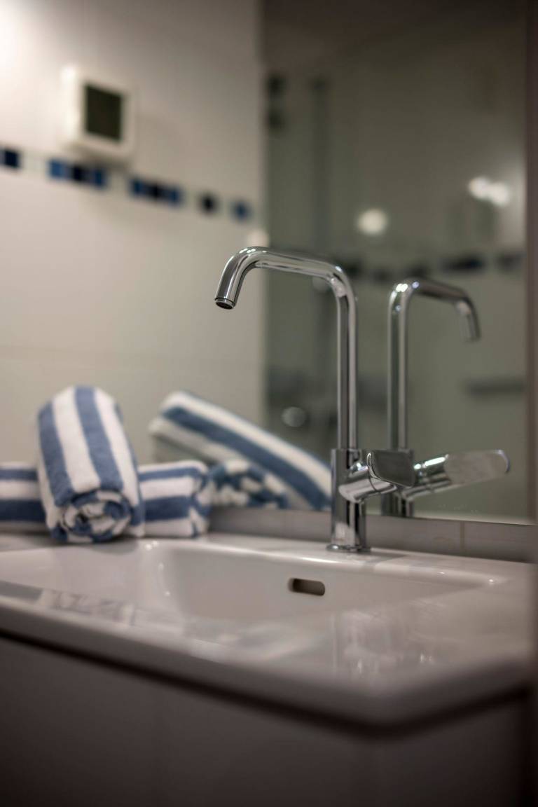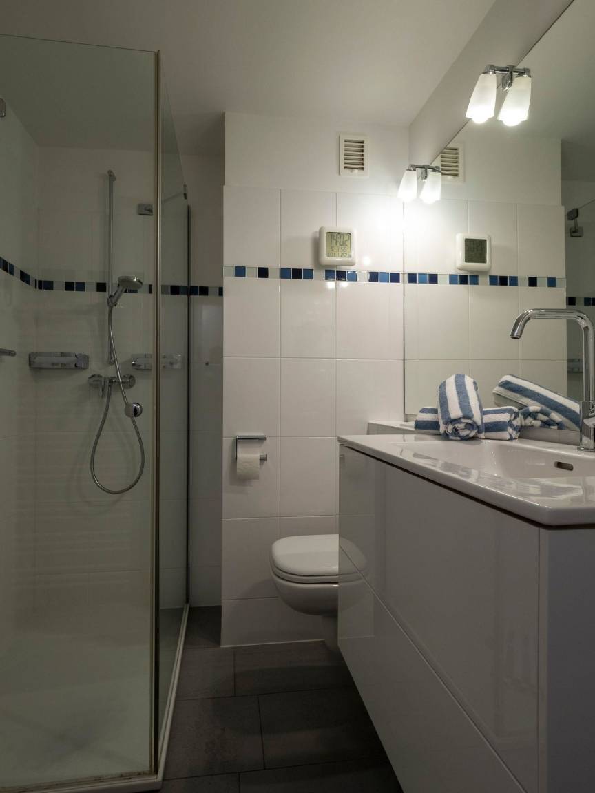 Im Bad befindet sich eine Dusche mit flachem Einstieg, ein WC, ein Waschtisch mit großem Spiegel, ein Handtuchtrockner und ein Fön.