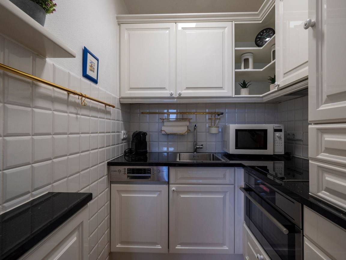Die Küche bietet einen Geschirrspüler, einen Herd mit Backofen und Ceranfeld(2Kochfelder), Mikrowelle, einen Kühlschrank mit Gefrierfach. Kaffeemaschine(Filter/Kapsel), Wasserkocher, Mixer, SodaStream, Geschirr gehören zur Grundausstattung.