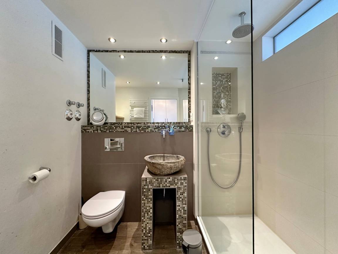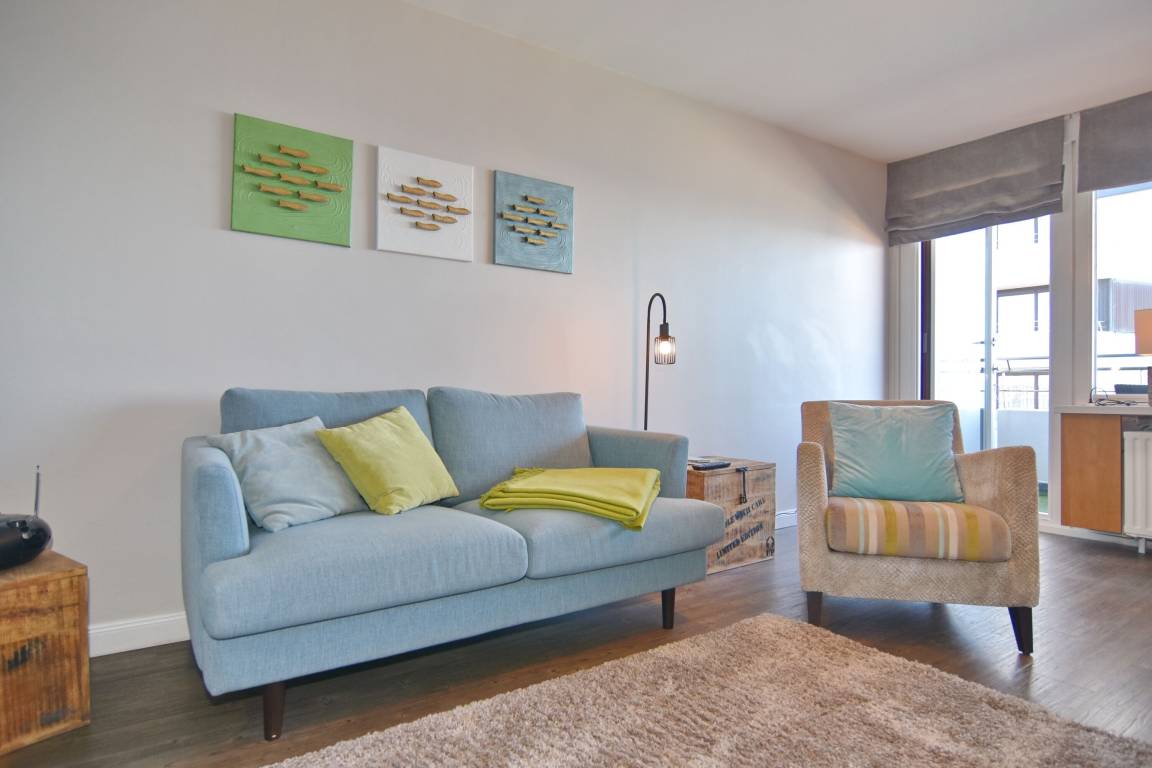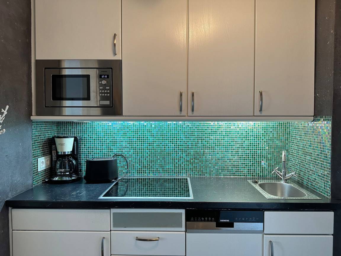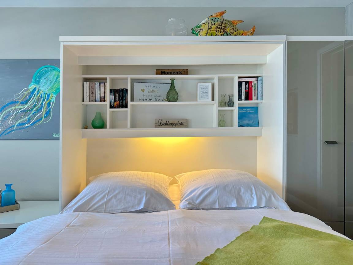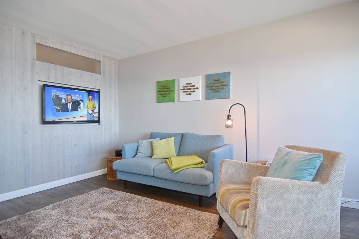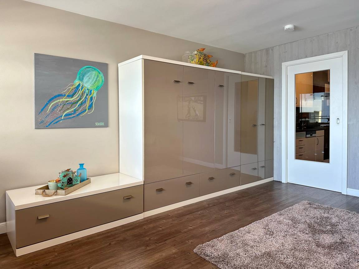 Die moderne 1-Zimmer-Wohnung befindet sich im 8. OG des Haus "Sylter Welle" zur Seeseite. Der kombinierte Wohn-/Schlafraum ist mit einem Doppelschrankbett, 2-Sitzer-Sofa und Sessel sowie einem Essplatz am Fenster ausgestattet. Der Fernseher ist in die Wand eingelassen. Die gut ausgestattete Küche liegt im Flurbereich und verfügt über einen 4-Platten-Ceranherd, Nespressomaschine, Mikrowelle und Geschirrspüler. Das edle Bad besticht mit seiner bodentiefen Glasdusche, dem Waschsteinbecken, der Regendusche und den kleinen Extras.. Die gesamte Wohnung ist mit Designboden in Holzoptik ausgelegt. Im Haus stehen Ihnen zwei Fahrstühle, hauseigenes WLAN-Netz (ohne Gewähr) sowie eine gemeinschaftliche Waschküche zur Verfügung. Ein Pkwstellplatz kann bei Verfügbarkeit kostenpflichtig dazu gebucht werden. Ein Hund kann gegen Gebühr und Anmeldung mitgebracht werden.