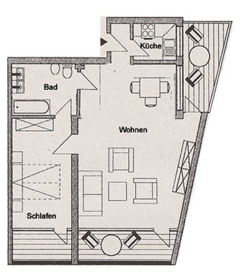 Die Wohnung Nr. 22 ist eine 2-Zimmer-Wohnung mit ca. 88 qm Wohnfläche. Es hat ein Schlafzimmer mit Doppelbett, eine voll ausgestattete Küche mit einem 4-Platten-Herd, Backofen, Geschirrspüler, sowie eine Mikrowelle. Ein Bad mit Badewanne, Duschvorrichtung und 2 Waschbecken steht Ihnen ebenfalls zur Verfügung. Im einfach eingerichteten großen Wohnraum befinden sich zwei rote Sofas, ein Sessel, ein Essplatz und eine weiße Appartementwand mit einem ausklappbaren Einzelbett.