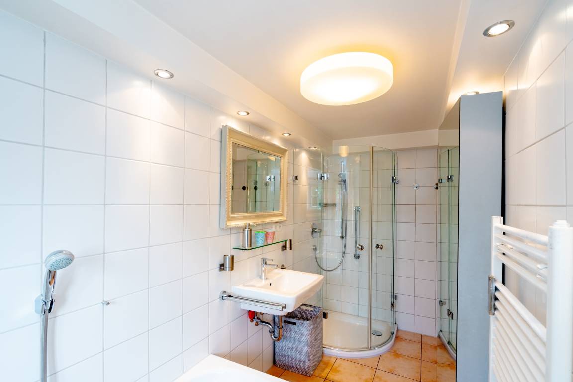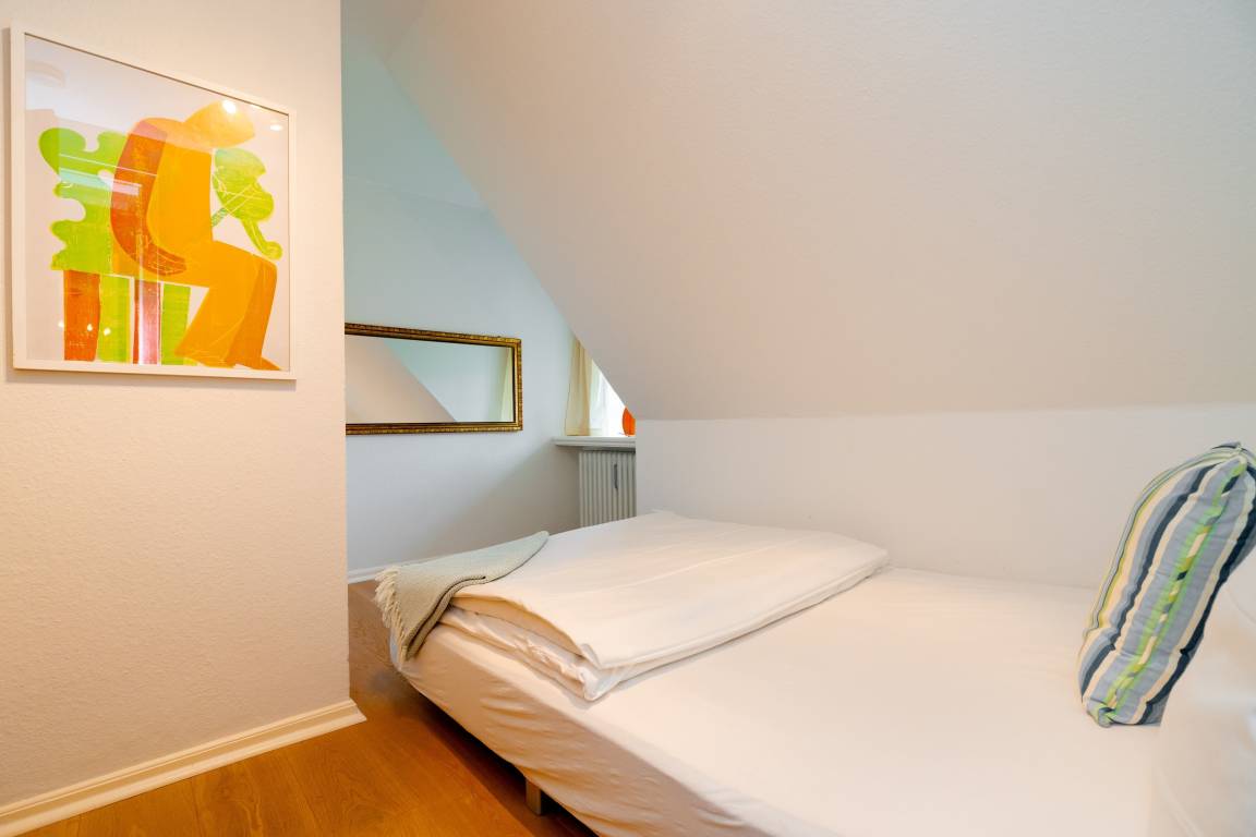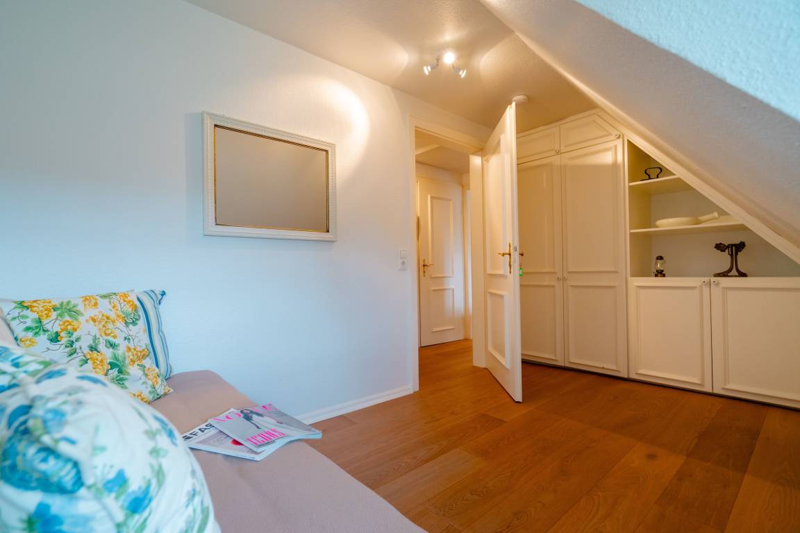 Im Obergeschoss befinden sich die Schlafzimmer sowie ein ganz besonderes Extra: die hauseigene Sauna, die Sie während Ihres Aufenthalts jederzeit genießen können. Zwei Schlafzimmer sind mit Doppelbetten ausgestattet, ein weiteres Zimmer mit Einzelbett kann auf Anfrage hergerichtet werden. Damit bietet das Haus sowohl Rückzugsmöglichkeiten als auch ausreichend Platz für gemeinsame Urlaubstage.