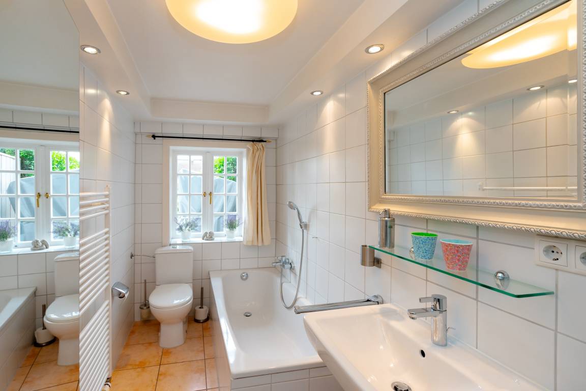 Im Erdgeschoss empfängt Sie ein gemütlicher Wohn- und Essbereich mit dekorativem Kamin, einladender Sofaecke und angenehmer Wohnatmosphäre. Die umfassend ausgestattete Küche bietet alles, was Sie für einen entspannten Aufenthalt benötigen. Das Badezimmer ist sowohl mit Badewanne als auch mit Dusche ausgestattet und sorgt zusammen mit der vorhandenen Waschmaschine für zusätzlichen Komfort im Urlaub.