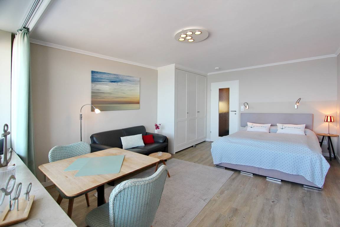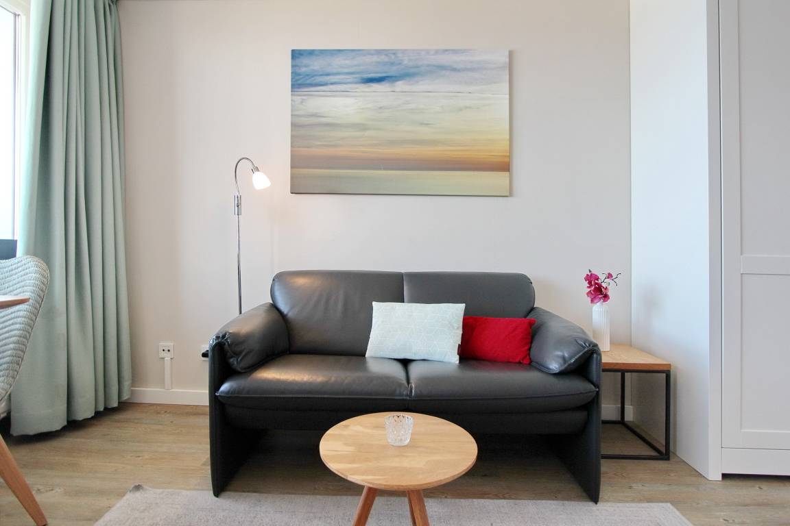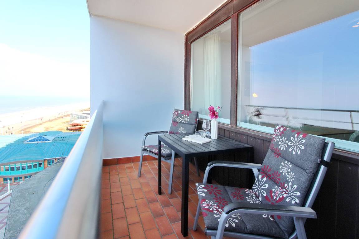 Diese Einzimmerwohnung in der 6. Etage im Haus Metropol hat einen traumhaften Blick auf den Strand und die Nordsee. Der Wohn-/Schlafraum mit vorgelagertem Westbalkon (inkl. Balkonmöbeln von Kettler) wurde hochwertig und neu gestaltet. Er hat einen Designfußboden in Holzoptik, ein von beiden Seiten begehbares Boxspringbett, einen Essplatz mit 2 Stühlen am Fenster und ein Ledersofa mit Tischen. Die Fenster haben Plissees als Sonnenschutz und auch Verdunklungsvorhänge. Im Badezimmer lädt eine Badewanne zum Entspannen ein und einen beheizten Handtuchtrockner gibt es ebenfalls. Die sehr gut ausgestattete Einbauküche im Flur besitzt ein Cerankochfeld und einen Backofen. Zur technischen Ausstattung dieser Nichtraucherwohnung gehören ein schwenkbarer Flachbildfernseher, eine Bluetoothanlage mit NFC und 2 USB Ladesteckdosen. Ein freies WLAN-Netzwerk (WEG Haus Metropol - Passwortfrei - ohne Gewähr) steht Ihnen kostenfrei zur Verfügung. Wohnungsgröße: ca. 34 m²