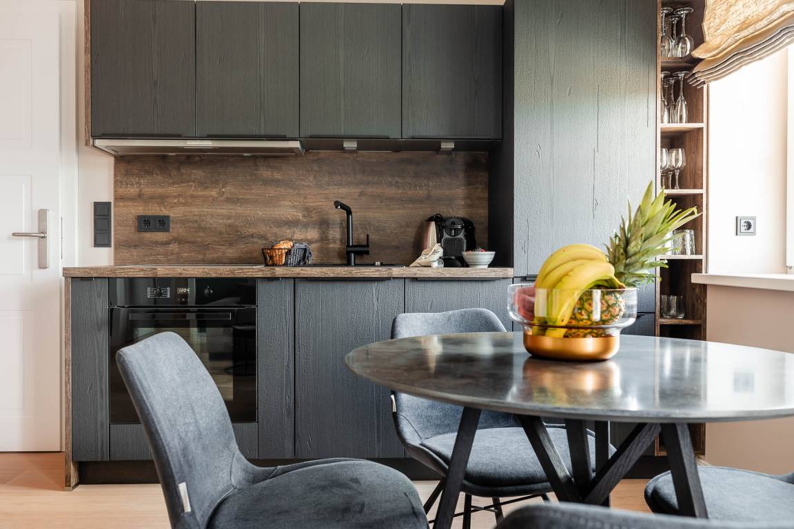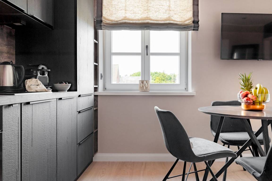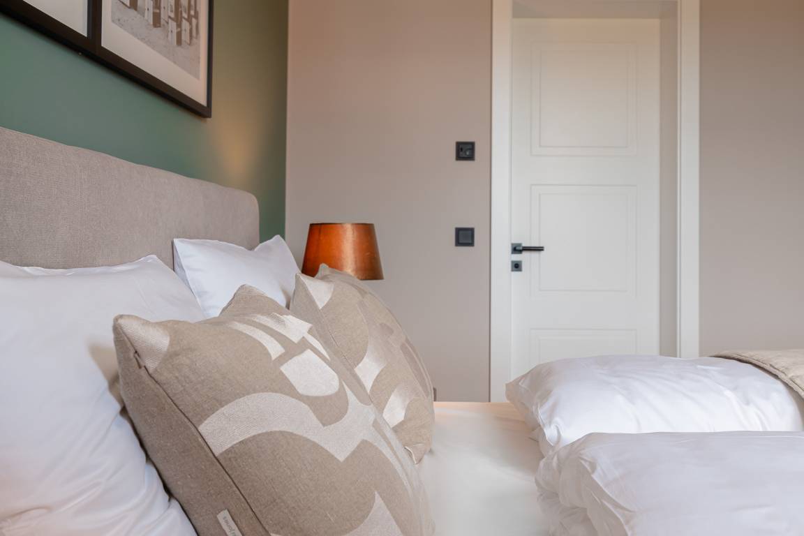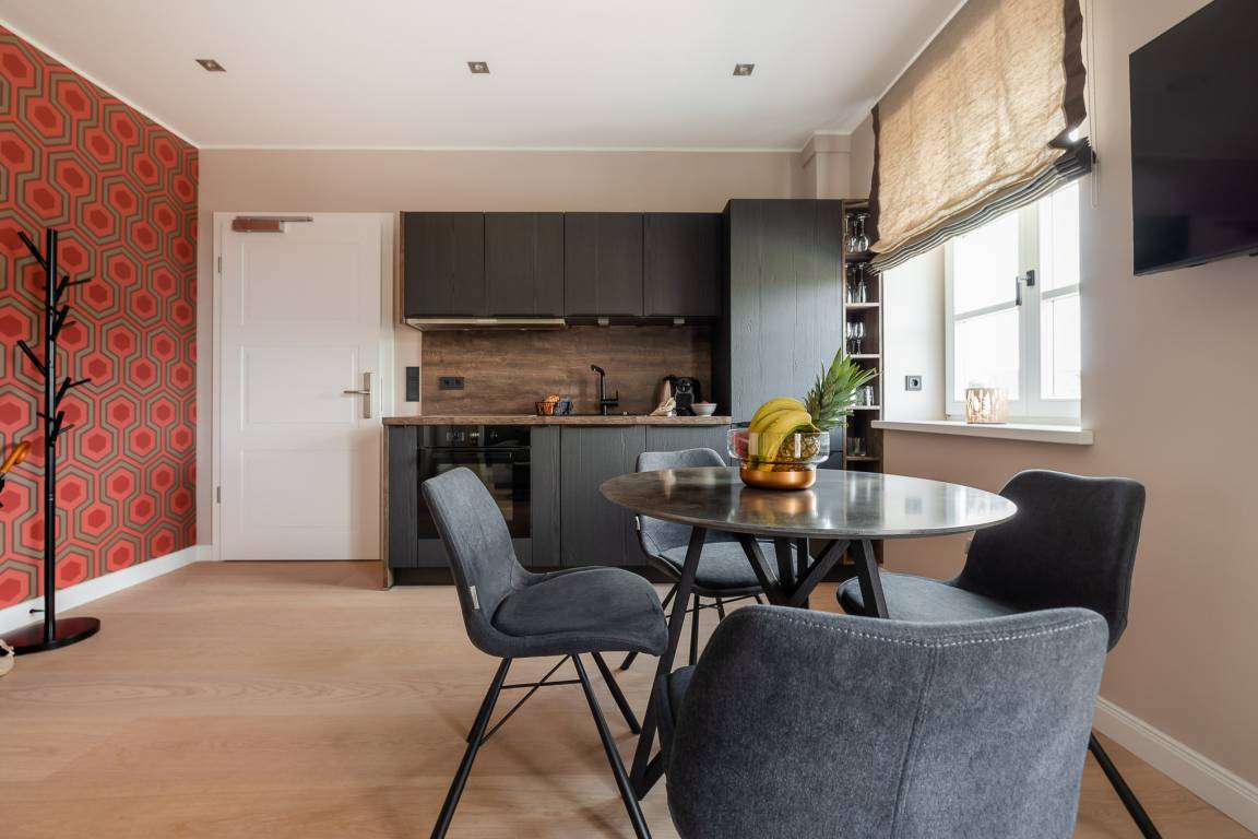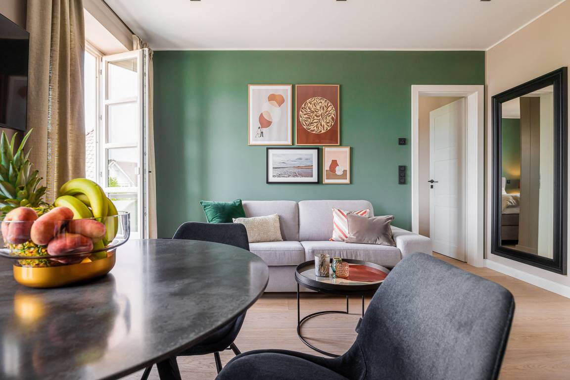 Helle, lichtdurchflutete Räume, klares Design und ausgewählte Materialien schaffen eine angenehme Balance aus Ruhe und urbaner Leichtigkeit. Der Wohn- und Essbereich öffnet sich direkt zum westlich ausgerichteten Balkon. Ein wunderbarer Ort, um an warmen Abenden den Sonnenuntergang bei einem Glas Wein zu genießen. Im Wohnbereich befindet sich zudem ein bequemes Schlafsofa für zusätzliche Flexibilität.