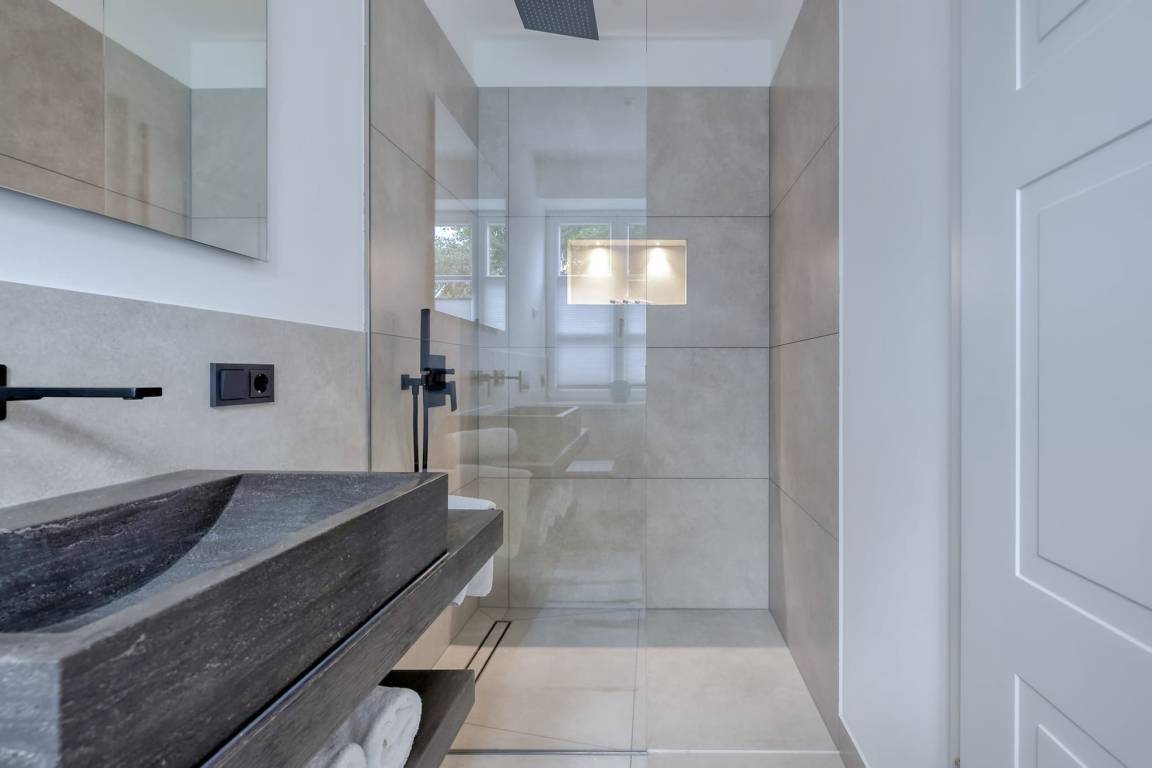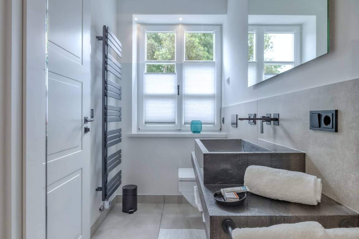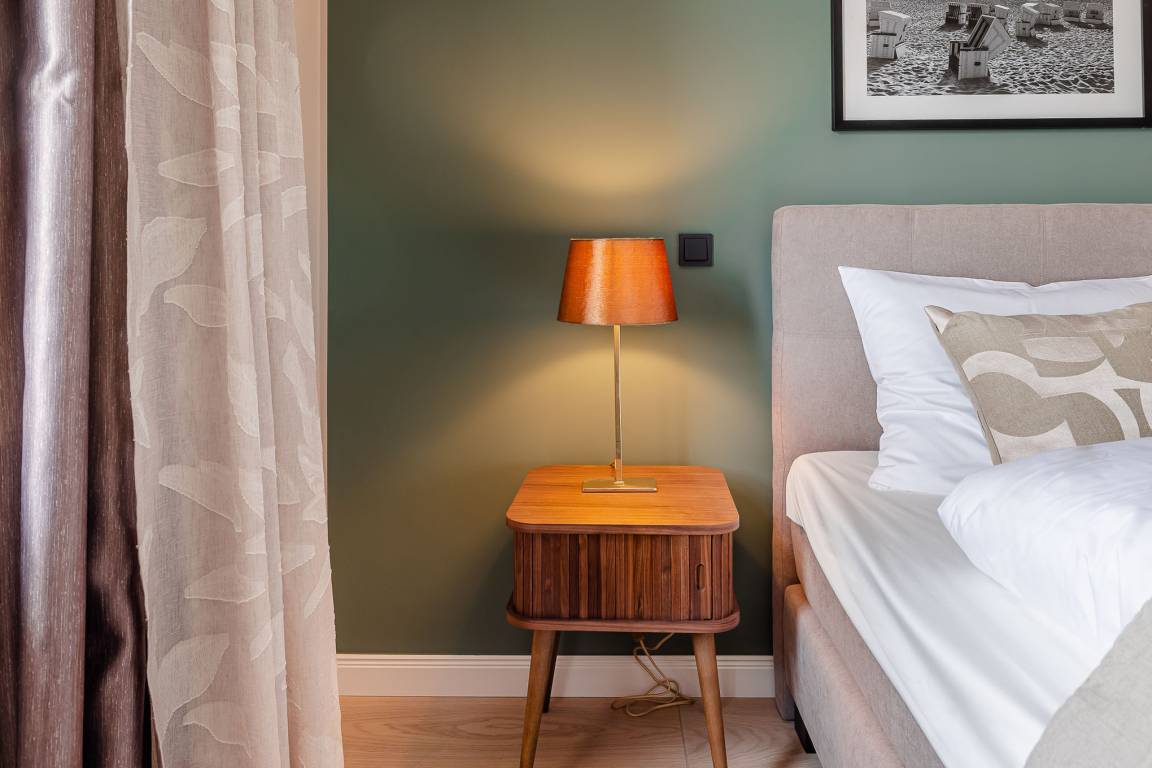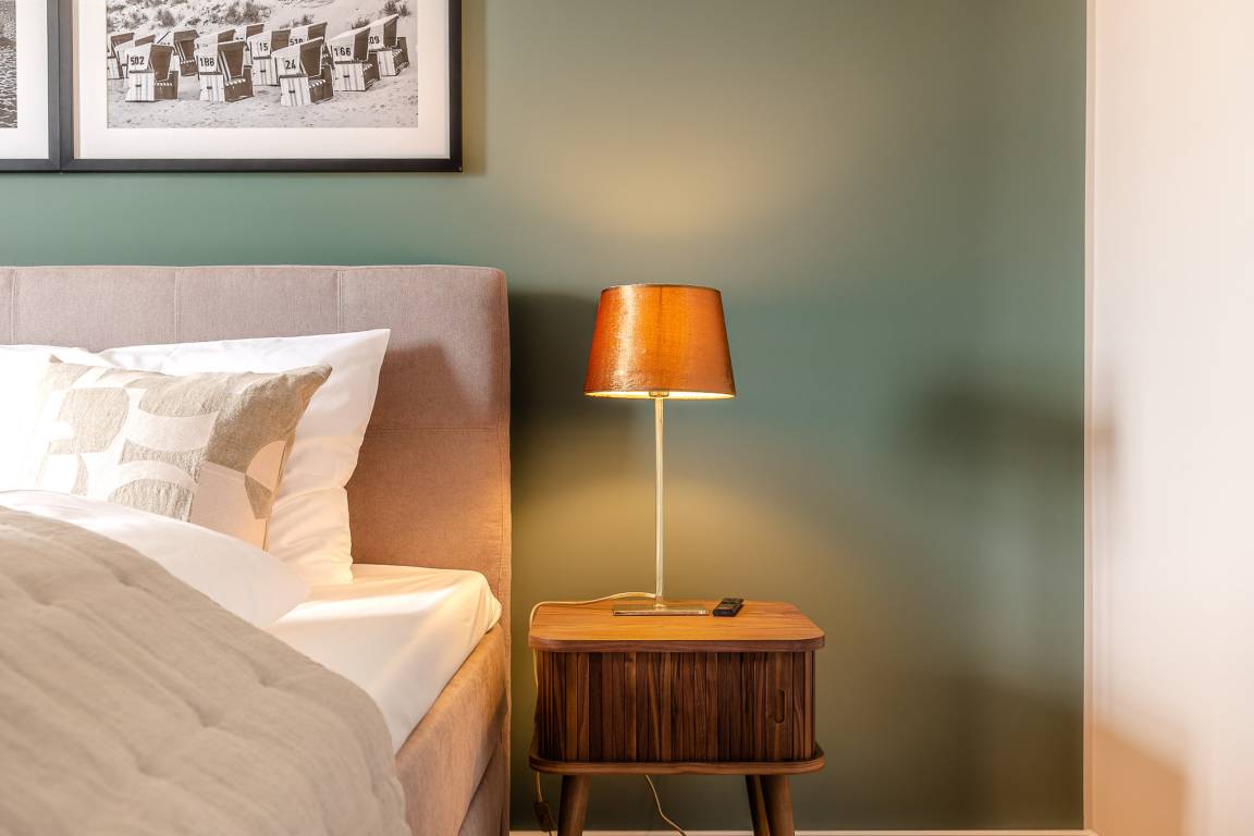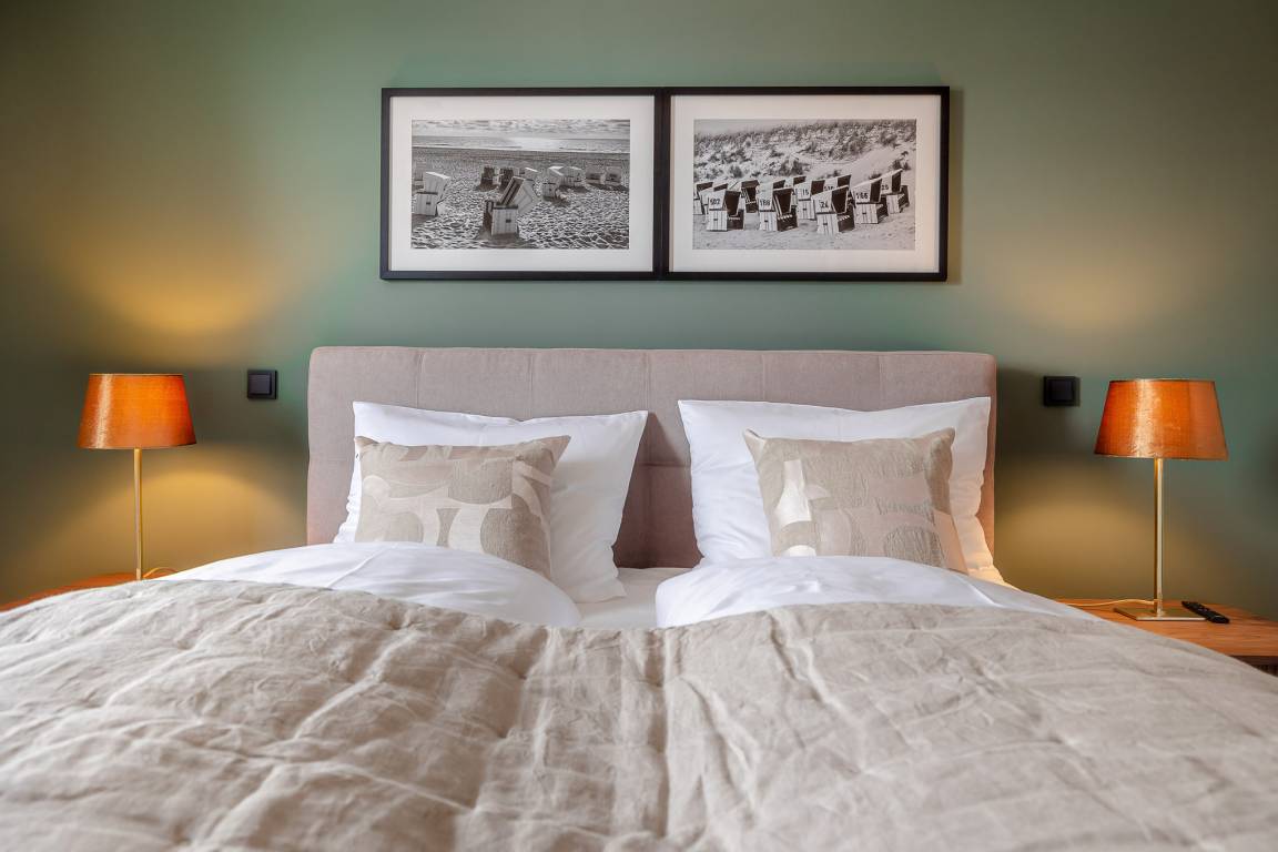 Das Schlafzimmer ist mit einem großen, komfortablen Boxspringbett ausgestattet und lädt zu erholsamen Nächten nach langen Strandspaziergängen ein. Das moderne Badezimmer verwöhnt Sie mit einer großzügigen Regendusche, ideal für entspannte Momente nach einem aktiven Tag. Fußbodenheizung im gesamten Apartment sorgt das ganze Jahr über für wohlige Wärme.