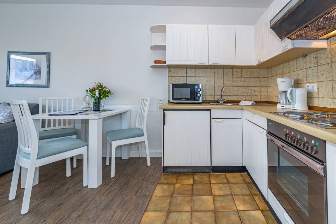 Die Küchenzeile hat einen 4-Platten-Herd mit Backofen, eine Mikrowelle, einen Kühlschrank. Kaffeemaschine, Wasserkocher und Toaster gehören zur Grundausstattung.