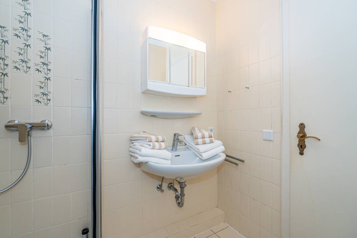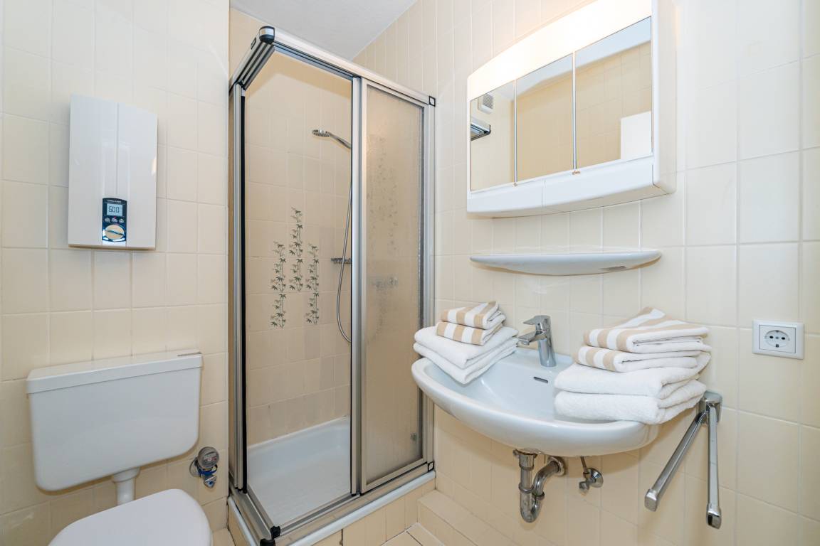 Das Badezimmer ist mit einer Dusche, einem Waschtisch und einem WC ausgestattet.