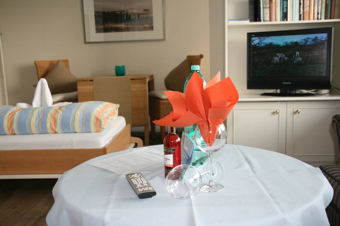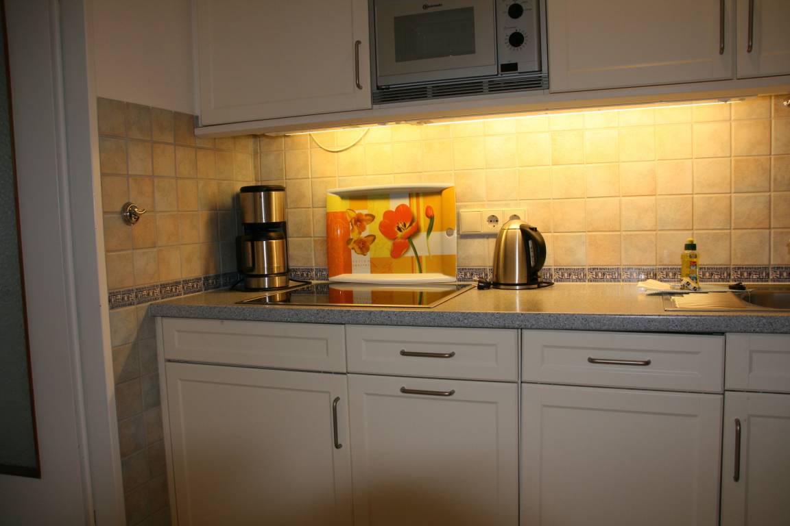 Vorflur mit moderner Küchenzeile mit Geschirrspüler, modernes neues Duschbad / WC, großer Wohn-/Schlafraum mit zwei Einzelschrankbetten, KEIN Teppichboden, Sitzgarnitur, Essplatz, Flachbildfernseher, CD-Player mit Radio, hauseigenes freies WLAN.