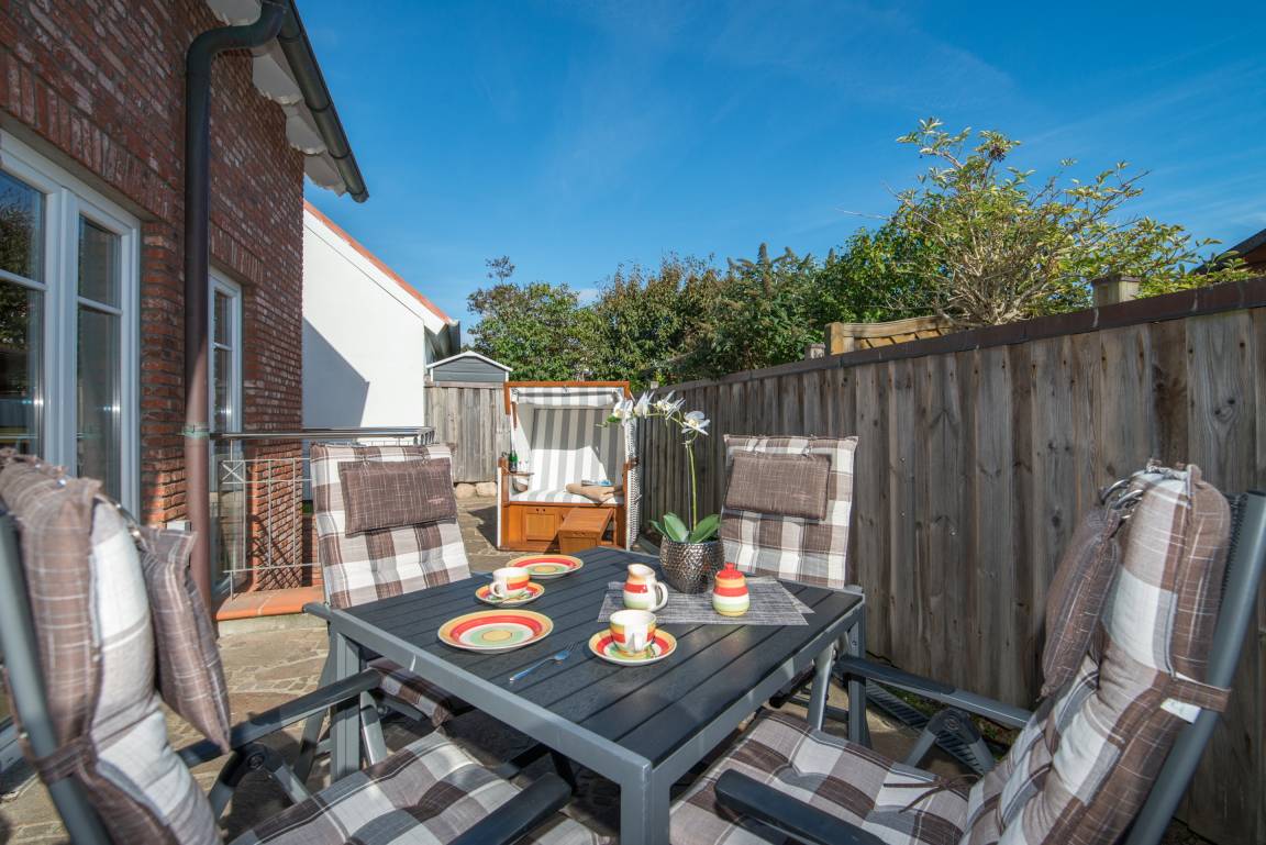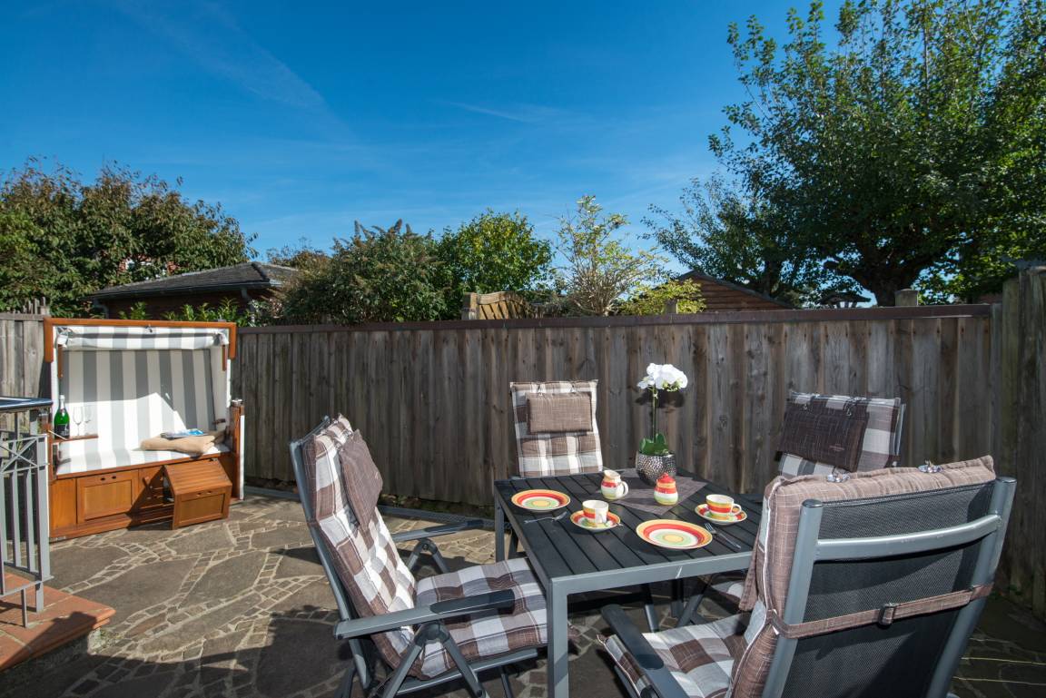 Die nach Südosten ausgerichtete Sonnenterrasse bietet einen Saison-Strandkorb (ca. vom 01. April bis 15.Oktober) und Gartenmöbel mit Auflagen.