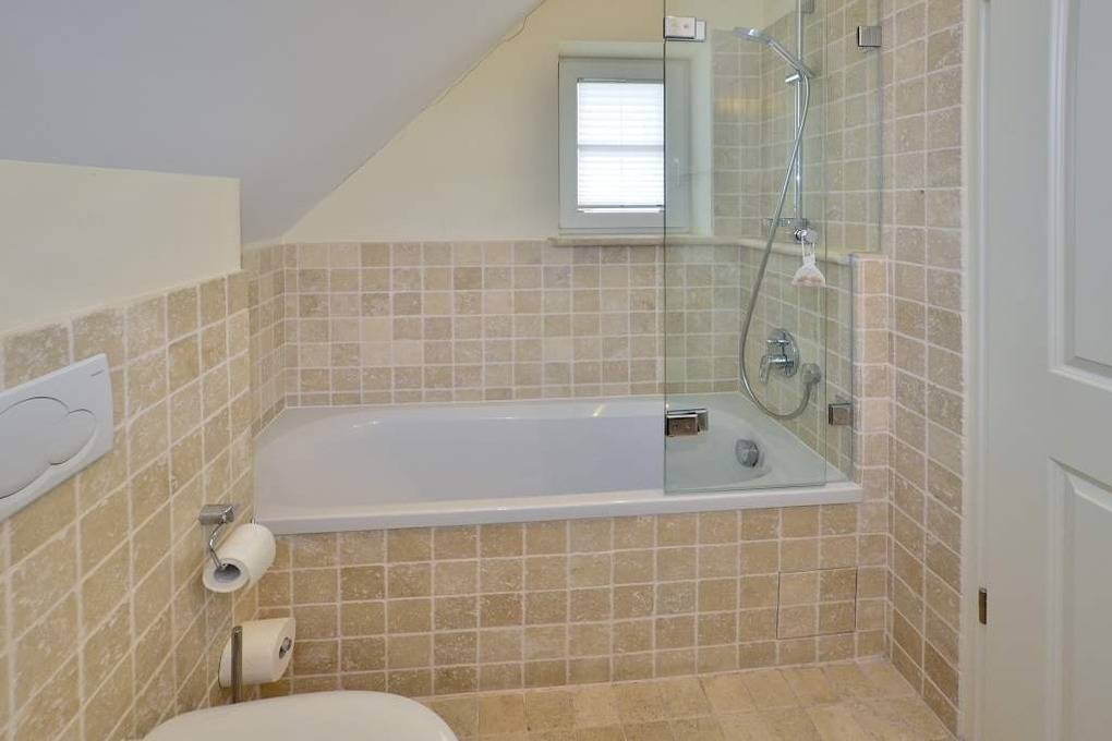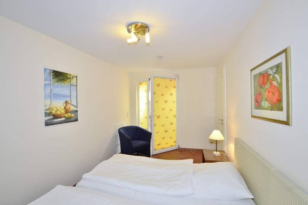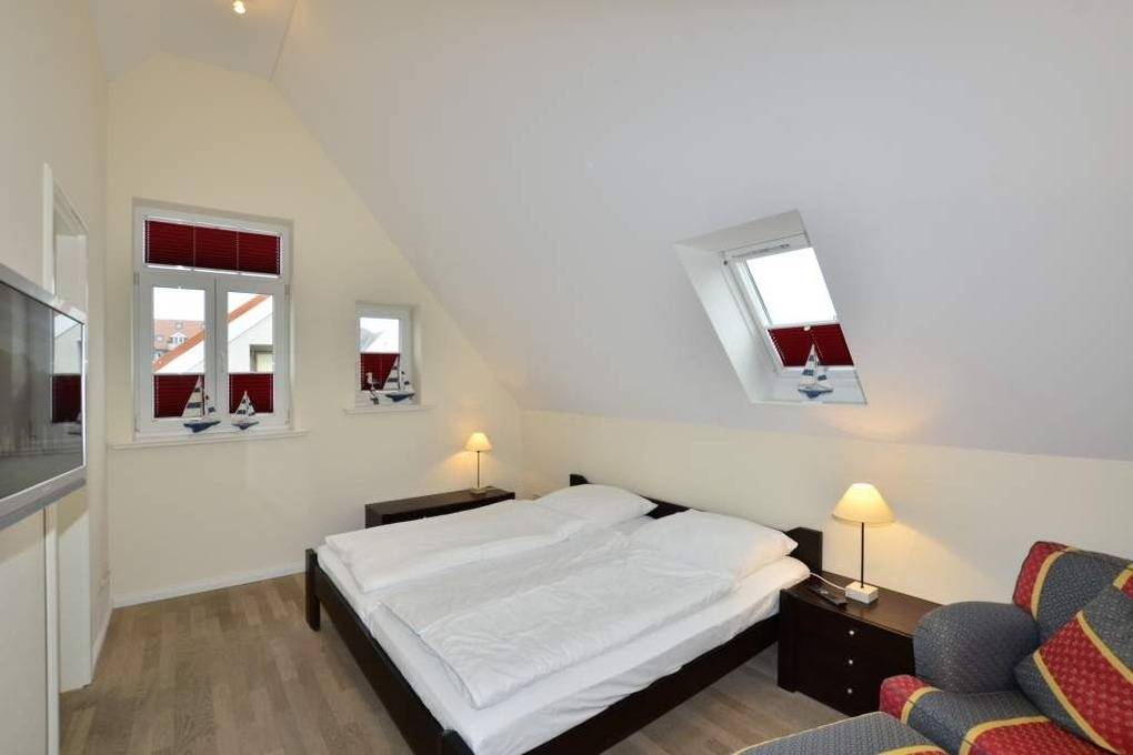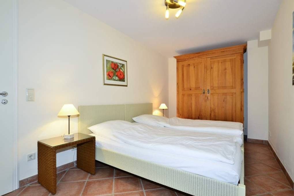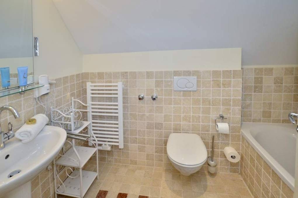 Das 1. geräumige Schlafzimmer hat ein gutes Doppelbett (mit zwei Einzelmatratzen 0,90 x 2,00 m) und einem Flachbildfernseher, sowie ein schickes Wannenbad/WC mit Föhn.