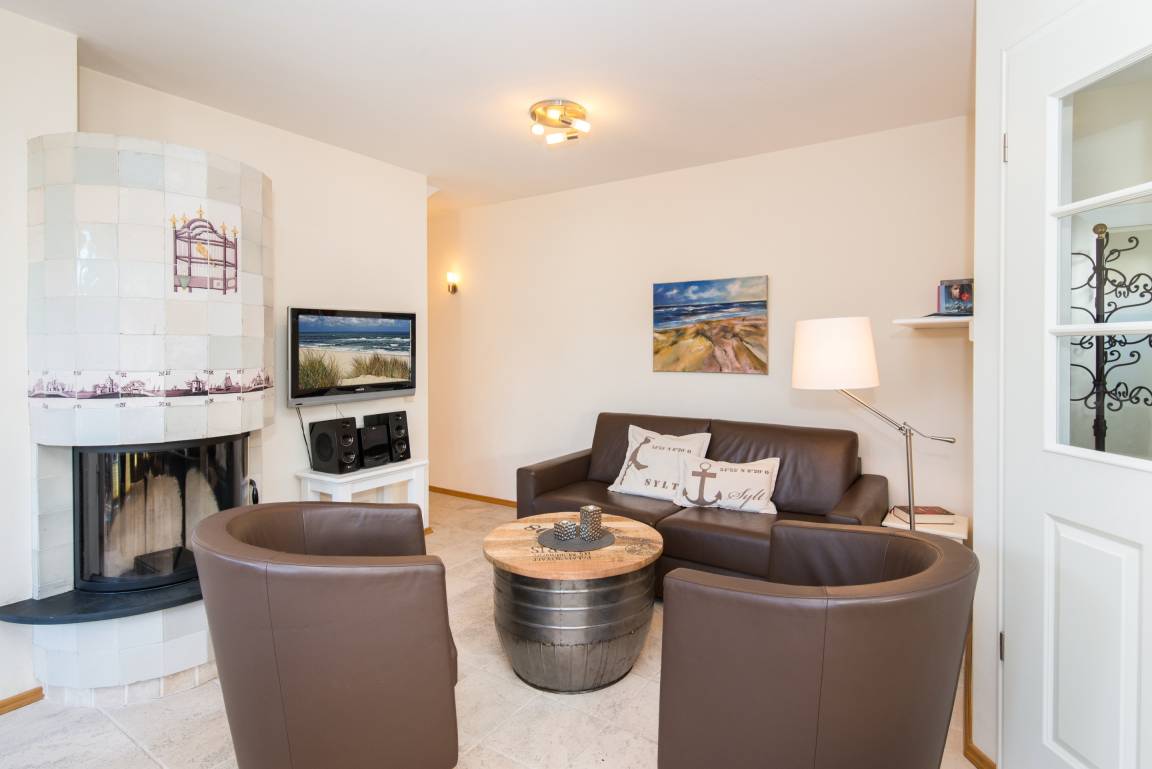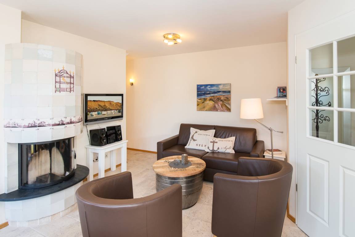 Das Wohnzimmer ist mit einem Zweisitzer-Sofa, zwei Sesseln, einem Essplatz und einem aufwendig gemauerten Kamin (umrahmt von echten Delfter-Fliesen) ausgestattet und hat eine offene, gut ausgestattete Küche.