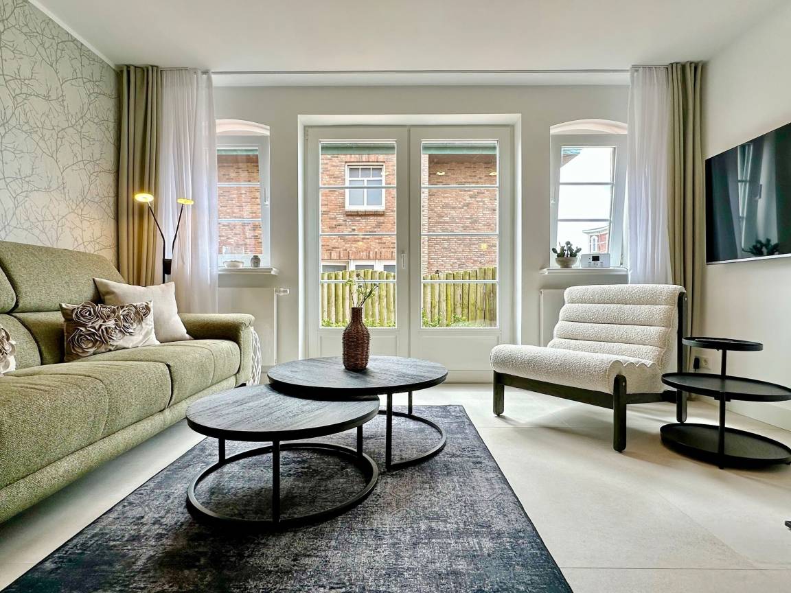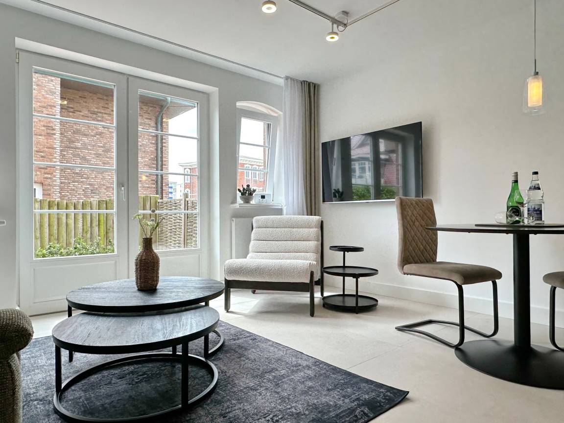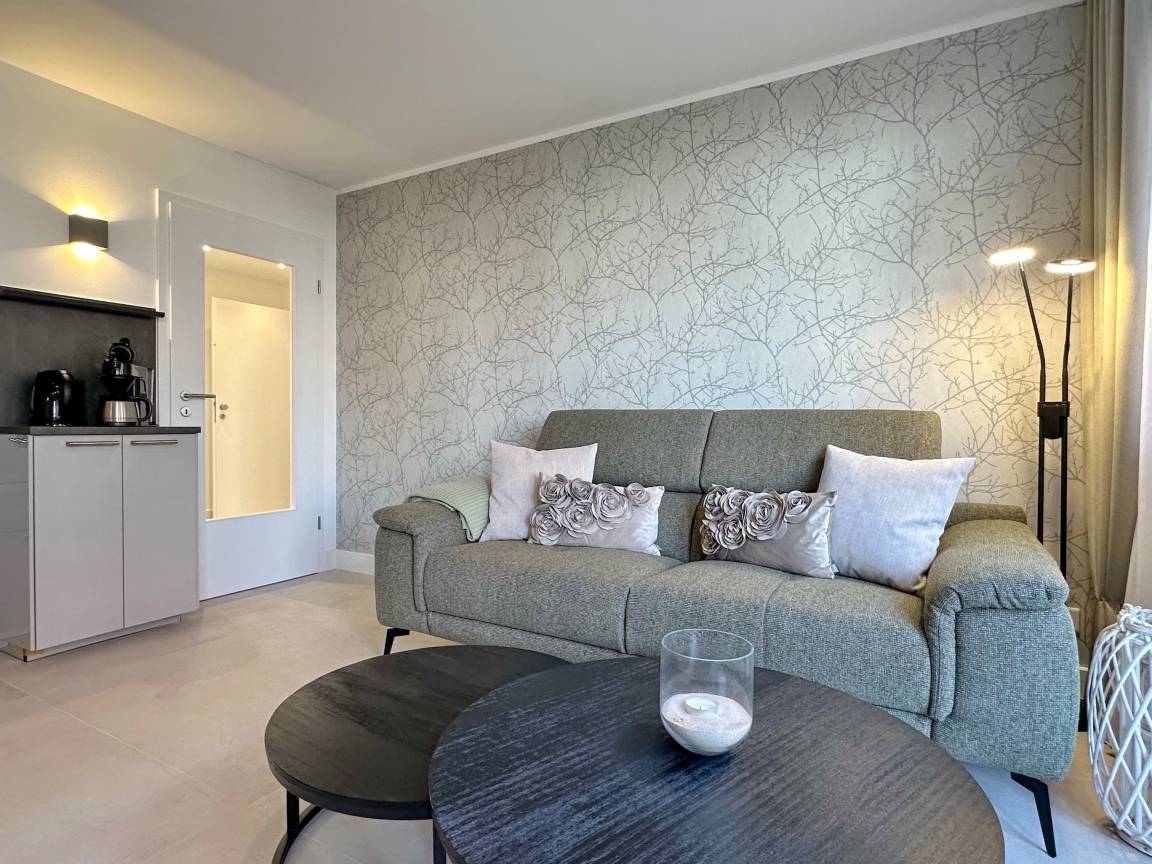 Die Wohnanlage "Olympia" bietet eine zentrale Lage in kurzer Entfernung zur Promenade, dem Badestrand und dem Meer. Auch die Fußgängerzone ist nur wenige Gehminuten entfernt. Die 2-Zimmer-Wohnung wurde im Jahr 2025 renoviert und ist für 2 Personen geeignet. Sie hat eine Größe von ca. 43 m² und besteht aus einem Wohn- und Esszimmer mit Couchecke, Essplatz und integrierter Küche. Die Küche ist mit einem Induktionskochfeld, einem Geschirrspüler und einer Mikrowelle mit Grillfunktion ausgestattet. Vom Wohnzimmer aus gelangt man auf die geschützte und möblierte Südterrasse. Im Schlafzimmer befindet sich ein Box-Spring-Doppelbett, Einbauschränke und ein weiterer Flat-TV. Das moderne Duschbad verfügt über ein Fenster. Im Dielenbereich befinden sich Einbauschränke und eine Garderobe für Jacken und andere Dinge. WLAN steht zur Verfügung, jedoch ohne Gewähr. Das Mitbringen von Haustieren und das Rauchen sind nicht gestattet. Bei Anreise sind Bettwäsche und Handtücher bereits aufgezogen. Die Wohnanlage verfügt über einen Schwimmbad- und Saunabereich sowie einen zusätzlichen Wellnessbereich mit finnischer Sauna, Dampfsauna und Ruhebereich. Fahrzeuge können gegen Gebühr und vorheriger Anmeldung in der Tiefgarage abgestellt werden. Eine Waschmaschine und ein Trockner stehen kostenfrei zur Verfügung. Für Fahrräder gibt es einen Abstellbereich in der Garage