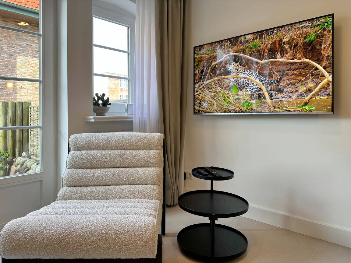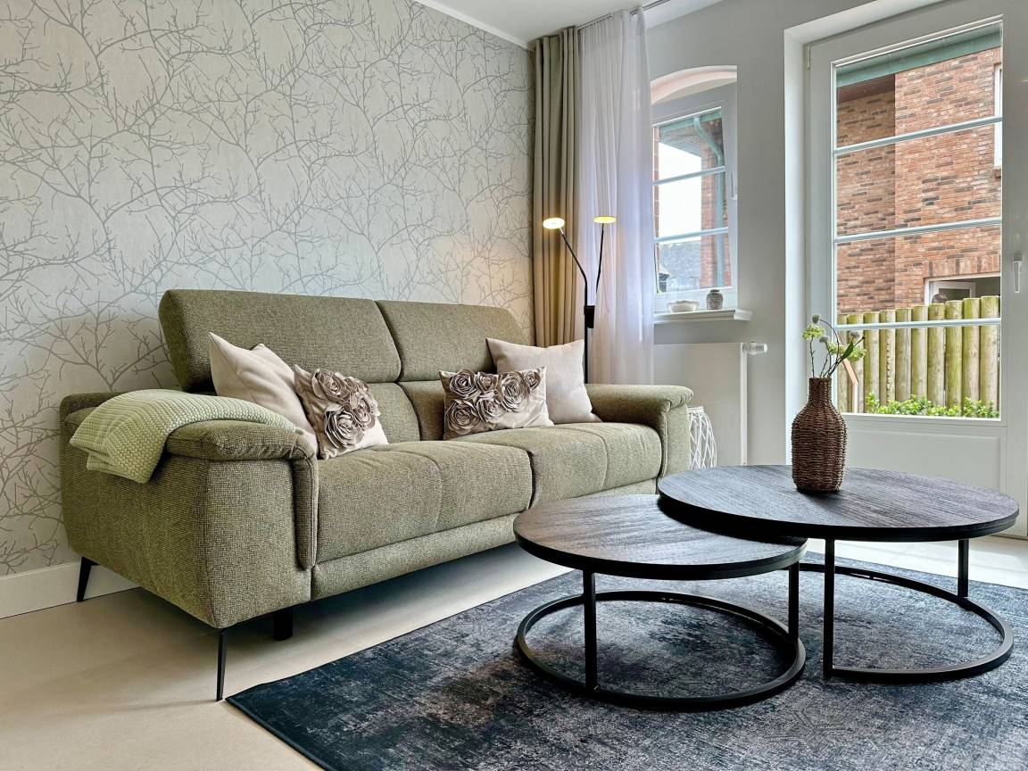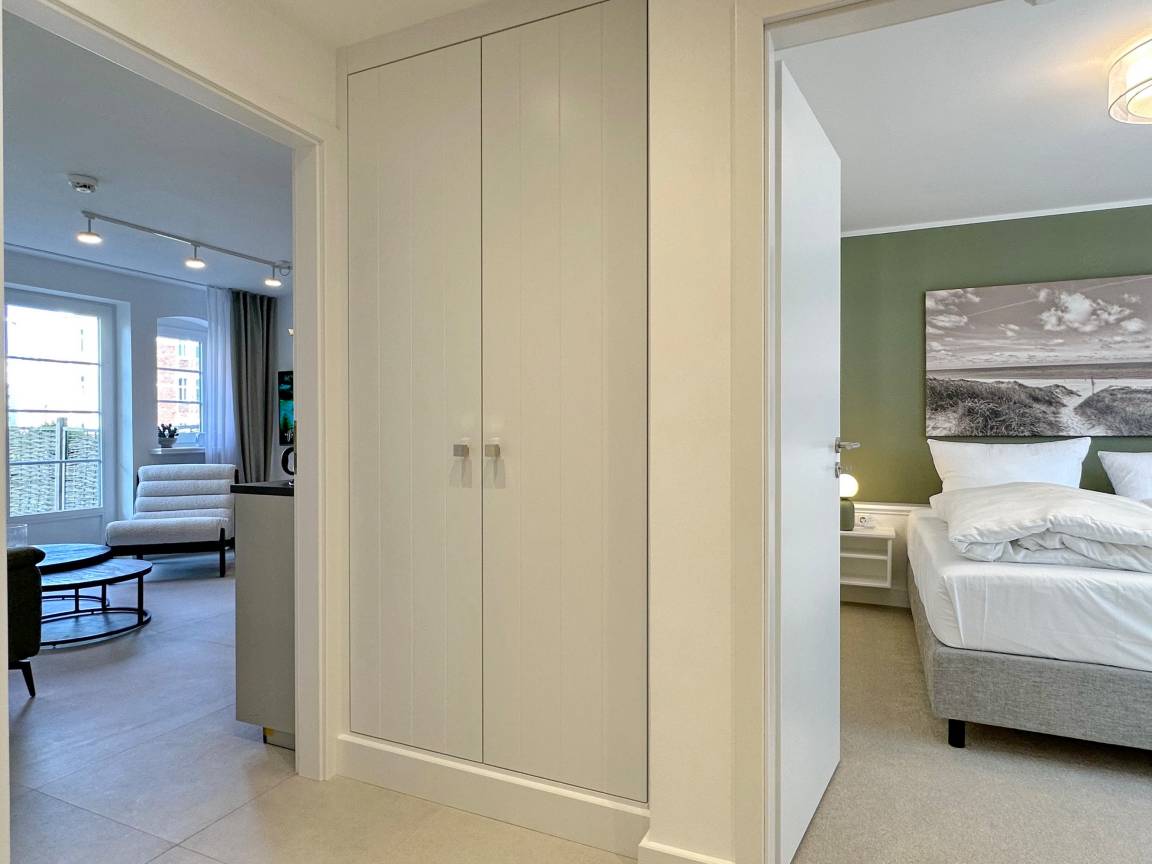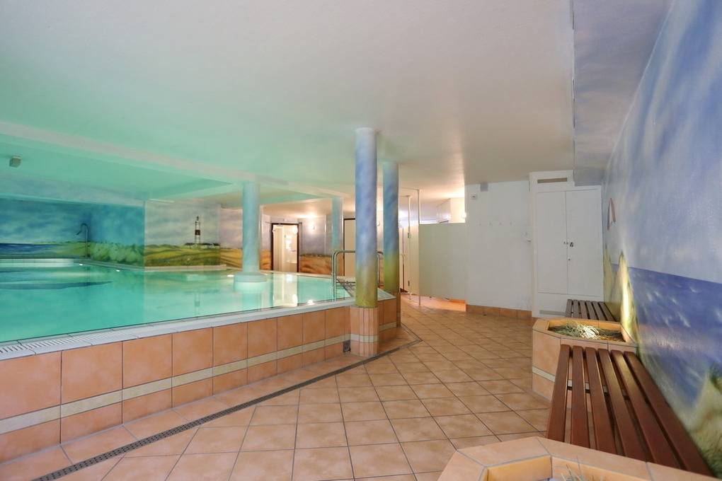 Die Wohnanlage "Olympia" bietet eine zentrale Lage in kurzer Entfernung zur Promenade, dem Badestrand und dem Meer. Auch die Fußgängerzone ist nur wenige Gehminuten entfernt. Die 2-Zimmer-Wohnung wurde im Jahr 2025 renoviert und ist für 2 Personen geeignet. Sie hat eine Größe von ca. 43 m² und besteht aus einem Wohn- und Esszimmer mit Couchecke, Essplatz und integrierter Küche. Die Küche ist mit einem Induktionskochfeld, einem Geschirrspüler und einer Mikrowelle mit Grillfunktion ausgestattet. Vom Wohnzimmer aus gelangt man auf die geschützte und möblierte Südterrasse. Im Schlafzimmer befindet sich ein Box-Spring-Doppelbett, Einbauschränke und ein weiterer Flat-TV. Das moderne Duschbad verfügt über ein Fenster. Im Dielenbereich befinden sich Einbauschränke und eine Garderobe für Jacken und andere Dinge. WLAN steht zur Verfügung, jedoch ohne Gewähr. Das Mitbringen von Haustieren und das Rauchen sind nicht gestattet. Bei Anreise sind Bettwäsche und Handtücher bereits aufgezogen. Die Wohnanlage verfügt über einen Schwimmbad- und Saunabereich sowie einen zusätzlichen Wellnessbereich mit finnischer Sauna, Dampfsauna und Ruhebereich. Fahrzeuge können gegen Gebühr und vorheriger Anmeldung in der Tiefgarage abgestellt werden. Eine Waschmaschine und ein Trockner stehen kostenfrei zur Verfügung. Für Fahrräder gibt es einen Abstellbereich in der Garage
