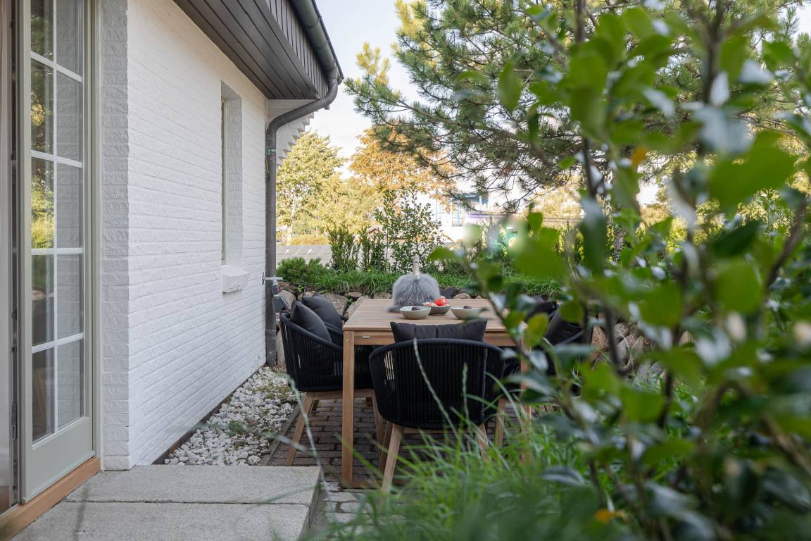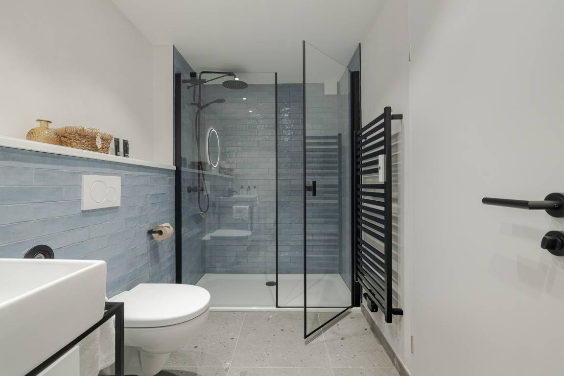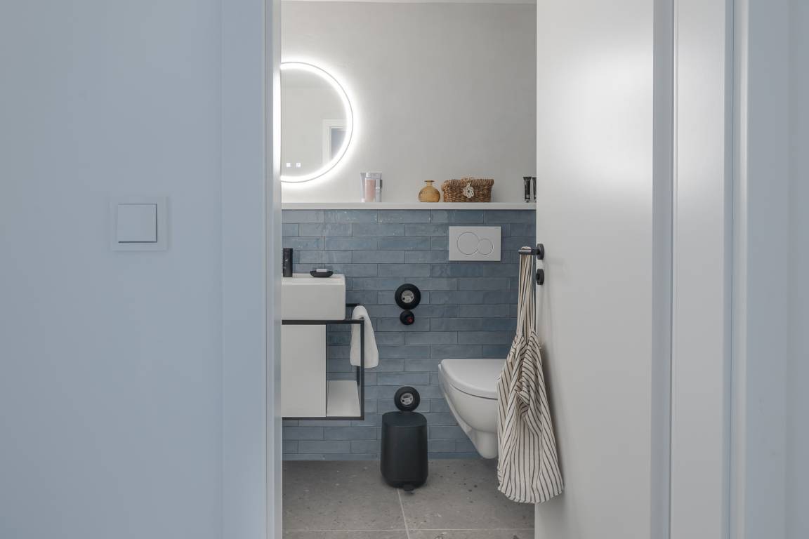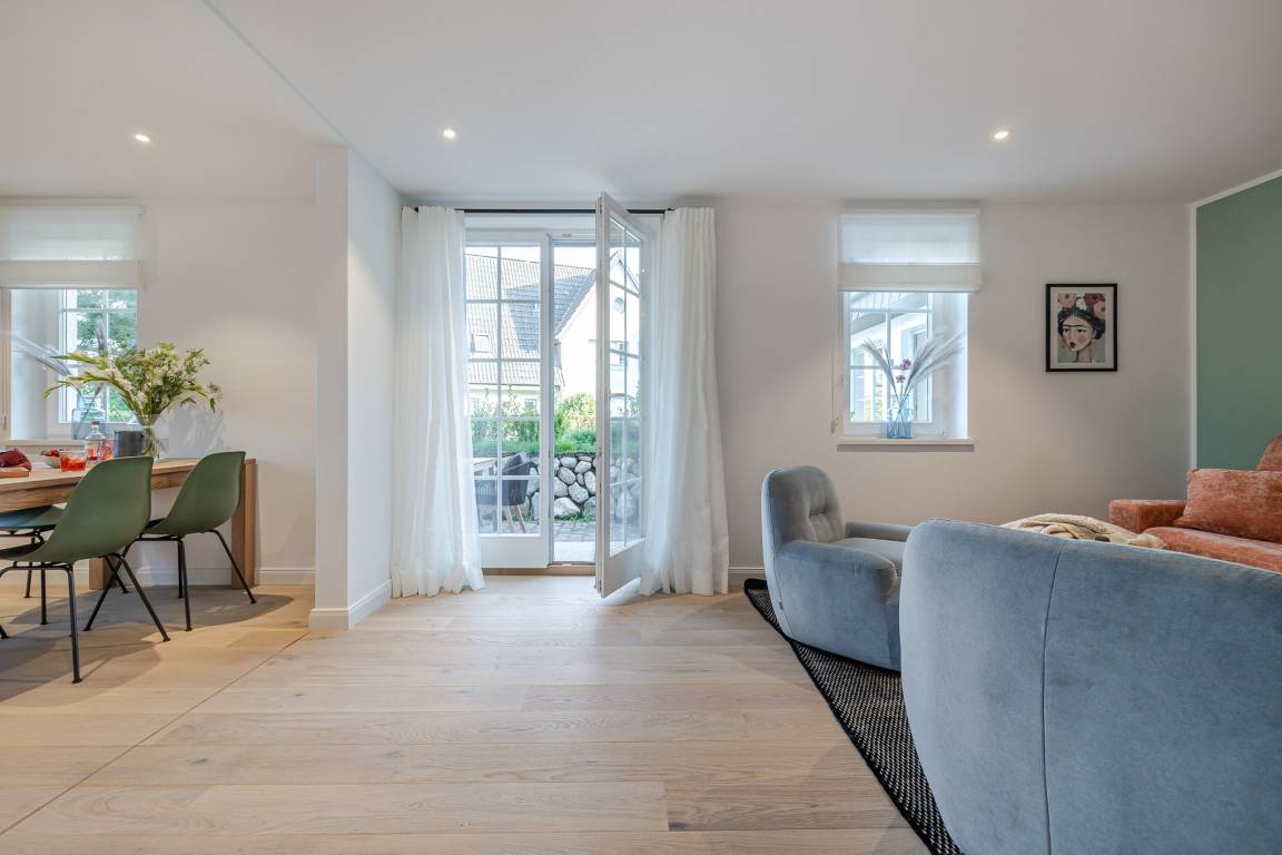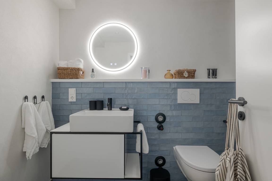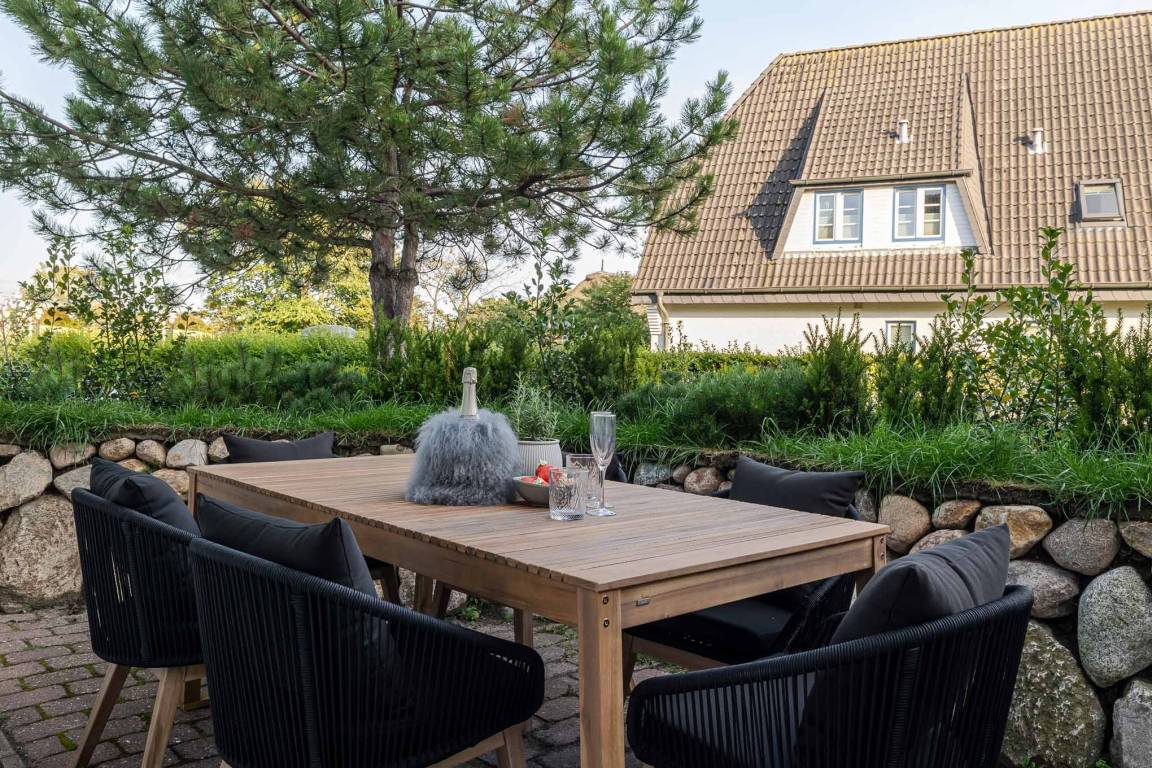 Das Badezimmer überzeugt mit maritimem Farbkonzept, Regendusche und Fußbodenheizung – Ihre private kleine Wellness-Oase, auch an kühleren Tagen. Zur Wohnung gehört eine eigene Terrasse mit modernen Loungemöbeln (Mai–Oktober). Ob Frühstück in der Sonne oder ein Glas Wein am Abend – hier lässt es sich wunderbar entspannen, je nach Wind sogar mit leisem Meeresrauschen.