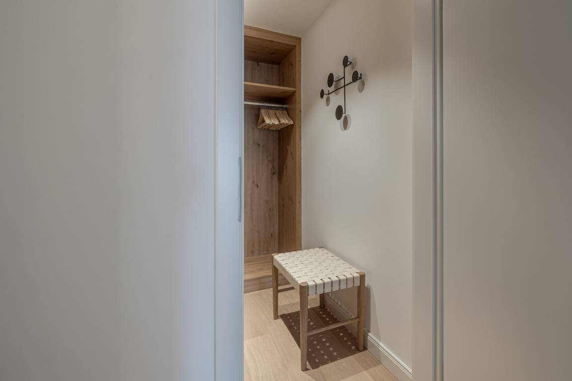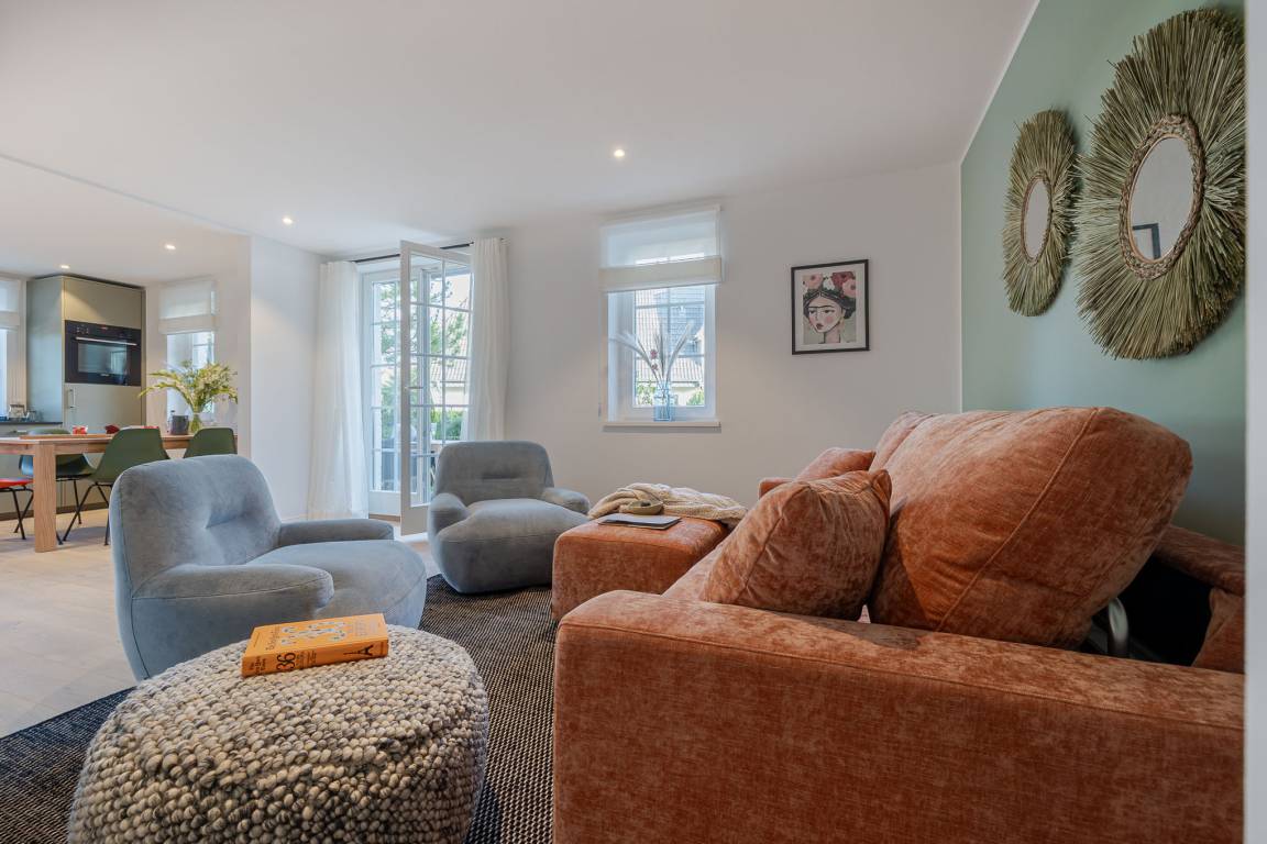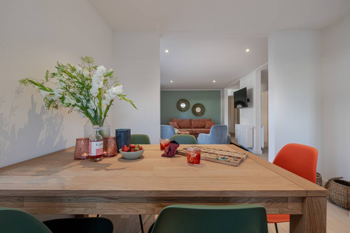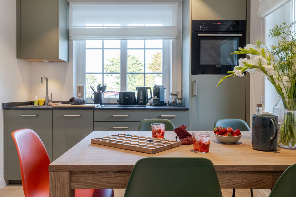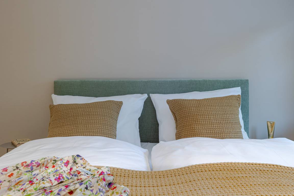 Zwei Schlafzimmer sind jeweils mit komfortablen Boxspringbetten und maßgefertigten Einbauschränken ausgestattet. Im großzügigen Wohn- und Essbereich befindet sich ein vollwertiges Schlafsofa für zwei weitere Gäste sowie eine moderne, hochwertig ausgestattete Küche mit Markengeräten (u. a. Miele) und allem, was man auch von zuhause kennt.