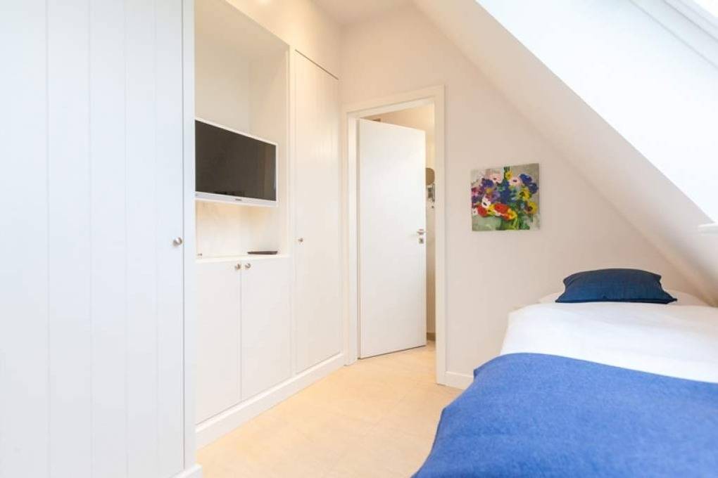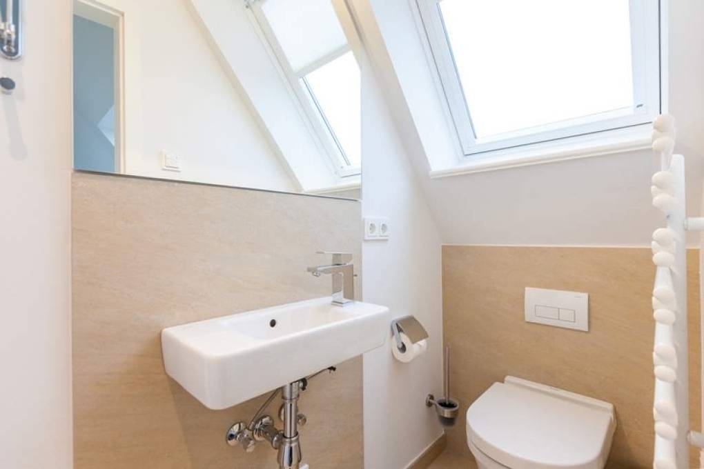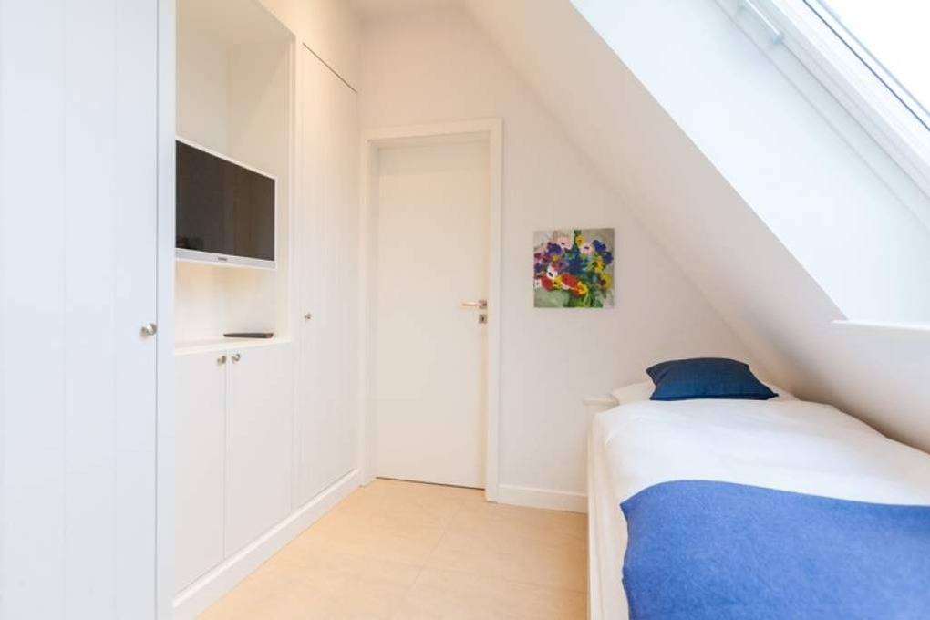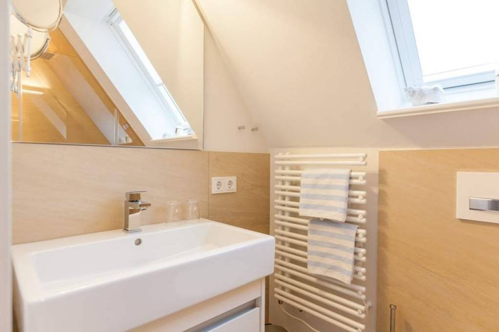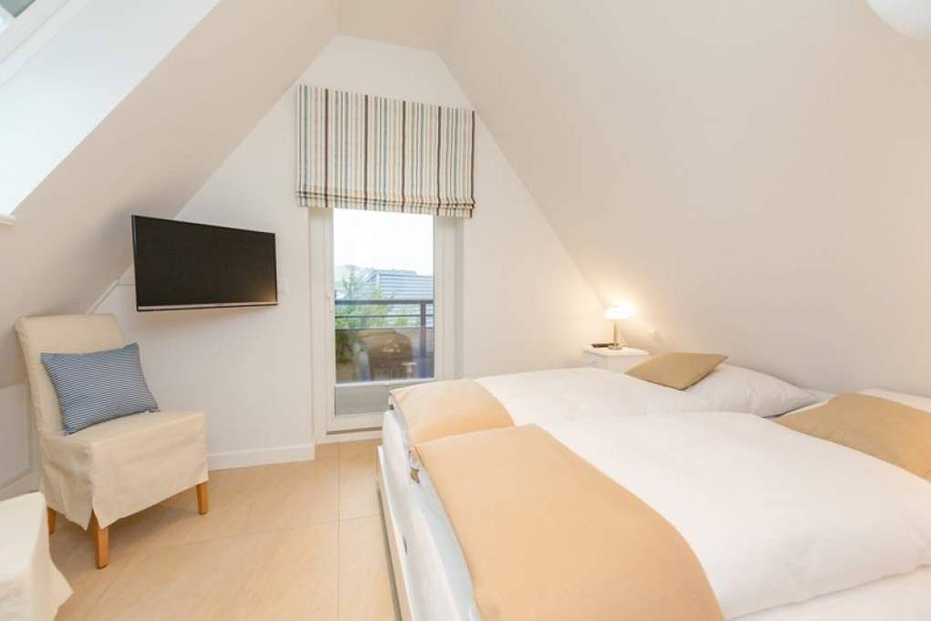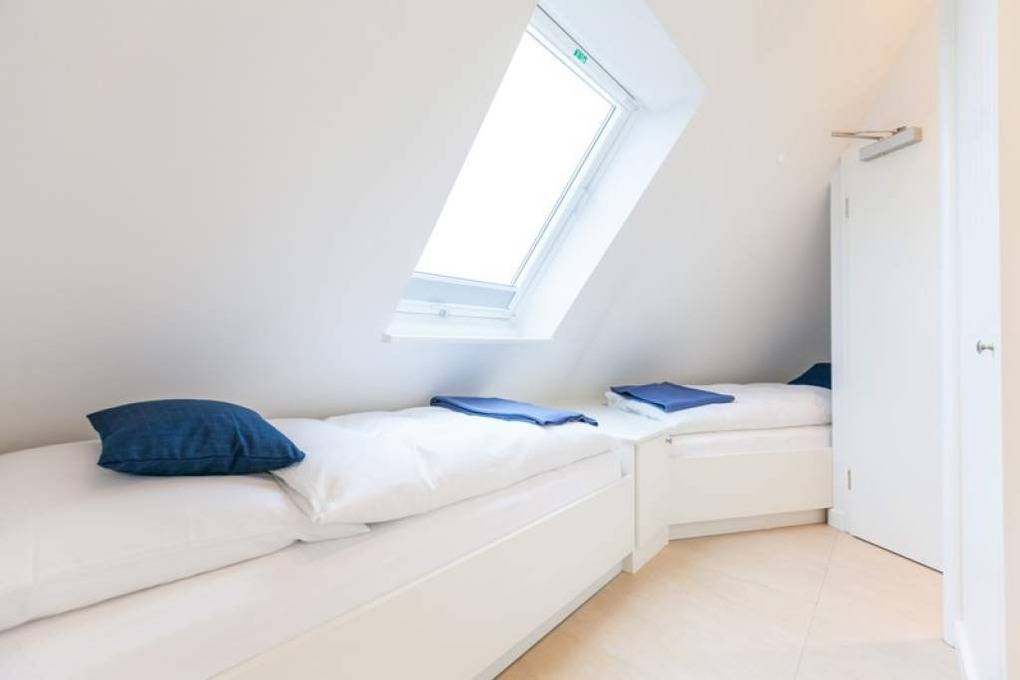 Ebenfalls im DG befindet sich ein Zweibett-Schlafzimmer mit Einzelbetten (je 0,90 x 2,00 m) und WC/Waschtisch „en Suite".