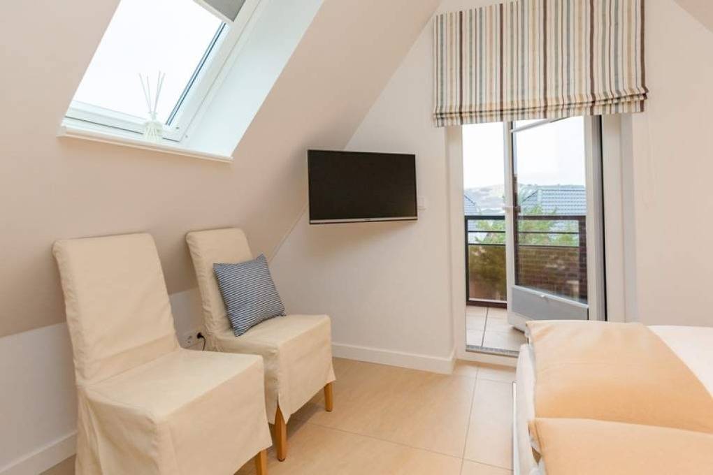 Luxuriöse 3-Zimmer-Maisonette-Nichtraucher-Ferienwohnung, ca. 75 qm, im 1. Obergeschoss, Südost- und Südwestloggia mit Strandkorb für 4 Personen.